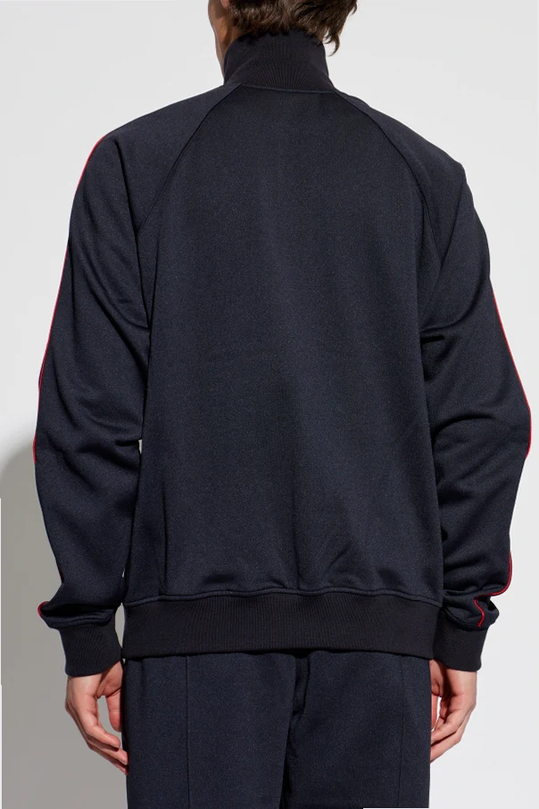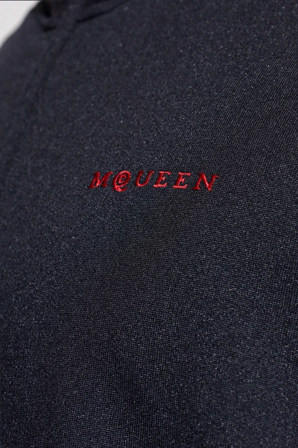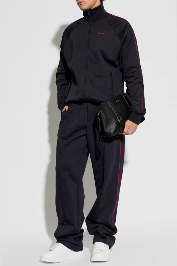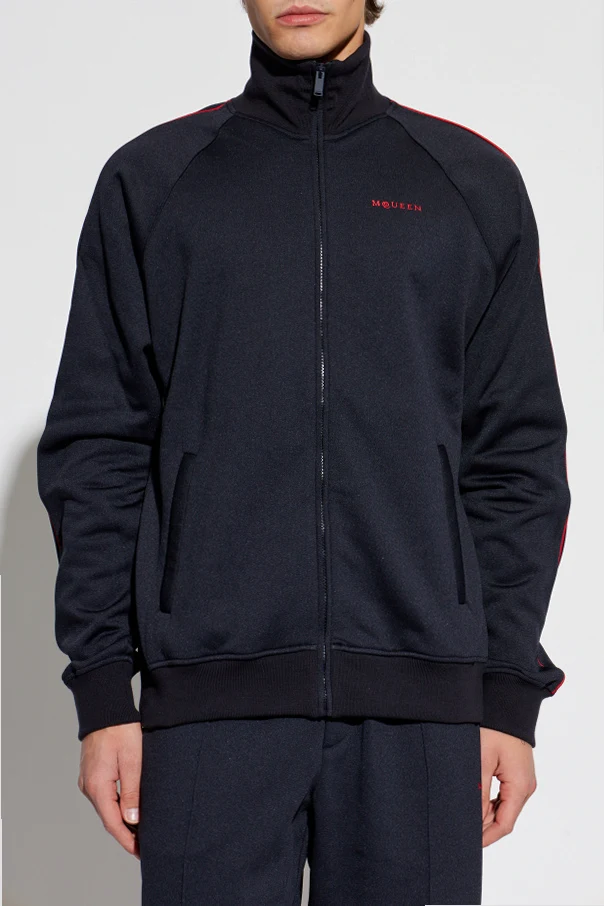 Die Jacke mit Stehkragen von Alexander McQueen verkörpert die Essenz moderner Eleganz im sportlichen Stil. Das Modell zeichnet sich durch den klassischen Zip-up-Schnitt und einen modernen, enganliegenden Stehkragen aus, der den raffinierten, jedoch legeren Charakter des Designs unterstreicht. Der marineblaue Farbton wird durch dezente, rote Paspeln entlang der Ärmel durchbrochen – dieses Detail zeugt von künstlerischer Liebe zum Detail.