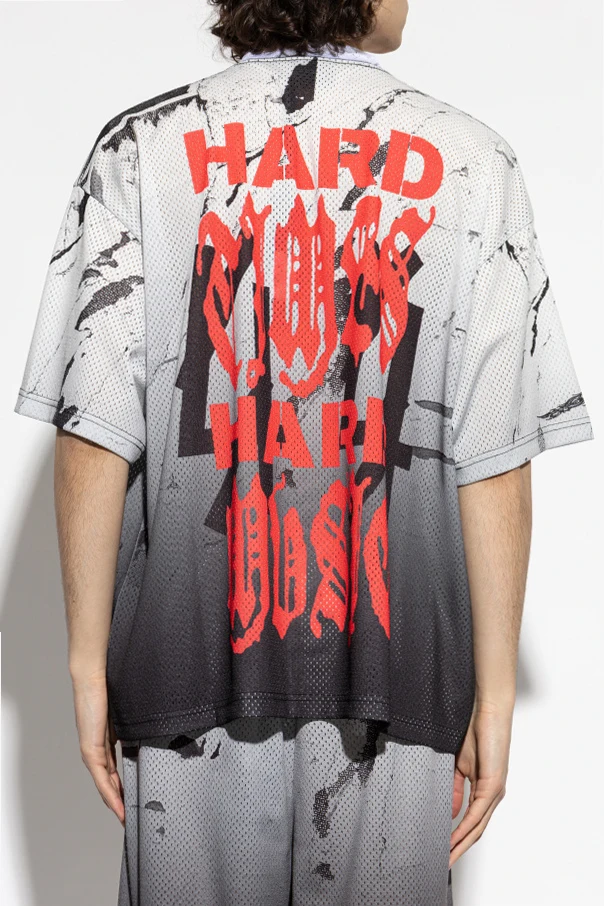 Auf der Vorderseite sticht ein großes, gotisches Print in Rot hervor, während auf dem Rücken der eindrückliche Schriftzug „HARD TIMES HARD NOISE“ erscheint. Das dezent platzierte Designer-Logo unterstreicht den exklusiven Charakter dieses Produkts. Die Leichtigkeit und Atmungsaktivität des Stoffs garantieren täglichen Komfort.