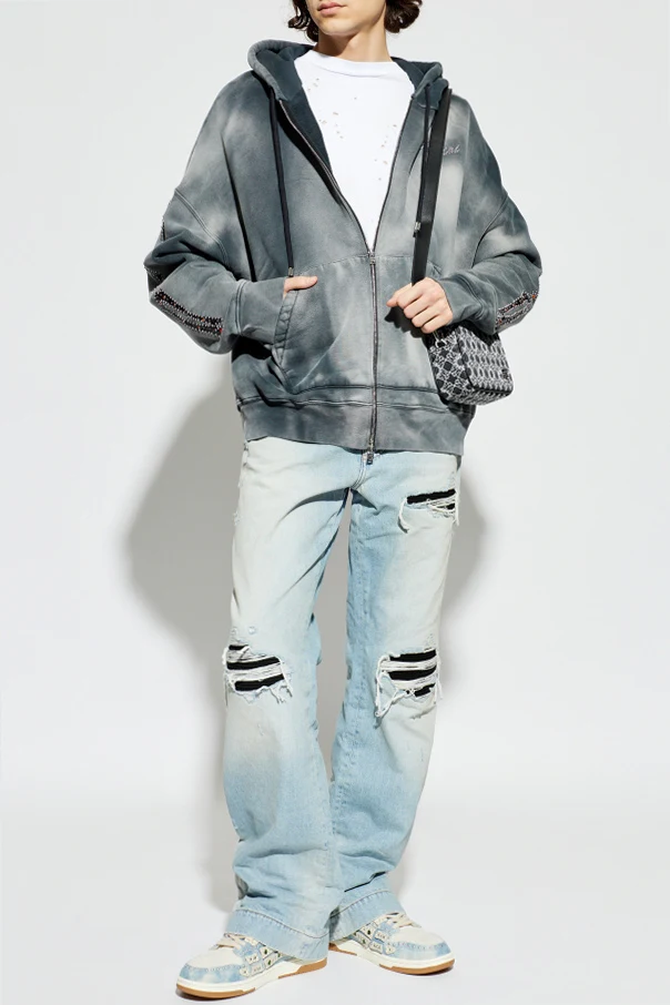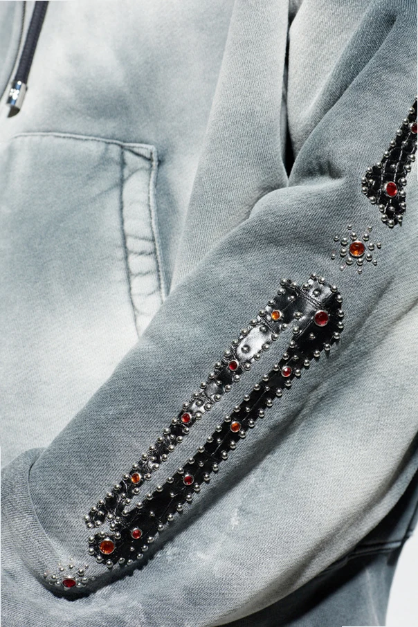 Hoodie mit schimmernden Applikationen von Amiri ist ein Juwel der exklusiven Herrenmode und vereint höchsten Tragekomfort mit raffinierter Eleganz . Der oversized Schnitt mit überschnittener Schulterlinie und langen Ärmeln sorgt für Bewegungsfreiheit und unterstreicht den modernen Charakter der Silhouette. Das eindrucksvolle graue Ombre, inspiriert vom Vintage-Stil, harmoniert ästhetisch mit der klassischen, großzügigen Kapuze und dem durchgehenden Reißverschluss.