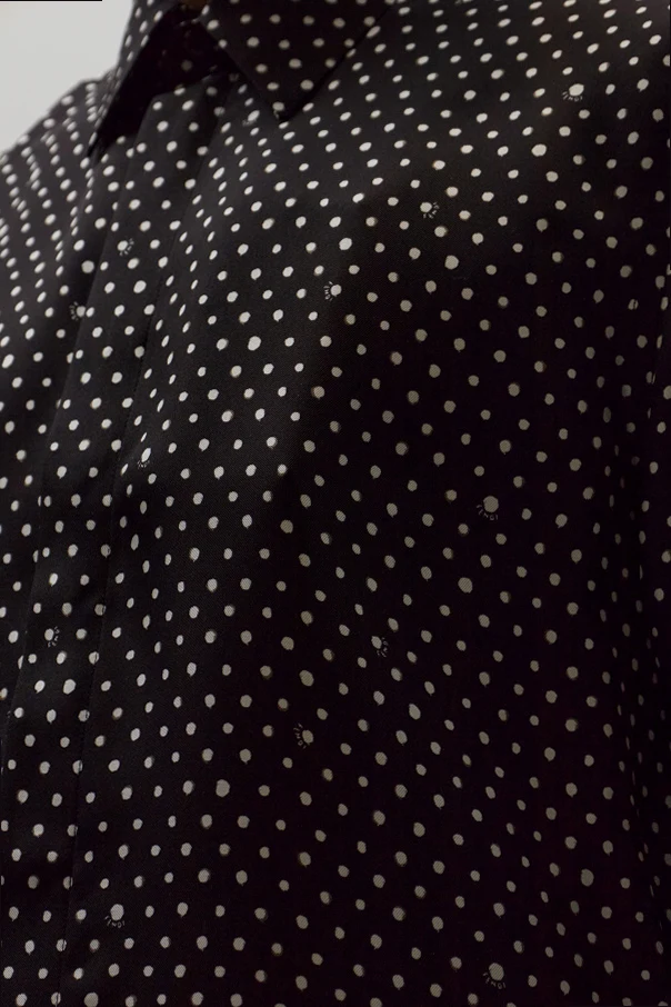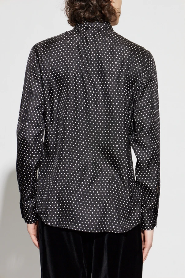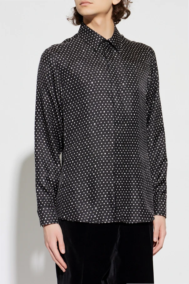Das regelmäßige Muster aus weißen Punkten auf tief schwarzem Hintergrund verleiht dem Ganzen einen zugleich ausdrucksstarken und kultivierten Charakter. Ästhetisch unter einer Leiste versteckte Knöpfe und der leicht verstärkte Kragen sind Details, die die sorgfältige Handschrift des Designers unterstreichen und die Einzigartigkeit sowie die Raffinesse dieses Modells betonen.