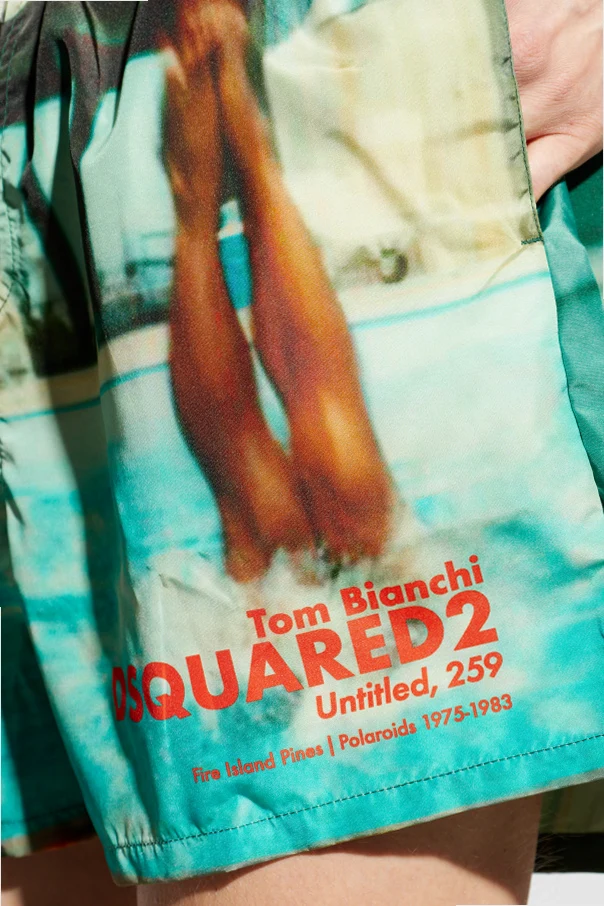 Das Augenmerk liegt auf einem besonderen Detail – dem markanten roten Schriftzug „Tom Bianchi DSQUARED2 Untitled, 259 Fire Island“ am linken Bein, der die Zugehörigkeit zur exklusiven Kollektion unterstreicht.