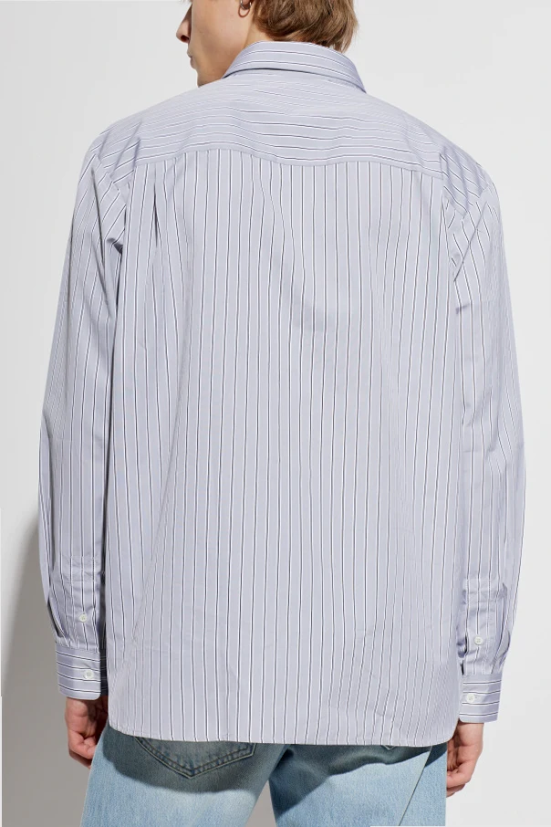 Der blaue Stoff ist mit einem vertikalen Muster aus schmalen, schwarz-weißen Streifen verziert, was dem Hemd einen formellen und zugleich besonders edlen Charakter verleiht. Dezente, weiße Knöpfe und ein abgerundeter Saum zeugen von besonderer Liebe zum Detail. Das Gesamtbild wird durch eine subtile Brusttasche auf der linken Seite abgerundet, die sich perfekt in die harmonische Komposition einfügt.