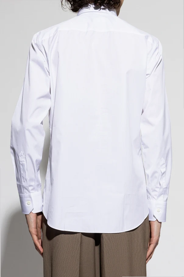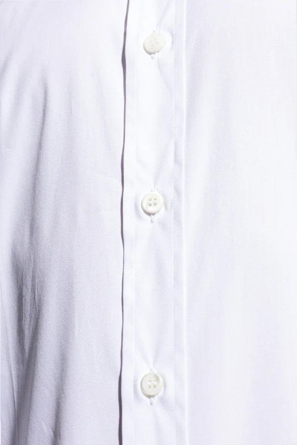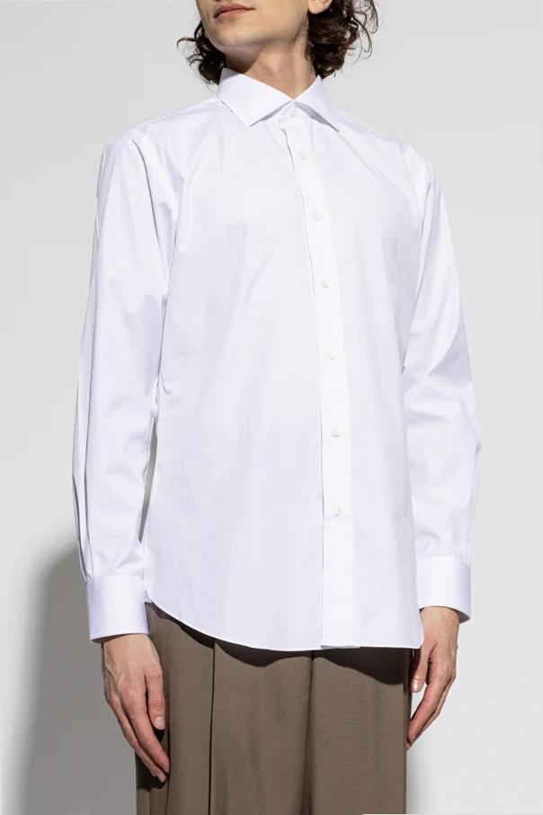 Es zeichnet sich durch eine einheitliche, schneeweiße Farbe sowie ein schlichtes Design ohne Verzierungen aus. Die langen Ärmel enden in breiten Manschetten und der sorgfältig gearbeitete Kragen vervollständigt das harmonische Gesamtbild. Eine Reihe klassischer weißer Knöpfe unterstreicht den exquisiten Charakter des Hemdes.