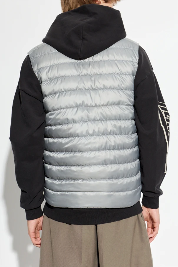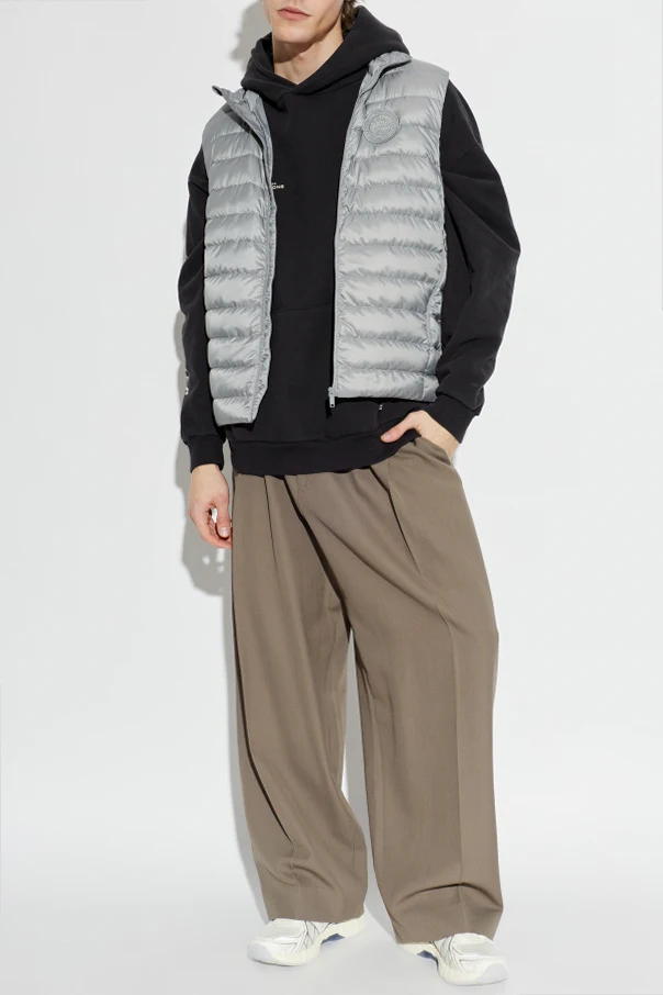 Der praktische Stehkragen schützt den Hals vor Kälte, während der verdeckte Reißverschluss die harmonische Schlichtheit der Form bewahrt. Ein rundes Patch mit geprägtem Designer-Logo, ebenfalls in Grau , akzentuiert dezent den luxuriösen Charakter dieser Weste.