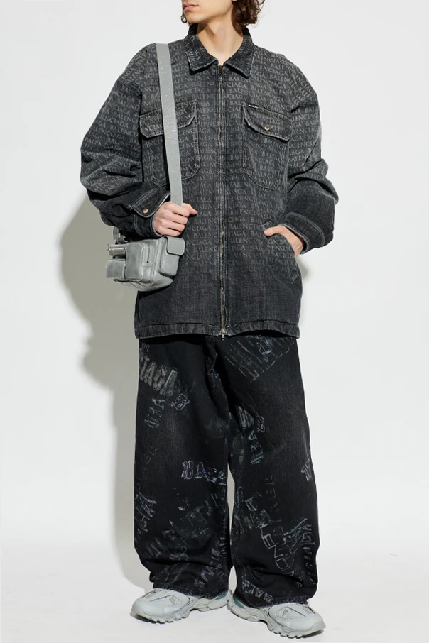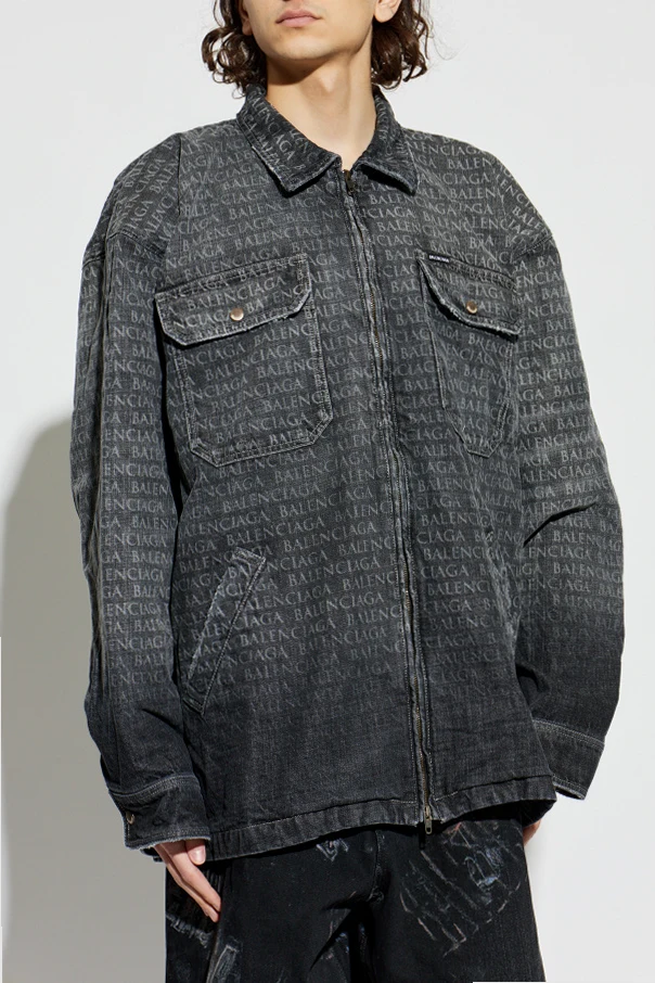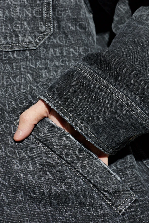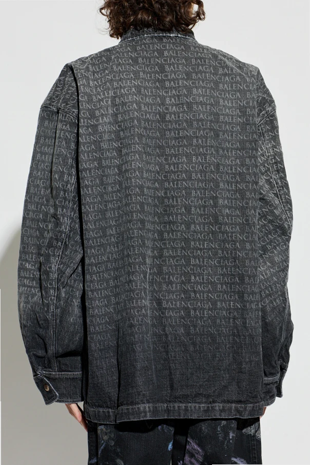 Jeansjacke mit Monogramm von Balenciaga strahlt raffinierte Eleganz aus und vereint modernes Design mit traditioneller Handwerkskunst. Gefertigt aus sorgfältig ausgewählter, grauer Baumwolle, besticht sie durch die einheitliche, dezent gewaschene Denim-Struktur, die mit einem sich wiederholenden Monogramm – dem berühmten Markenlogo – veredelt ist, welches die gesamte Materialoberfläche gleichmäßig ziert.