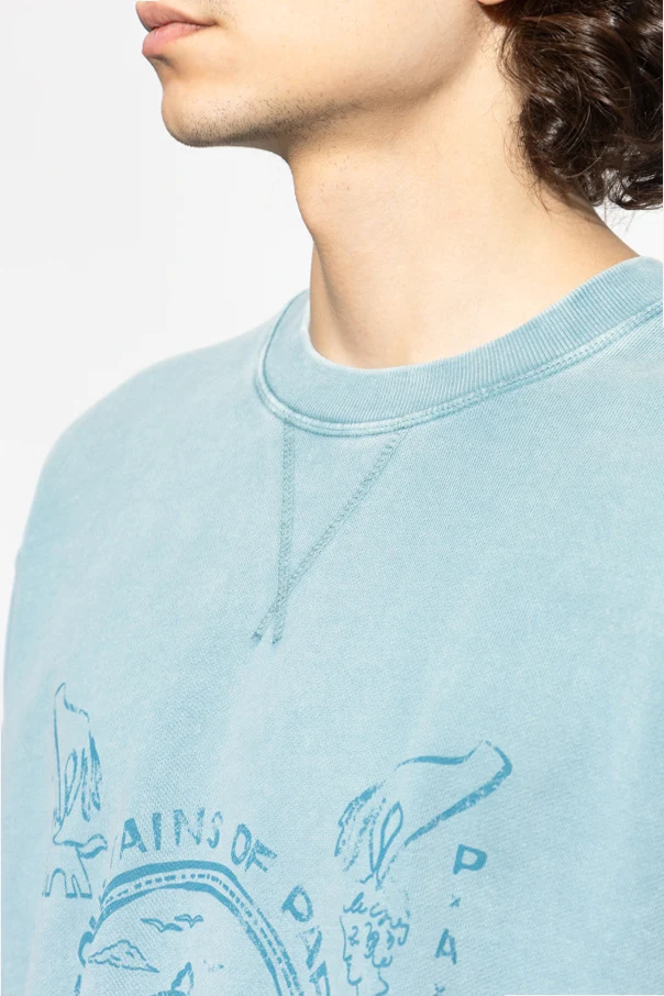 Auf der Vorderseite des Sweatshirts erstreckt sich ein großer Print, der einen Springbrunnen, stilisierte Hände und faszinierende Grafiken umgeben von Schriftzügen zeigt. Dekorative „V“-Naht unter dem Ausschnitt sowie breite Bündchen vervollständigen das Design und verleihen ihm einen durchdachten Detaillierungsgrad. Die Rückseite des Sweatshirts bleibt glatt und betont damit die edle Verarbeitung.