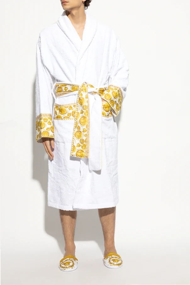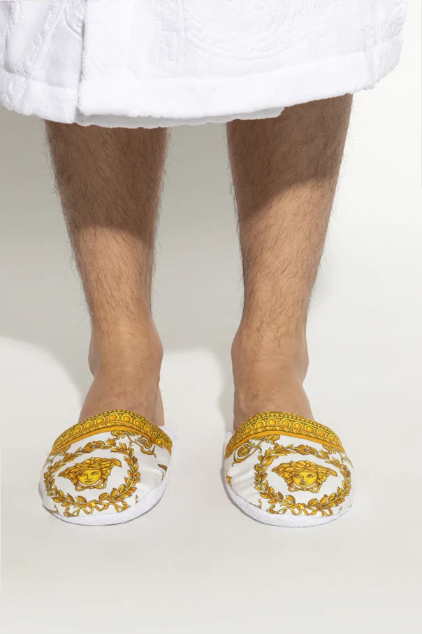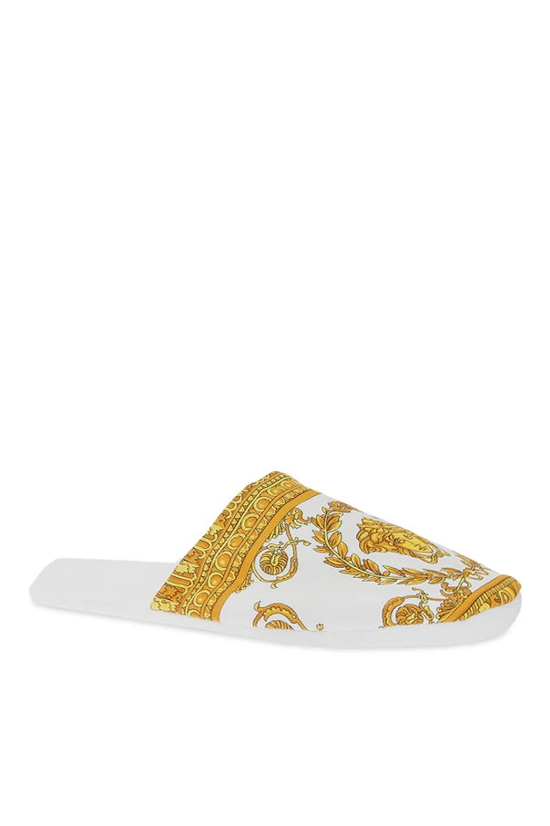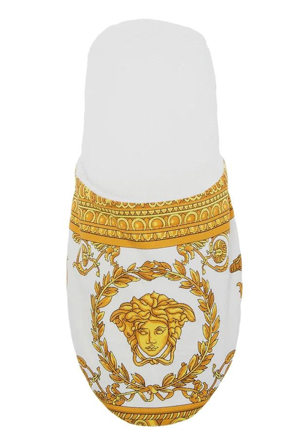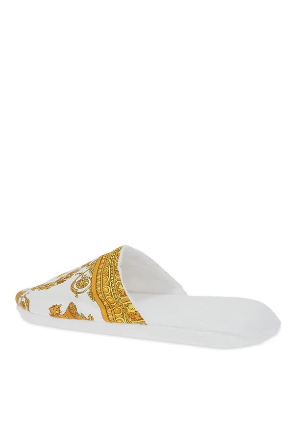 White slides from Versace Home. Crafted from cotton, this item features the iconic Baroque print in gold-tone.
