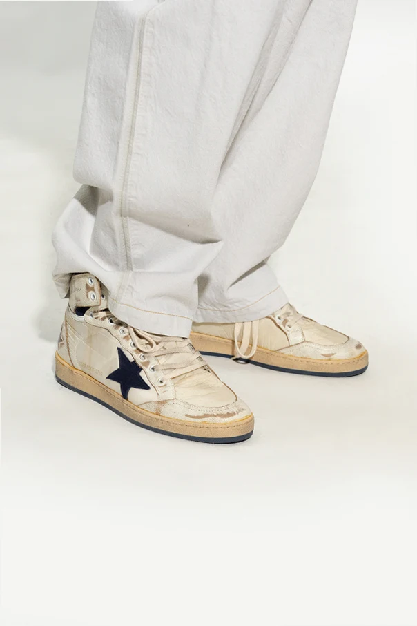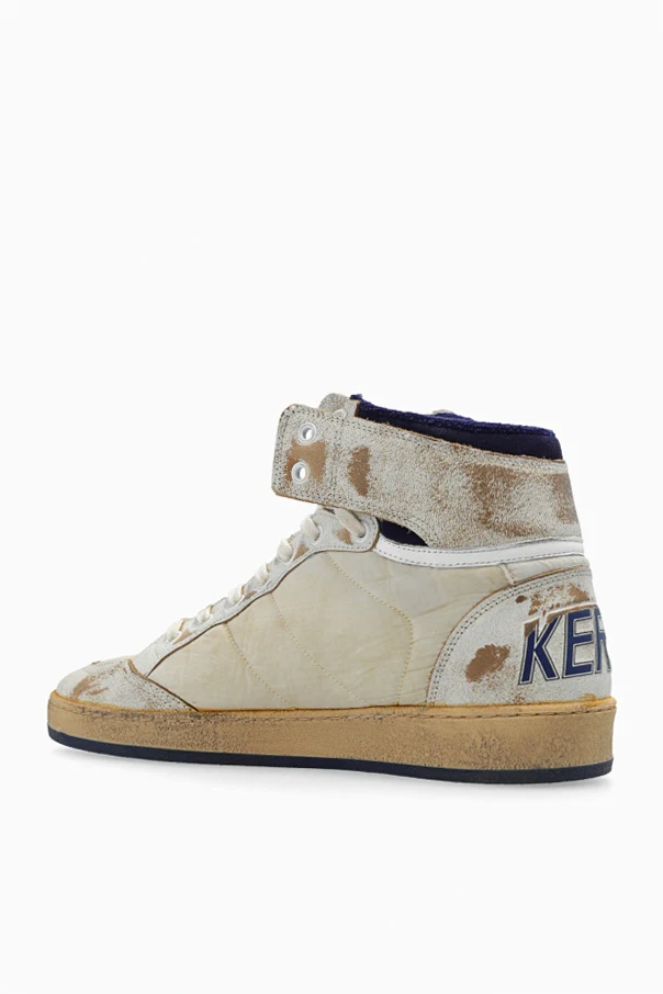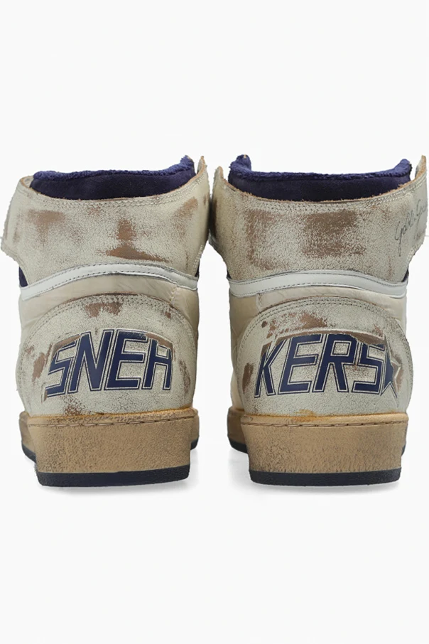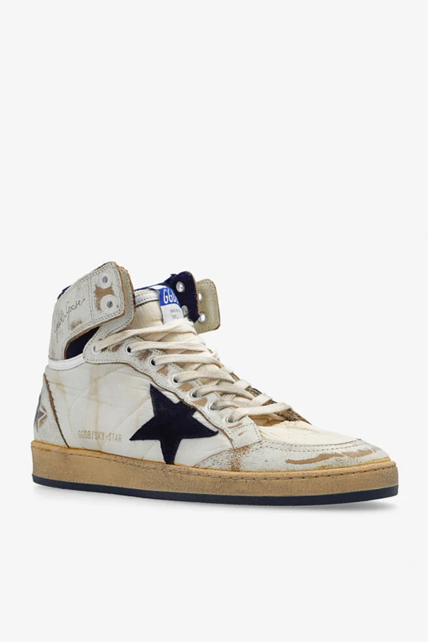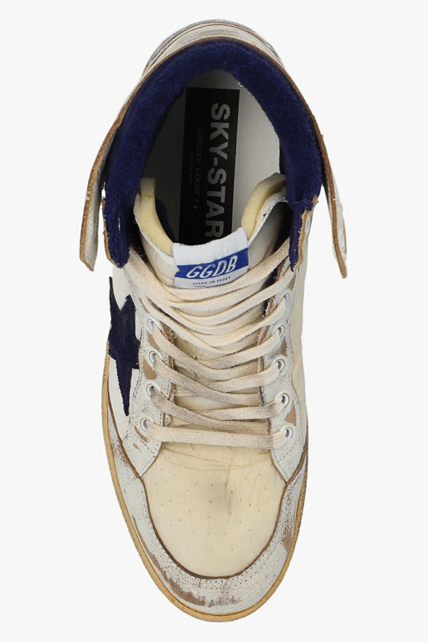 Cream, beige and navy blue ‘Sky Star’ high-top sneakers from Golden Goose. Made of fabric and leather with a vintage effect, this lace-up model sits on a beige and navy blue rubber sole and showcases a raw-trimmed tongue, logo detailing and a signature star-shaped patch.