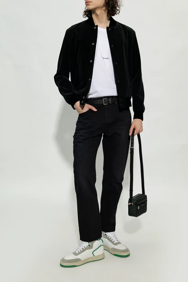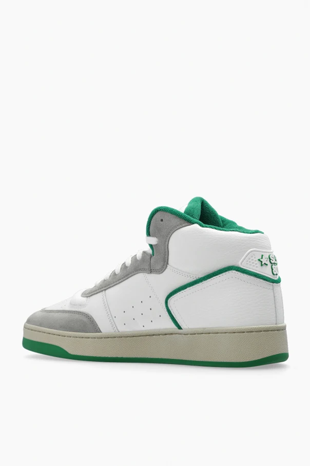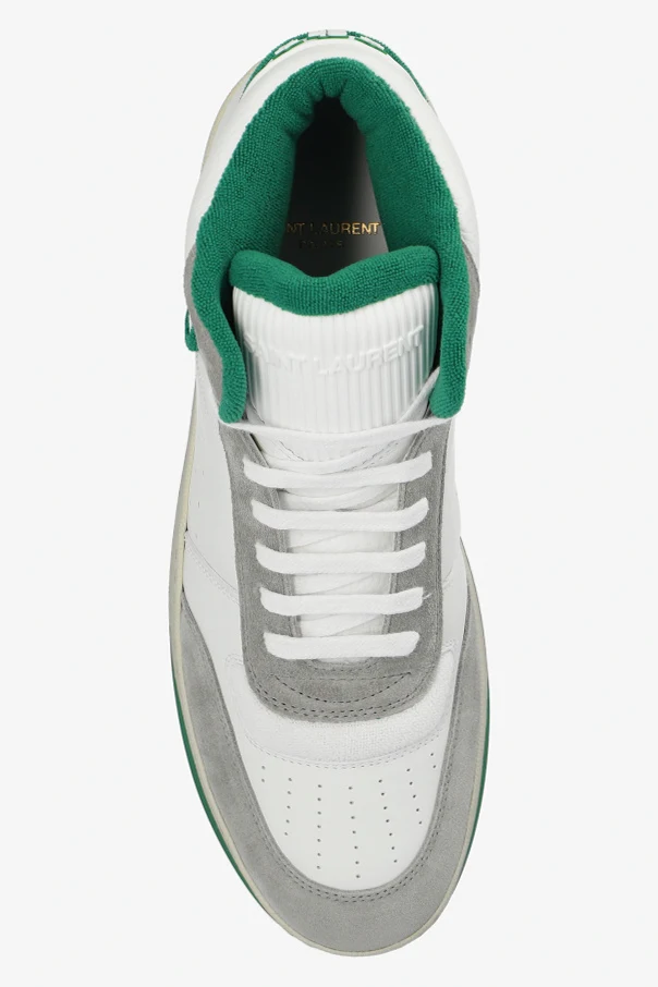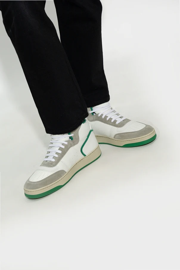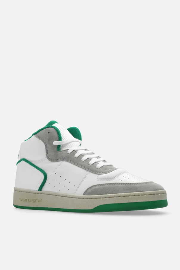 White, grey and green ‘SL/80’ high-top sneakers from Saint Laurent. Made of leather trimmed with fabric, this lace-up pair features perforations, a logo detail and rubber sole in beige and green.
