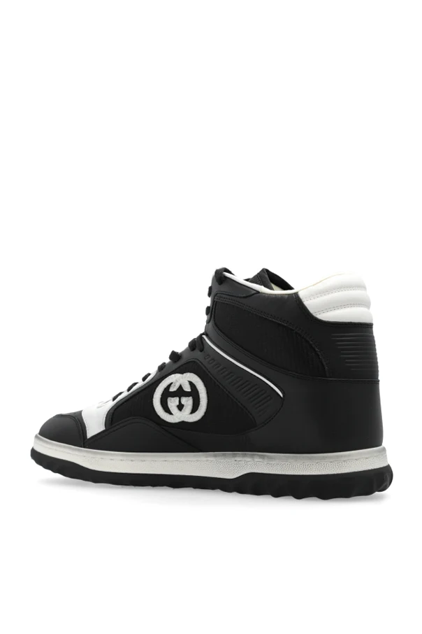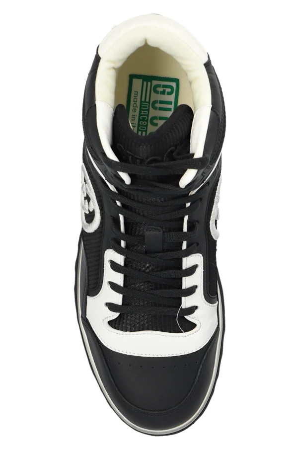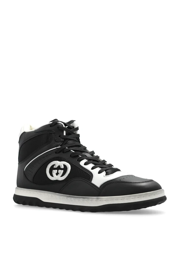 Black and white ‘MAC80’ high-top sneakers from Gucci. Made from leather and fabric, this lace-up model sits on a black and white rubber sole and showcases an embroidered logo on the sides, dirt effects and a perforated front.