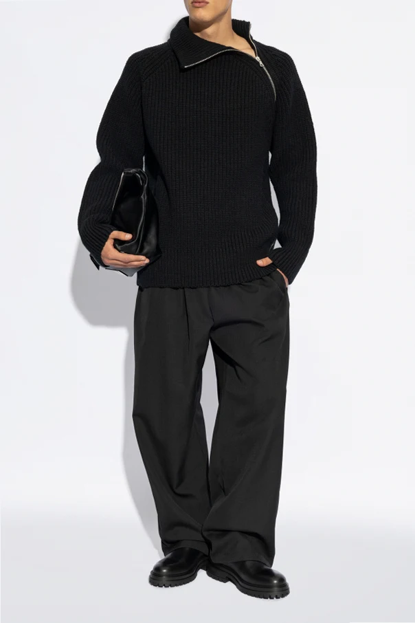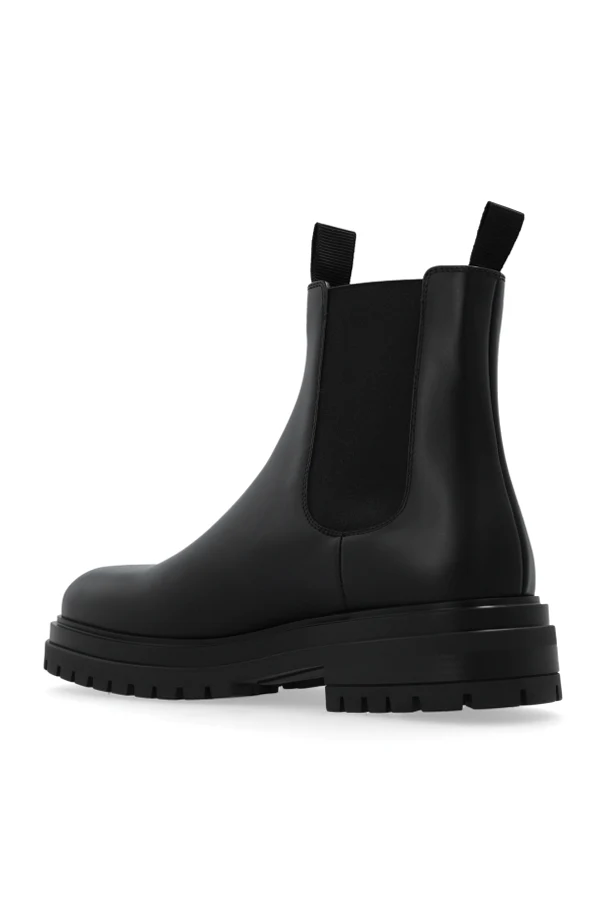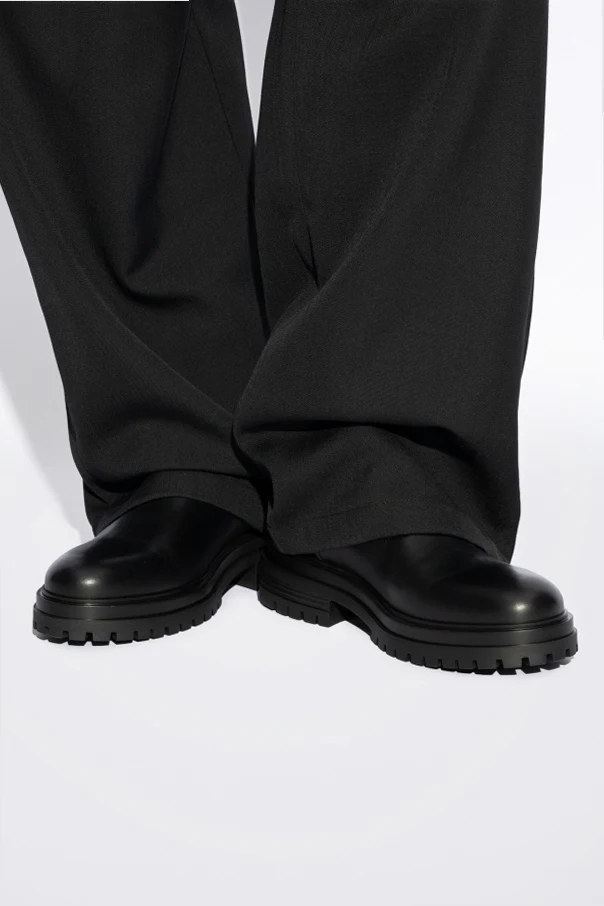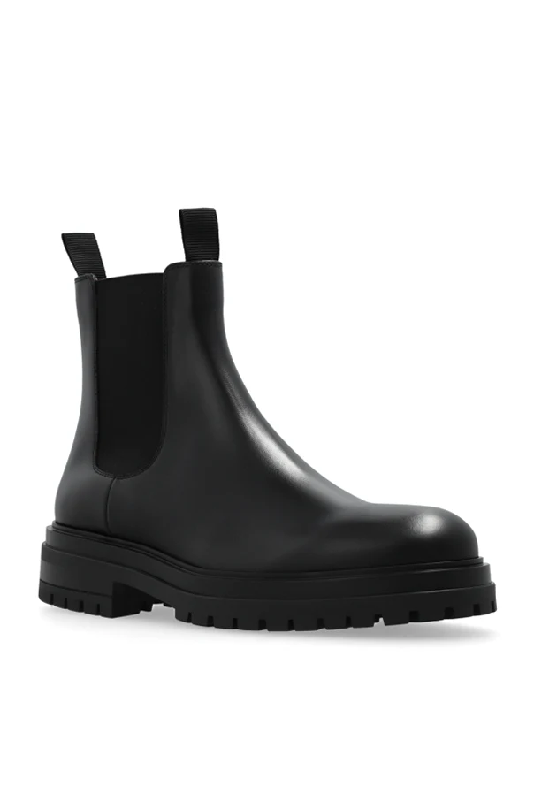 Die dicke Gummisohle mit markantem Profil sorgt für hervorragende Haftung und Komfort beim Tragen. Die einheitliche schwarze Farbe macht diese Stiefeletten zu einer vielseitigen Wahl, die zu verschiedenen Outfits passt – sowohl formell als auch casual. Das Innenleben der Schuhe ist mit großer Sorgfalt verarbeitet und zeigt eine sichtbare Schrift, die das Designerlogo sein könnte.