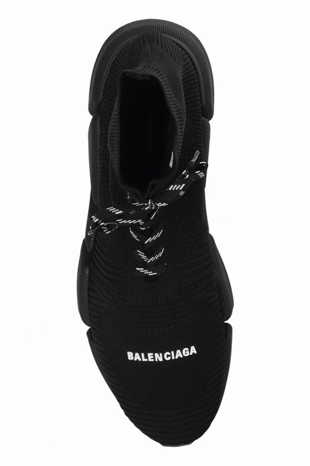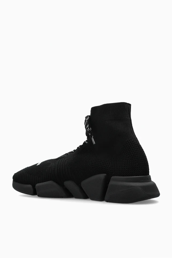 Der hohe sockenähnliche Schaft umhüllt subtil das Bein und betont den innovativen Schnitt. Die dicke, segmentierte Sohle mit futuristischem Design garantiert Komfort und außergewöhnliche Dämpfung. Auf der Vorderseite des Schuhs befindet sich der dezente Schriftzug "BALENCIAGA", und die Schnürsenkel sind mit einem charakteristischen Muster verziert, das Eleganz hinzufügt.