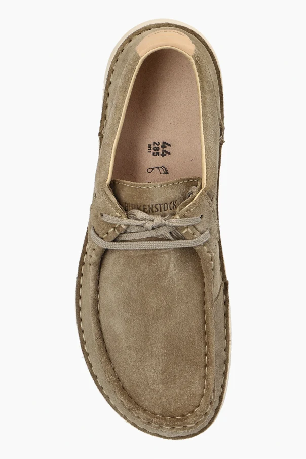 Wir präsentieren Ihnen exklusive Herren-Schnürschuhe mit dem Namen " Pasadena ", die Teil der außergewöhnlichen Schuhkollektion der Marke Birkenstock sind. Die klassische, niedrige Silhouette der Schuhe, gefertigt aus hochwertigem Wildleder, besticht durch die beige Farbe, die sanft mit den helleren Akzenten an der Ferse kontrastiert.