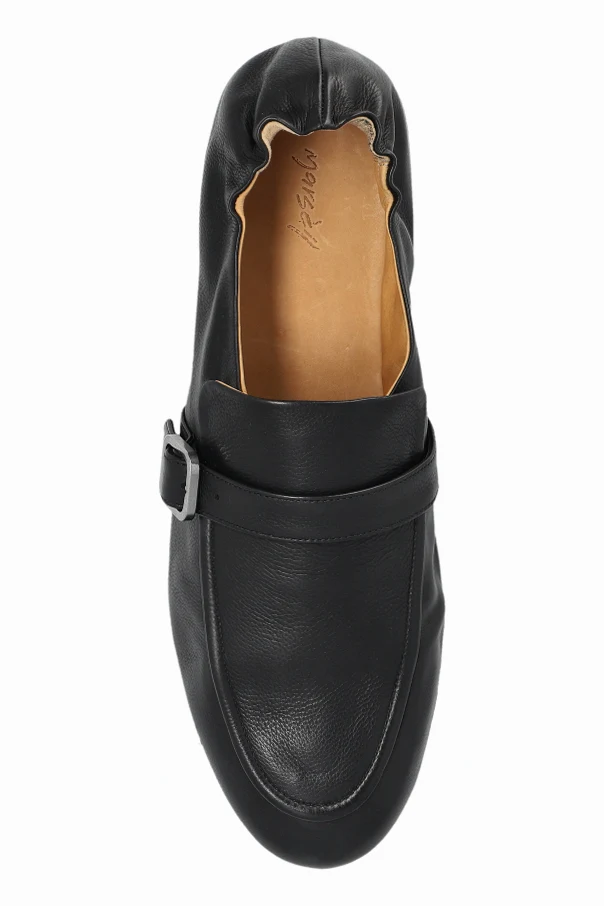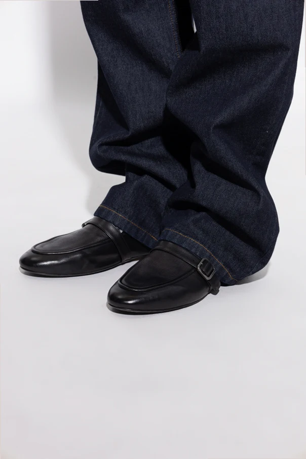 Die Schuhe zeichnen sich durch ein klassisches Design mit abgerundeter Spitze und einer flachen Sohle aus, was ihnen einen zeitlosen Stil verleiht. Der dekorative Riemen mit Schnalle unterstreicht dezent ihren einzigartigen Charakter. Das Innere der Schuhe ist mit hellbraunem Leder ausgekleidet, das einen hohen Komfort bietet.