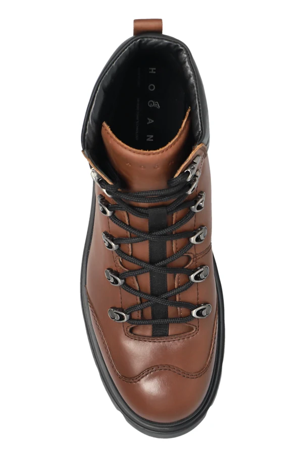 Leder-Knöchelstiefel der Marke Hogan verkörpern die perfekte Verbindung von Robustheit und raffinierter Ästhetik. Die zeitlose Silhouette wurde durch einen sorgfältig geformten Schaft aus hochwertigem Glattleder ergänzt, der einen Kontrast zu den schwarzen, gesteppten Akzenten rund um den Knöchel bildet. Die massive, profilierte Gummisohle garantiert Trittsicherheit bei jedem Schritt, während die dezent abgerundete Zehenpartie den Charakter des Modells unterstreicht.