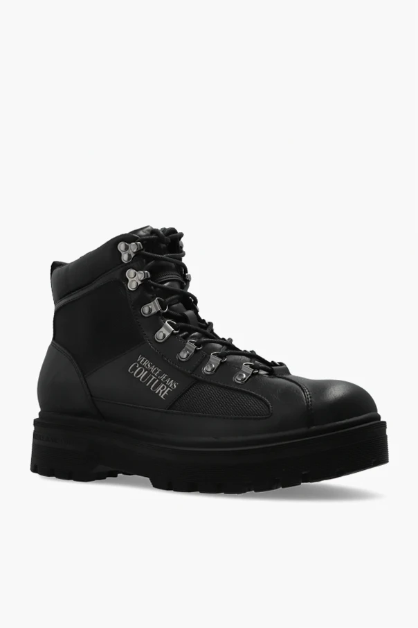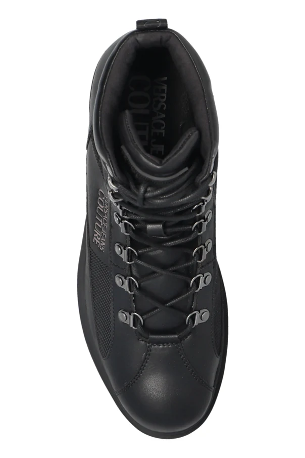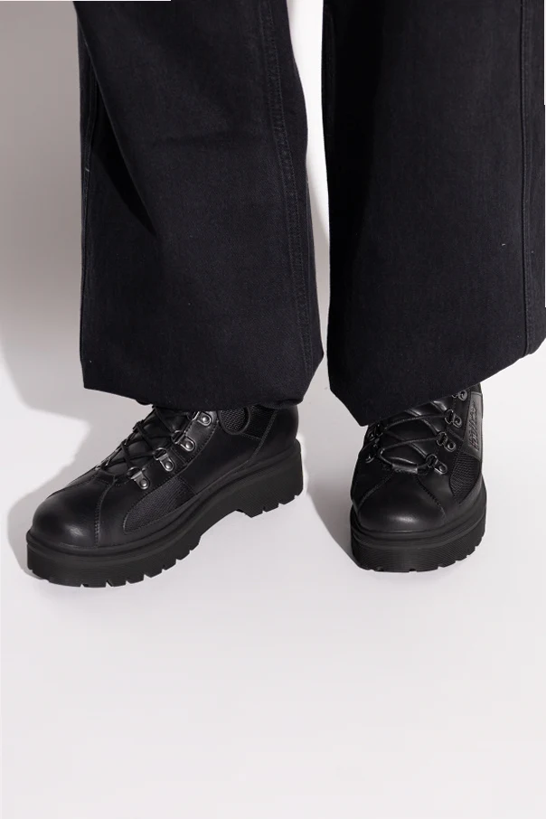 Entdecken Sie außergewöhnliche Stiefeletten mit aufgedrucktem Logo , die kompromisslose Eleganz und zeitgenössischen Charakter verkörpern. Diese Schuhe zeichnen sich durch eine klassische, massige Lace-up-Silhouette aus, die über den Knöchel reicht, wobei die robuste, klar profilierte Sohle mit Trekking-Profil modisches Design mit Funktionalität verbindet.
