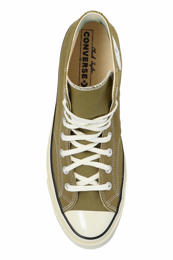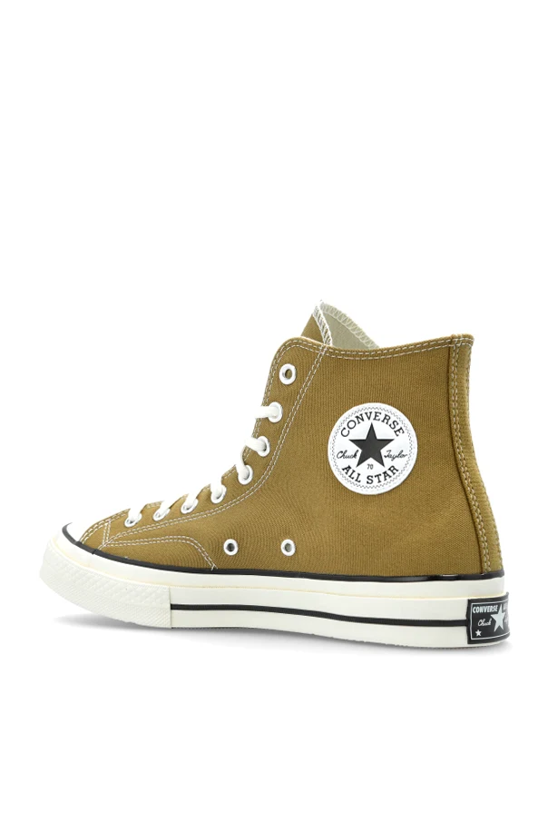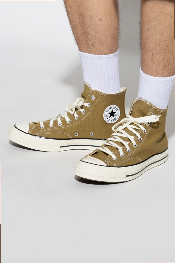 Die vorgestellten Sportschuhe ‘Chuck 70 Hi’ der Marke Converse sind ein Symbol für Designkunst, das die klassische Form von High-Top-Sneakern mit moderner Eleganz verbindet. Der hohe Schaft aus glattem, sorgfältig gewebtem Canvas in einem dezenten olivgrünen Farbton begeistert durch ein einzigartiges Gewebe und eine harmonische Textur. Der prestigeträchtige Charakter wird durch den runden „CONVERSE ALL STAR“ Aufnäher mit Stern unterstrichen, der ein unverzichtbares Attribut dieser Legende ist.
