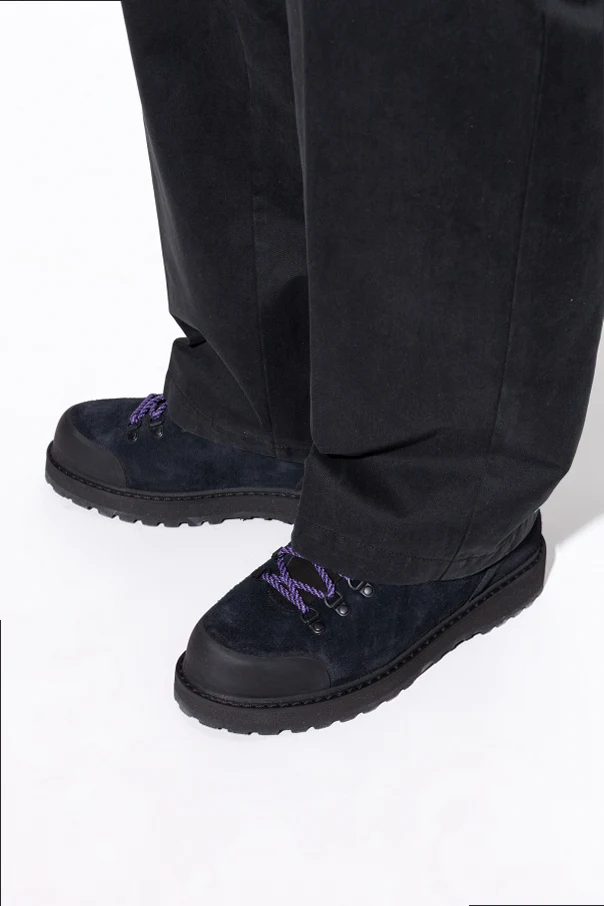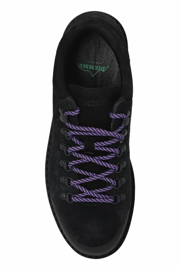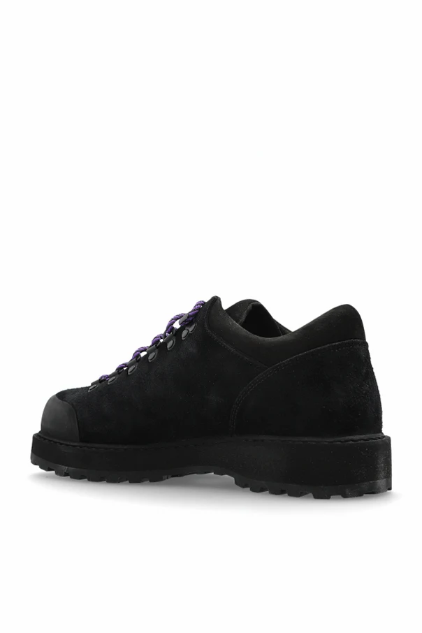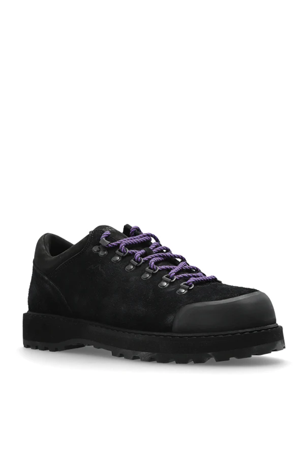 Verstärkte Kappen aus glattem Lederpaneel betonen dezent die Widerstandsfähigkeit gegen alltägliche Herausforderungen. Die robuste, deutlich profilierte Gummisohle sorgt für sicheren Tritt auf jedem Untergrund. Das hiking-inspirierte Schnürsystem – Metallhaken, klassische Ösen und kontrastierende violett-schwarze Schnürsenkel – setzen einen stilvollen Akzent. Das Innere wird von einer diskreten Designer-Signatur in Grün veredelt, ganz im Sinne von Minimalismus und Prestige.