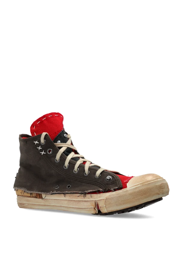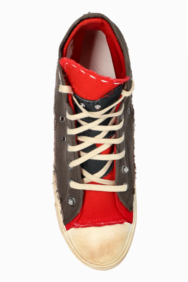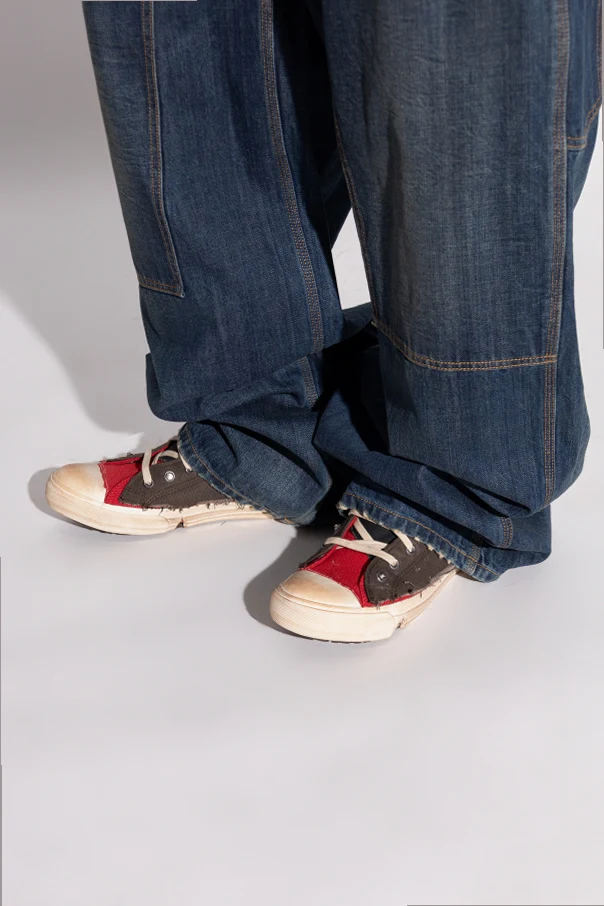 Die Außenschicht aus dickem, edlem Canvas harmoniert perfekt mit dem Innenfutter aus Leder und Stoff und sorgt so für Komfort und Langlebigkeit. Die leicht verstärkte Gummisohle gewährleistet Stabilität, während kontrastierende, rote Akzente Dynamik verleihen. Dekorative X-förmige Nähte sowie sichtbare, unregelmäßige Fäden machen jedes Paar zu einem Unikat.