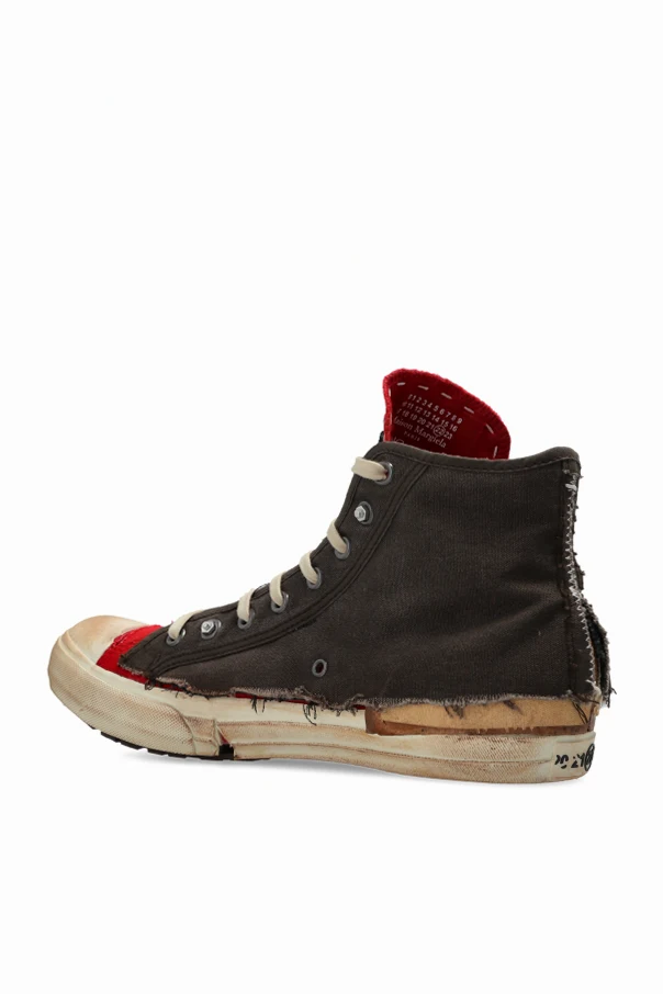 High-Top-Sneaker von Maison Margiela sind ein äußerst origineller Vorschlag, der den avantgardistischen Geist des Pariser Modehauses mit zeitloser Eleganz vereint. Das Modell in Grau zieht mit seiner raffinierten Silhouette und dem überraschenden deconstructed -Stil die Blicke auf sich: Auffällige Nähte, rohe Kanten und bewusst ausgefranste Details enthüllen den einzigartigen Charakter des Schuhwerks.