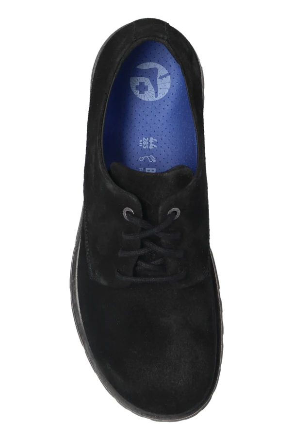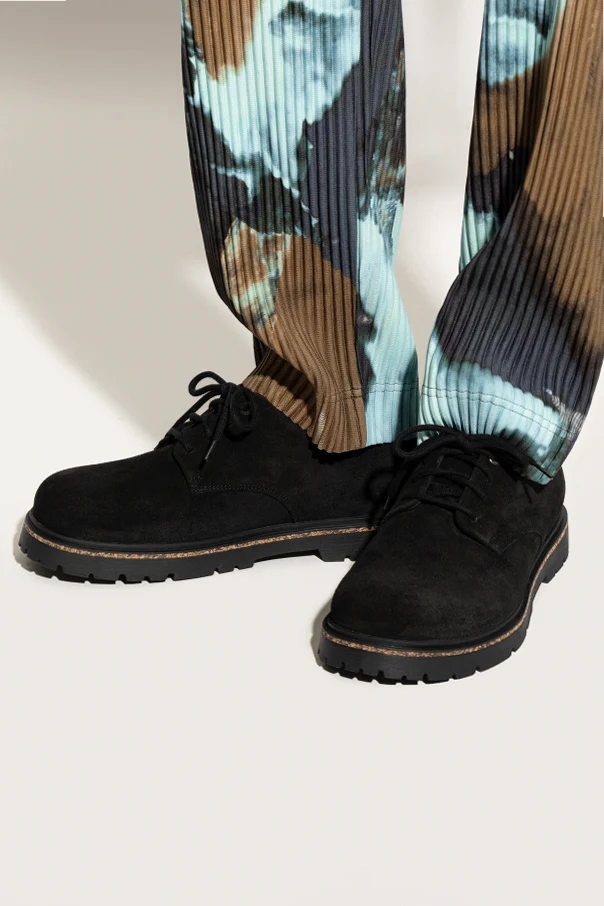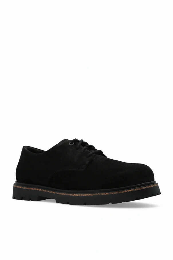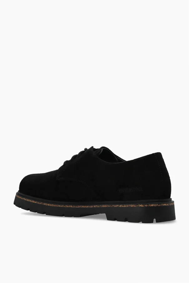 Highwood Derby-Schuhe aus dem Hause Birkenstock, einer renommierten Marke, verkörpern die Quintessenz zeitloser Eleganz in Verbindung mit Funktionalität. Das edle Obermaterial aus ausgewähltem, schwarzem Veloursleder besticht durch seine glatte, matte Oberfläche und die klassische Linie der abgerundeten Schuhspitze. Das offene Schnürsystem mit drei Paar Metallösen unterstreicht den für Derby-Schuhe typischen Komfort und die charakteristische Lässigkeit.