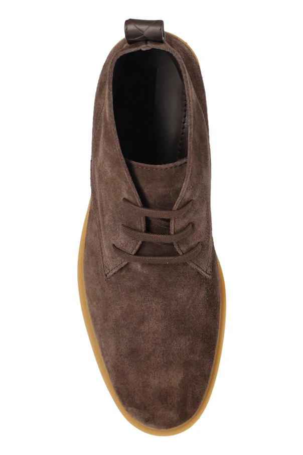 Astaire Schuhe vom renommierten Modehaus Bottega Veneta sind die Essenz raffinierter Eleganz und maskulinen Stils. Außergewöhnlich sorgfältig gefertigt, präsentieren sie den klassischen Chukka-Boots-Schnitt mit einem niedrigen Schaft, der dezent über den Knöchel reicht. Die Außenschicht, aus hochwertigem, mattem braunem Veloursleder gefertigt, besticht durch ihre edle Weichheit und sanft flauschige Struktur.