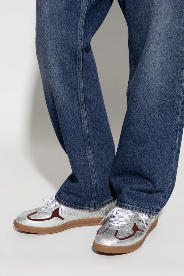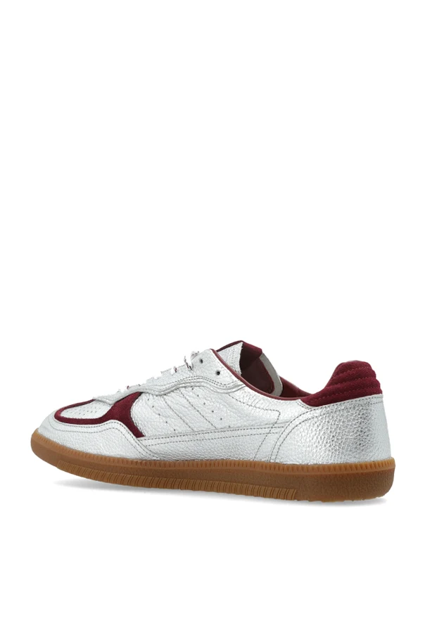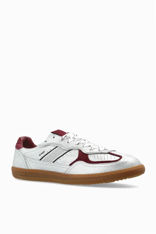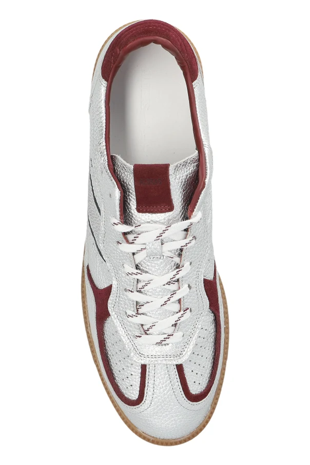Sportliche Schuhe Tb.490 der Marke ALOHAS verkörpern moderne Eleganz und zeitlose Klasse. Das niedrig profilierte, abgerundete Design dieser Sneakers ist von traditionellen Fußballschuhen inspiriert und begeistert durch ausgewogene Form und Dynamik. Das silberfarbene Obermaterial aus strukturiertem Leder mit subtil schimmerndem Metallic-Finish harmoniert perfekt mit bordeauxroten Akzenten aus weichem Veloursleder an den Zehen, der Zunge und der Ferse.