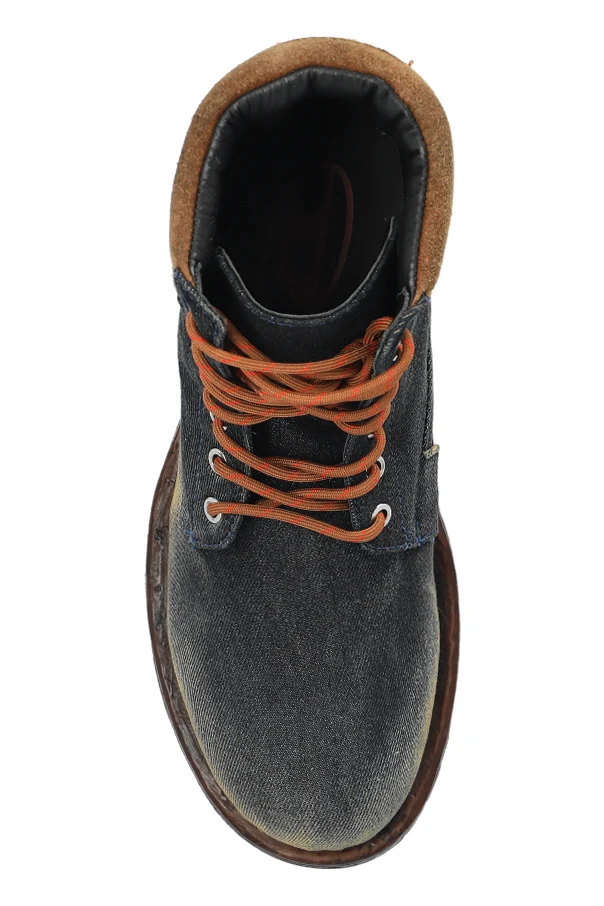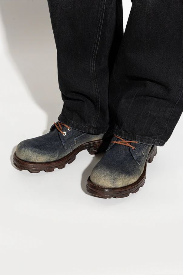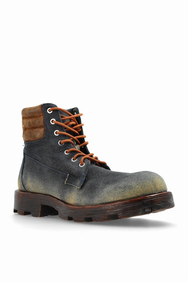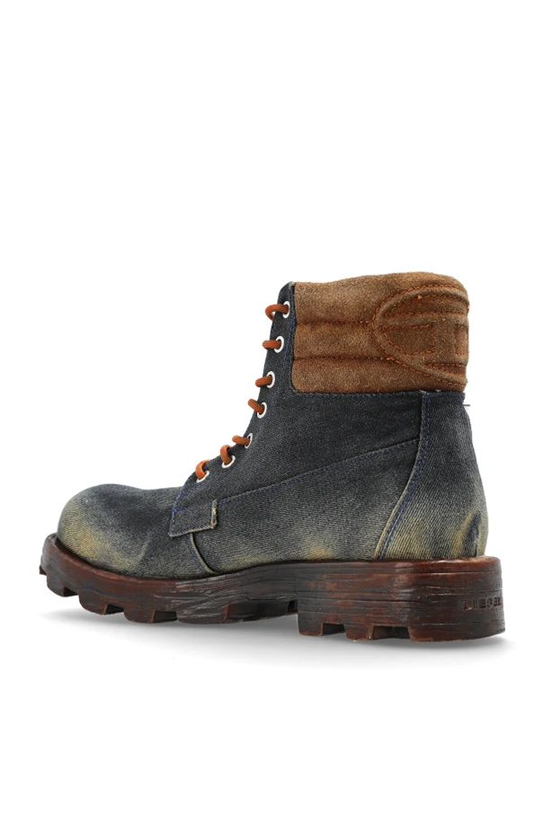 Die ‘D-HAMMER’ Boots aus der exklusiven Kollektion von Diesel sind eine Empfehlung für Liebhaber außergewöhnlicher Eleganz. Die klassische Silhouette der Boots wurde durch eine massive, schützende Profilsohle und einen hohen Schaft ergänzt, die Stabilität und Komfort garantieren. Der Schaft, gefertigt aus kunstvoll verarbeitetem Material, das gealterten Denim oder Nubuk imitiert, besticht durch die marineblaue Farbe mit dezenten, unregelmäßigen Abriebspuren, die dem Ganzen Raffinesse und einen unverwechselbaren Charakter verleihen.