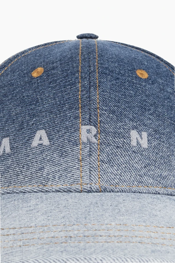 Die Jeans-Cap mit Schirm der Marke Marni ist ein raffiniertes Angebot für Menschen, die zeitlose Ästhetik und unaufdringliche Eleganz schätzen. Dieses Modell begeistert mit einer klassischen, sechsteiligen Form und einem abgerundeten Schirm, der am Rand dezent heller ist. Die Verarbeitung aus hochwertigem blauem Denim verleiht dem Ganzen einen markanten Charakter, während die sichtbaren gelben Nähte einen geschmackvollen Kontrast schaffen.