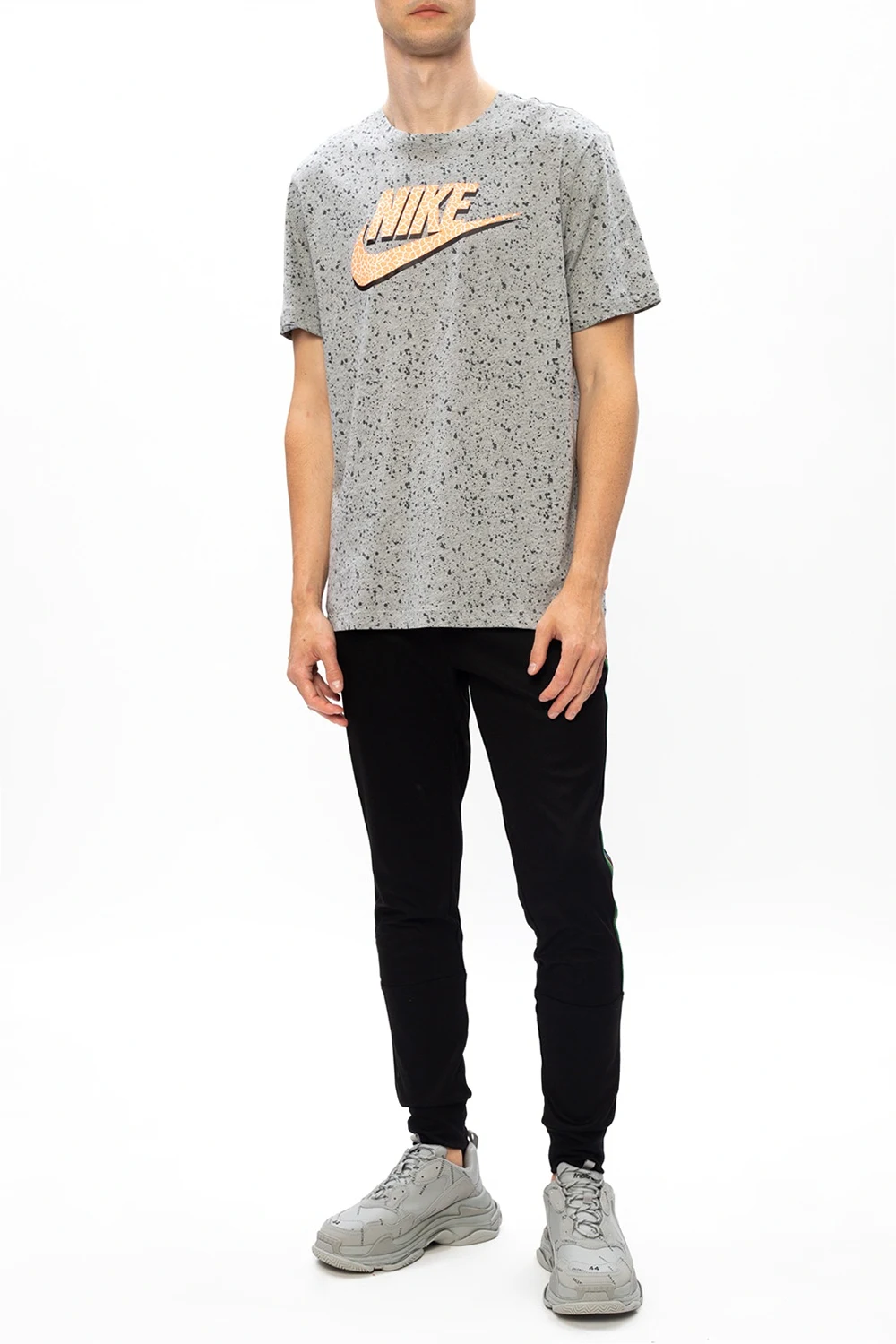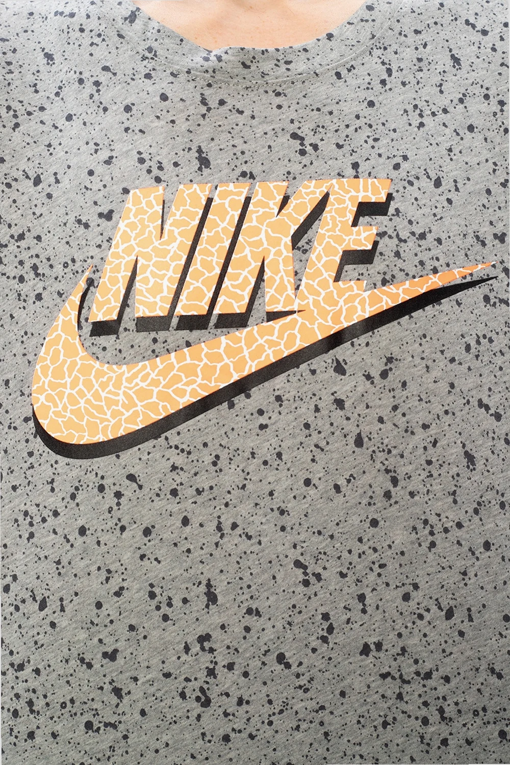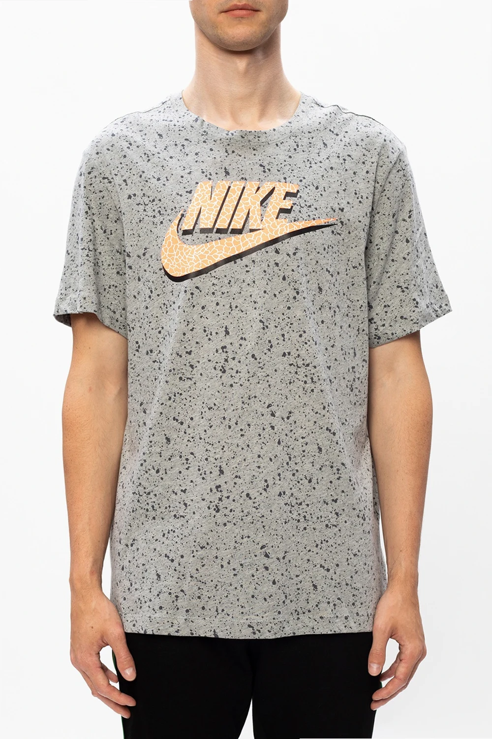 Grey T-shirt from Nike. Crafted from cotton, this item features a round neck and short sleeves and is enriched by a black pattern and a logo print in yellow, black and white