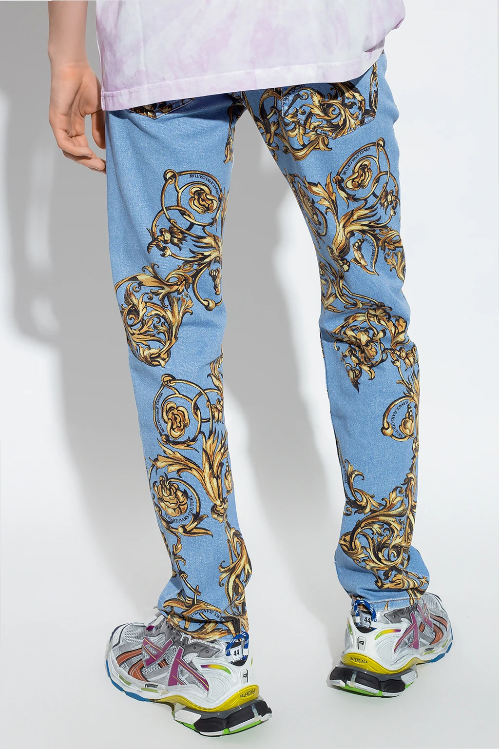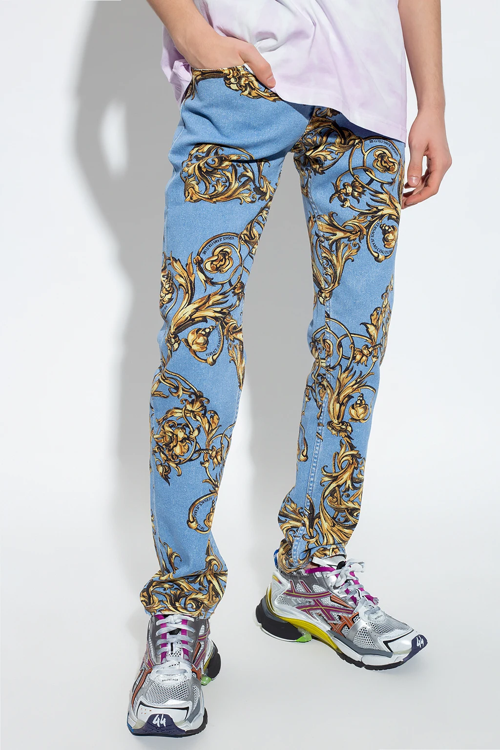Light blue 'slim' jeans from Versace Jeans Couture. Fastened with buttons. Decorated with the brand's signature brown, yellow and black pattern. Decorative logo patch on the back. Five slip pockets: three on the front and two on the back. The legs are finished with distressed effect.