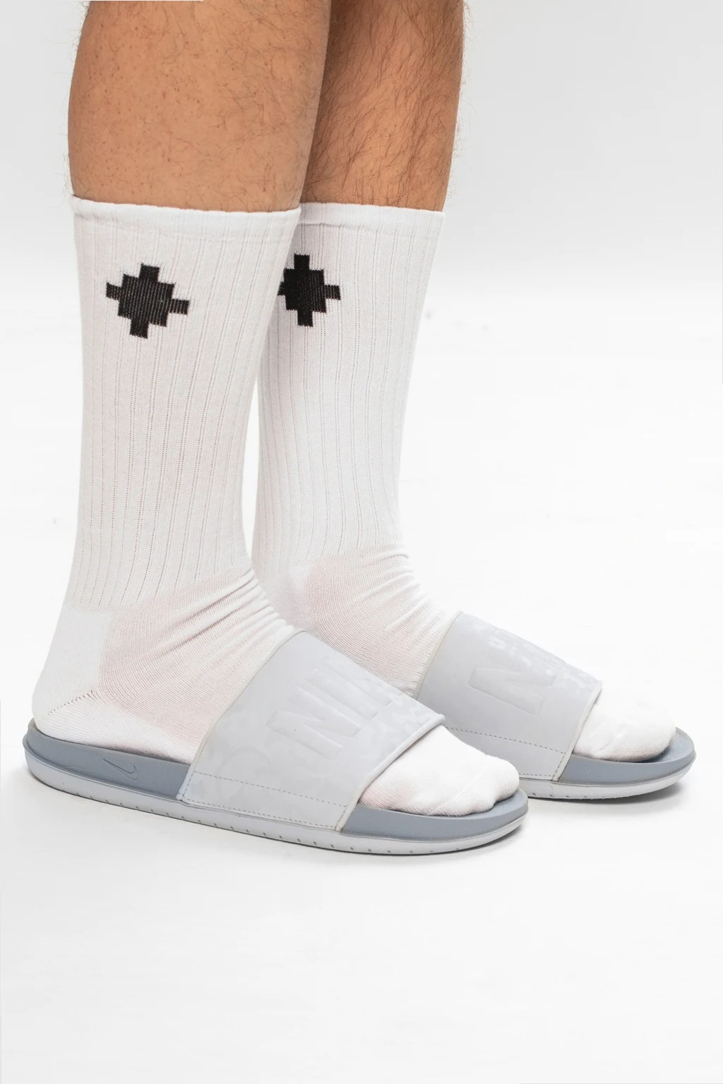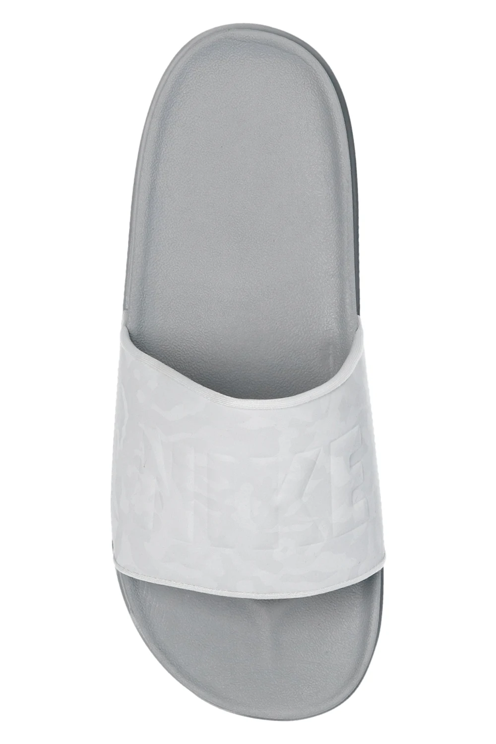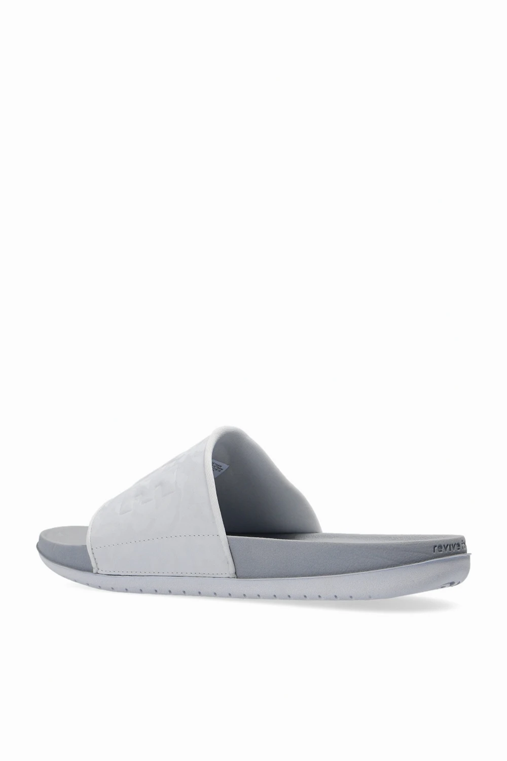 Grey ‘Offcourt’ slides from Nike. Decorated with a camo pattern and a raised logo, this design features a soft jersey lining on the inside of the strap for added comfort, a super-soft two-layered Revive foam and a grey rubber track sole with the iconic Air Force 1 logo.