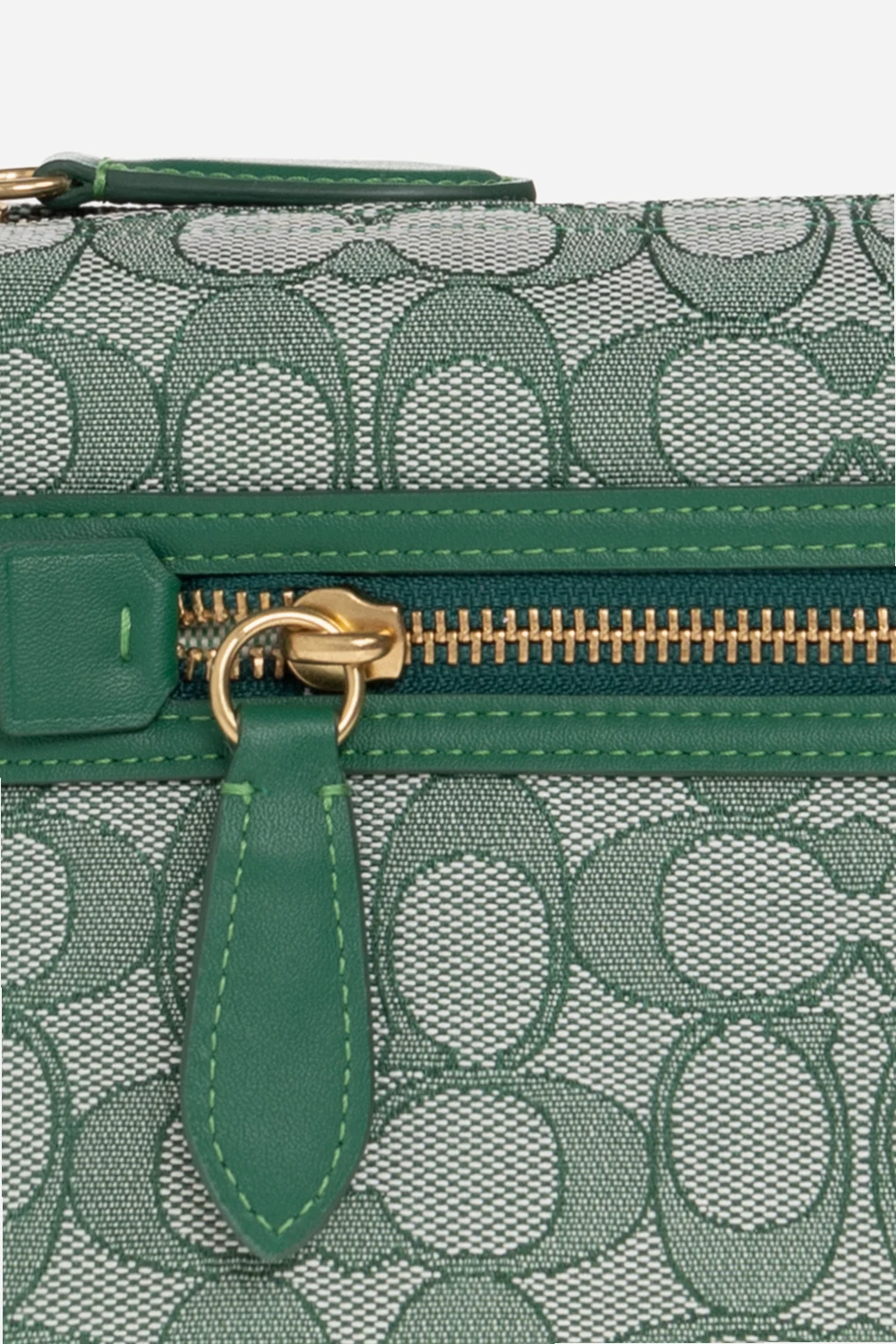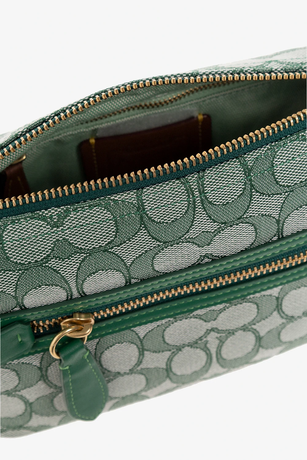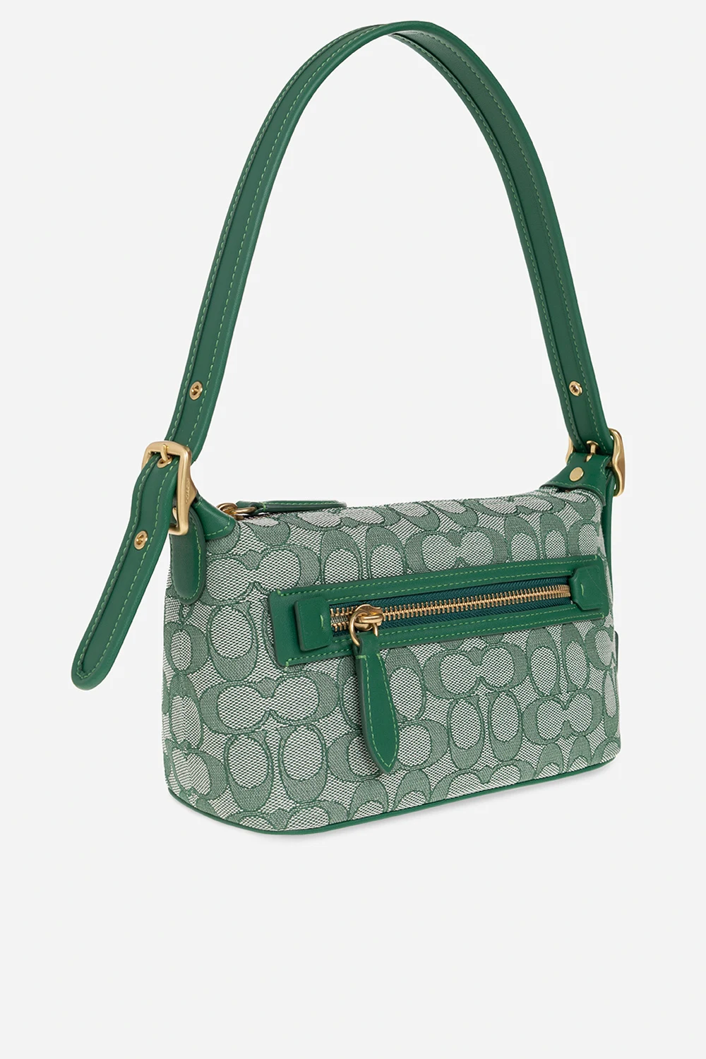 Green 'Demi Signature’ shoulder bag from Coach. Crafted from coated with a jacquard monogram pattern, this design features a zip fastening, leather trimmings, an attached signature pendant with an embossed logo, a back zip pocket, an adjustable strap, antiqued gold-tone metal hardware and one internal compartment with a zip pocket.