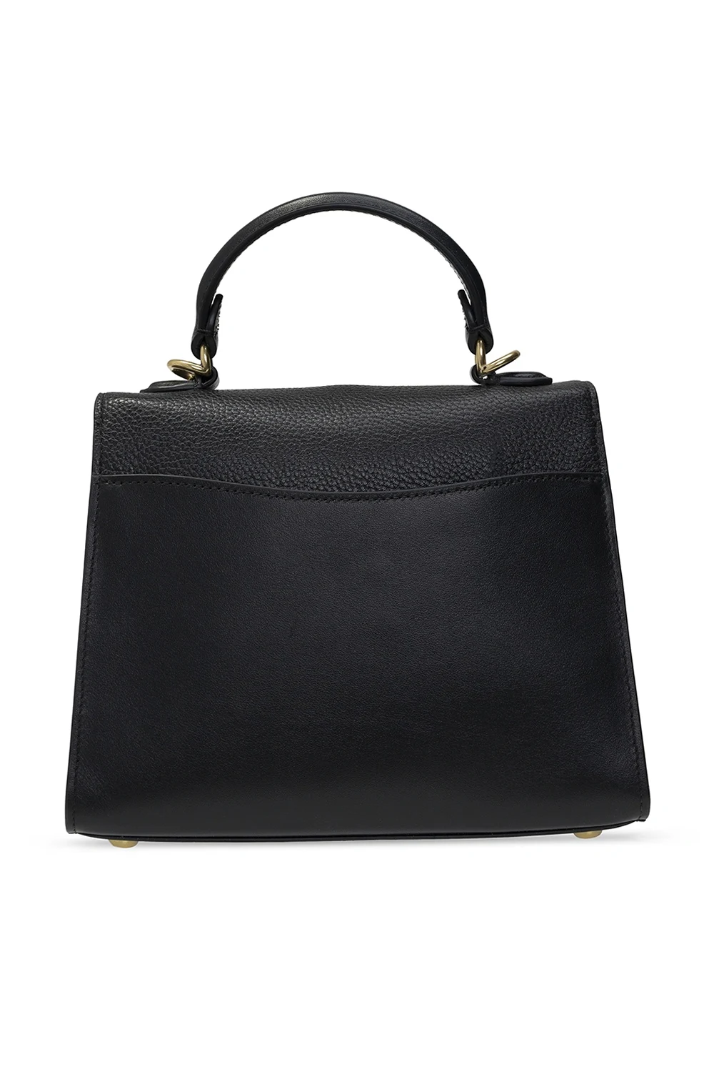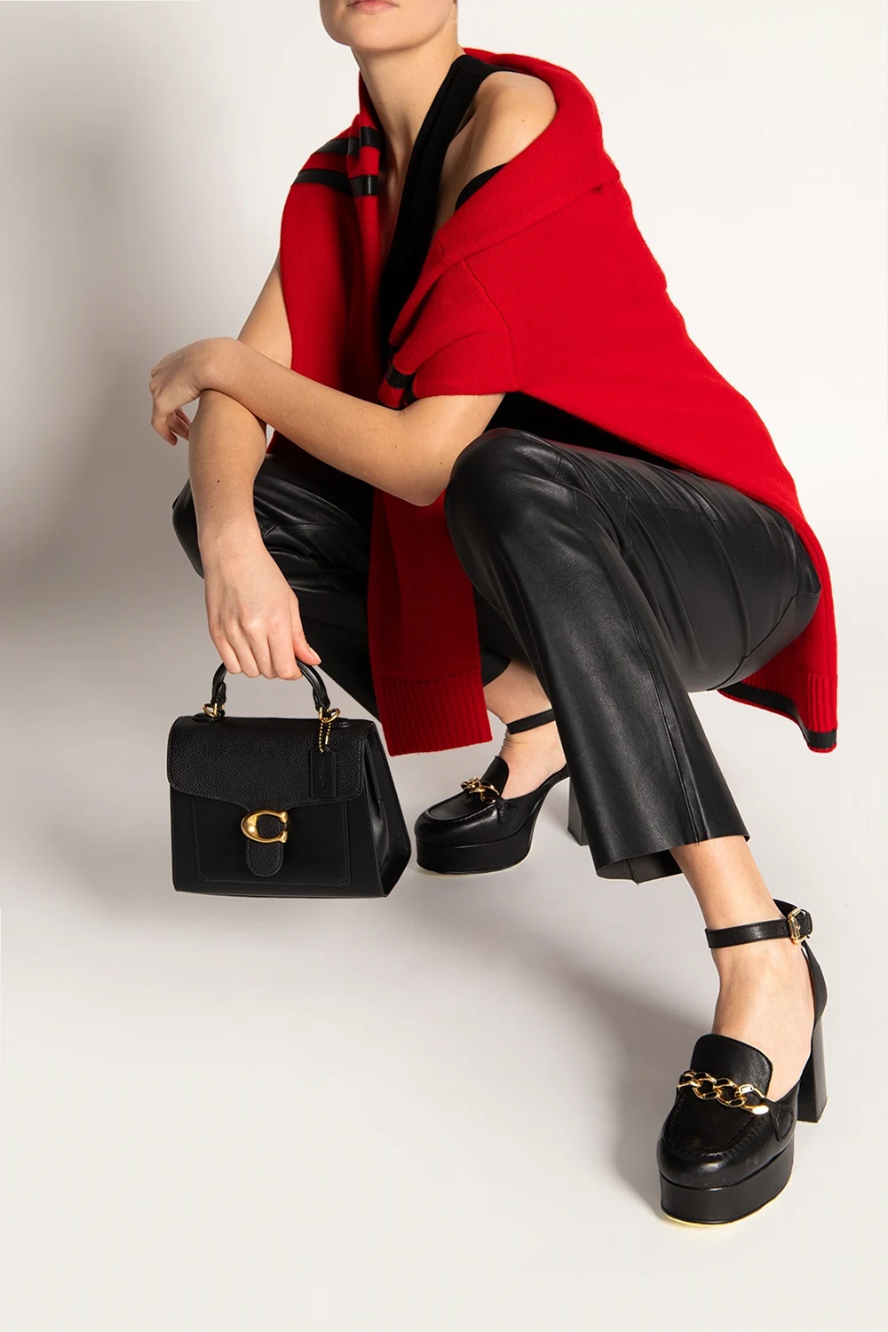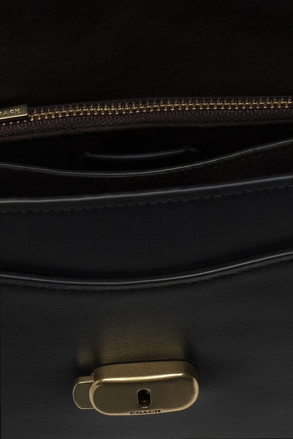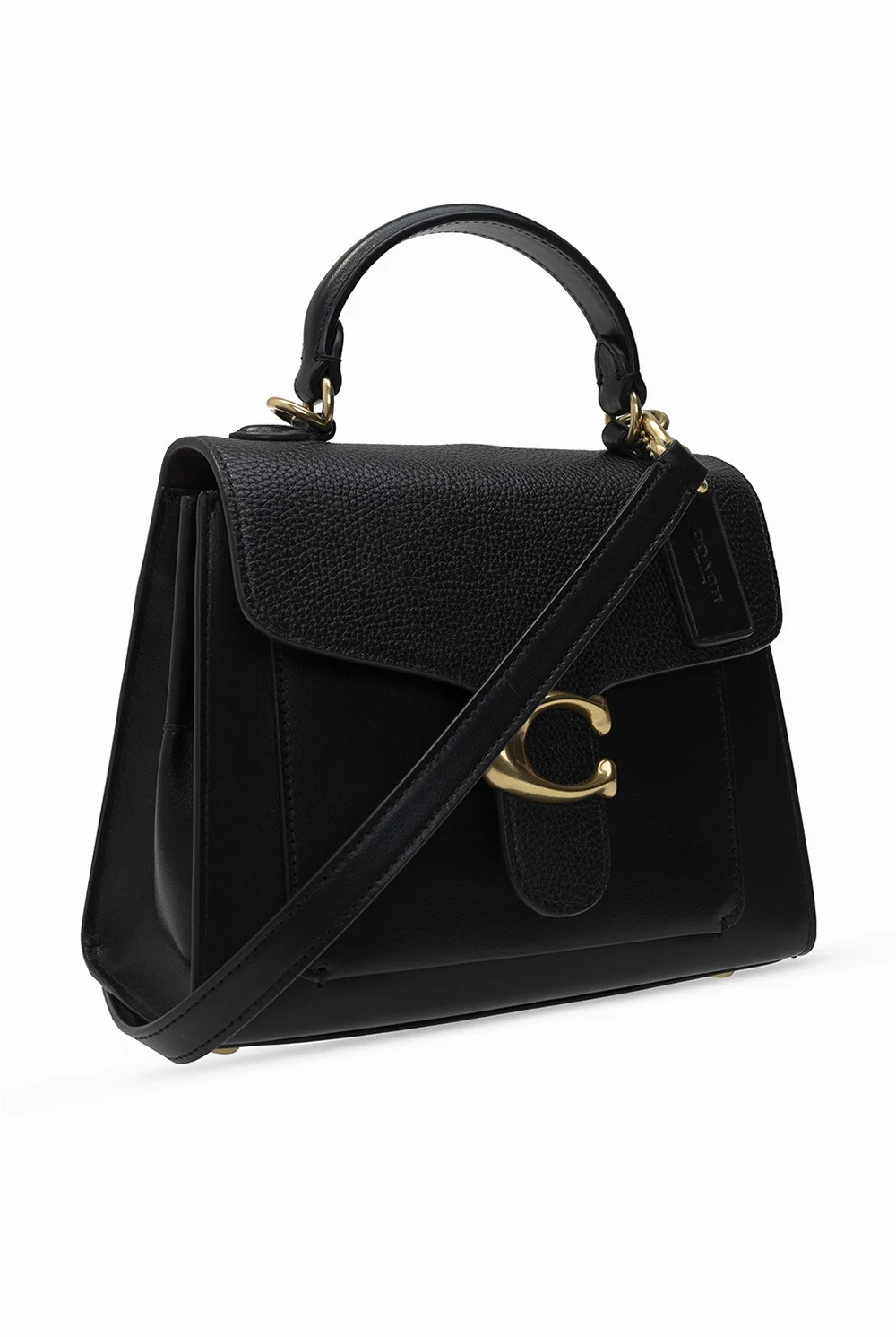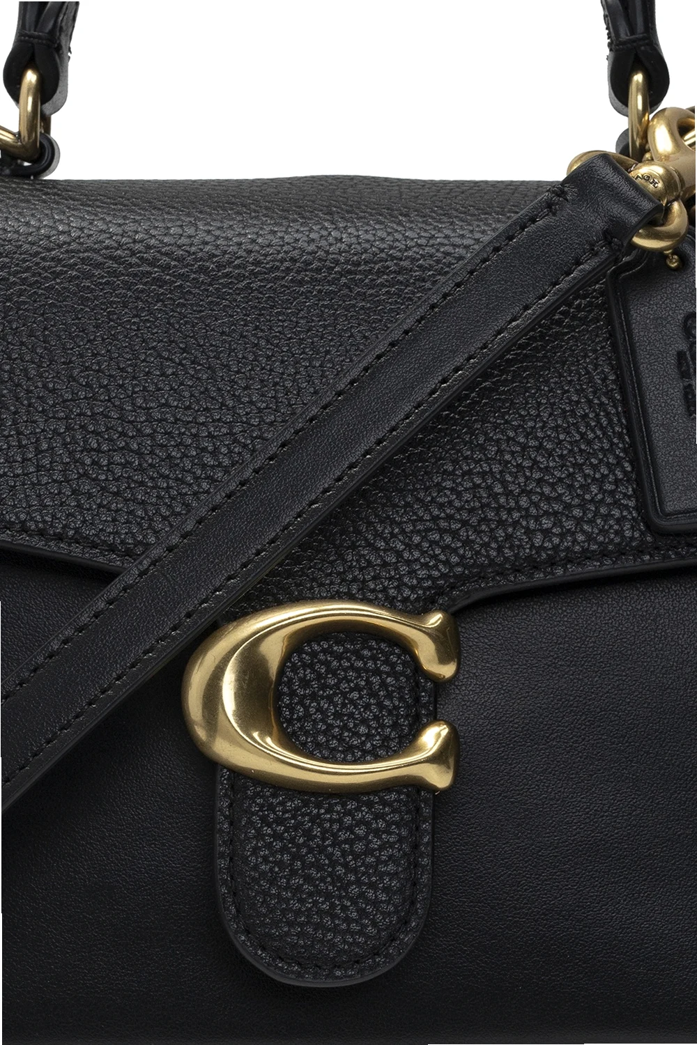 Black 'Tabby' shoulder bag from Coach. Crafted from leather, this design fastens via a snap and features gold-tone metal hardware, including logo plaque on the front, an external slip pocket on the back, a half-round handle, a detachable and adjustable shoulder strap and a brown-clad interior with two compartments, one zip pocket and one slip pocket.