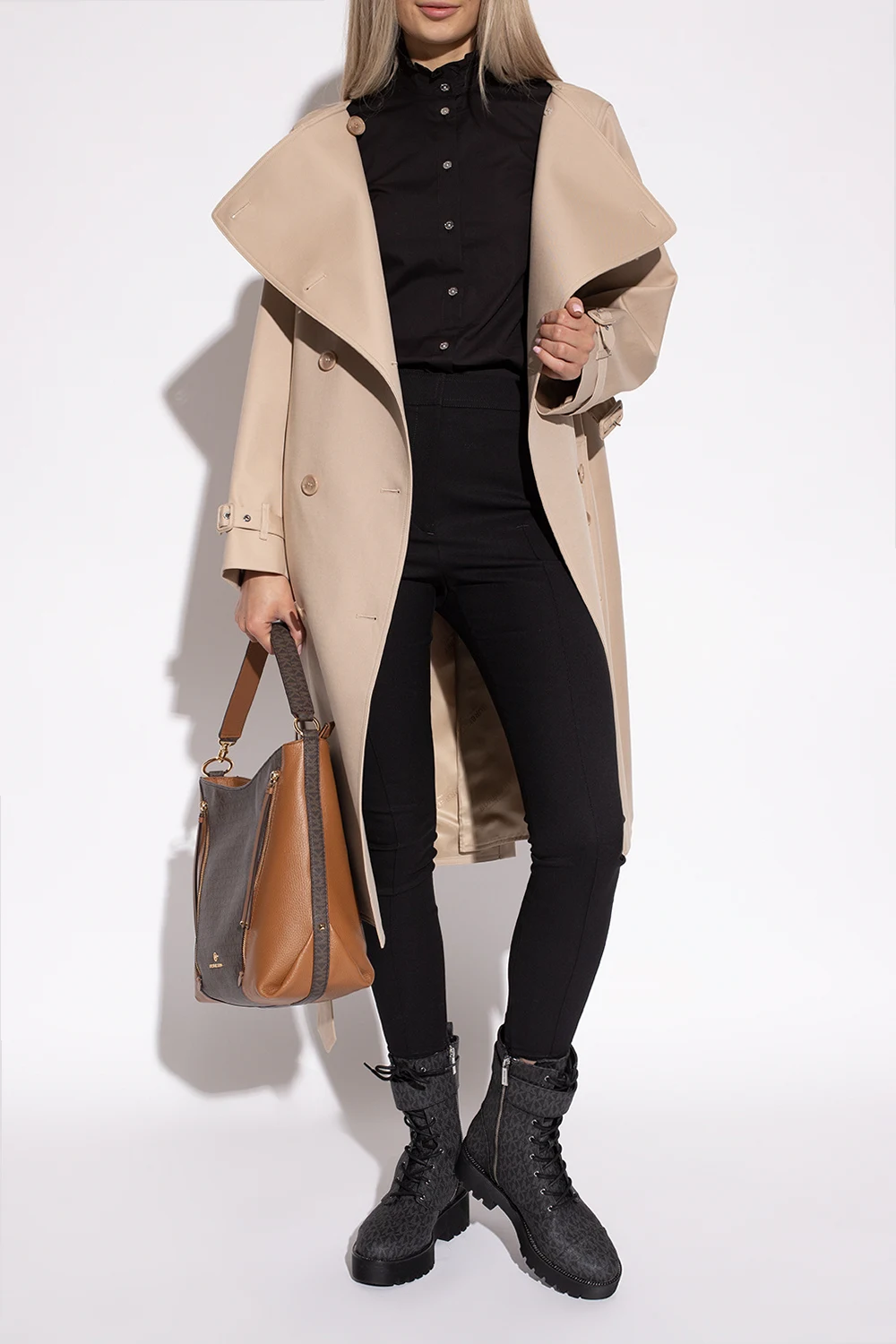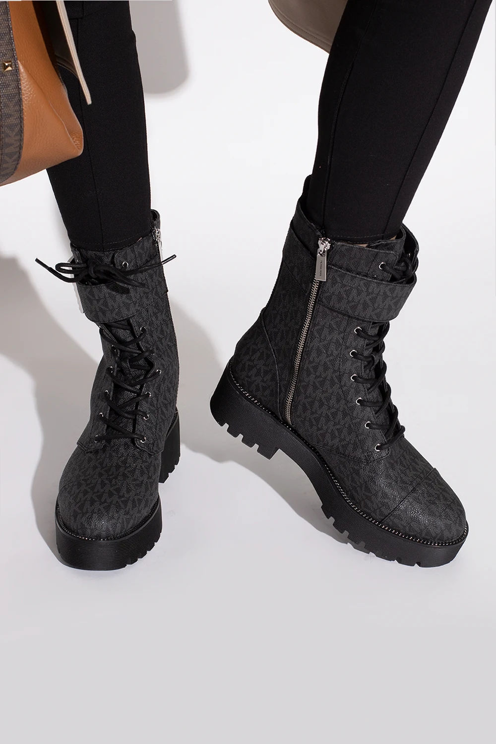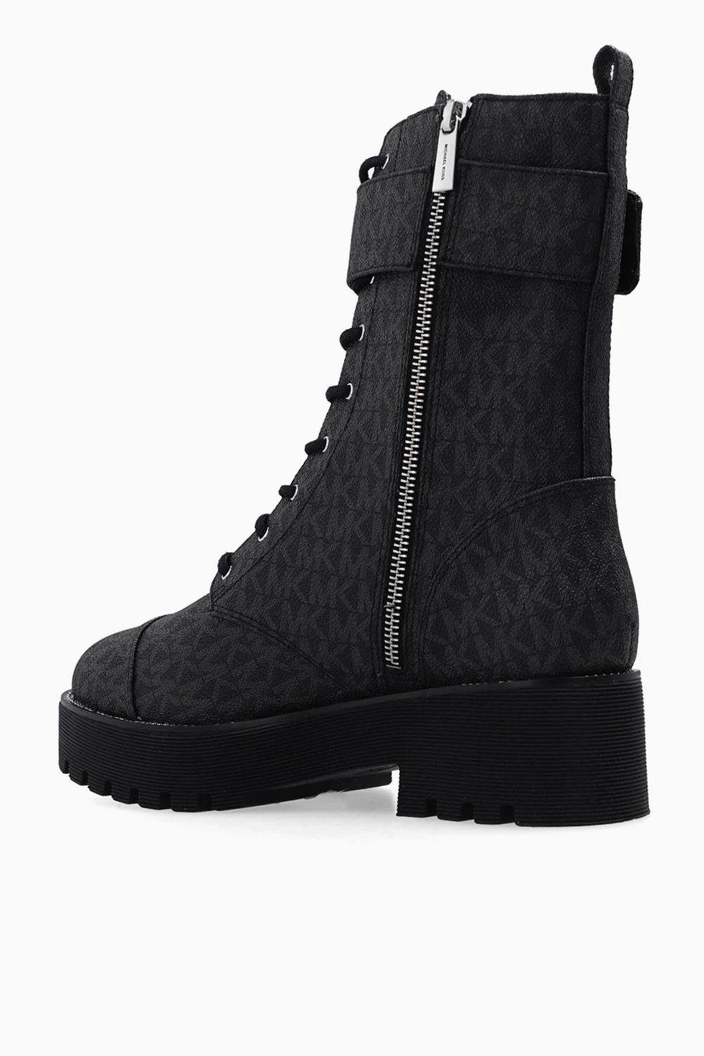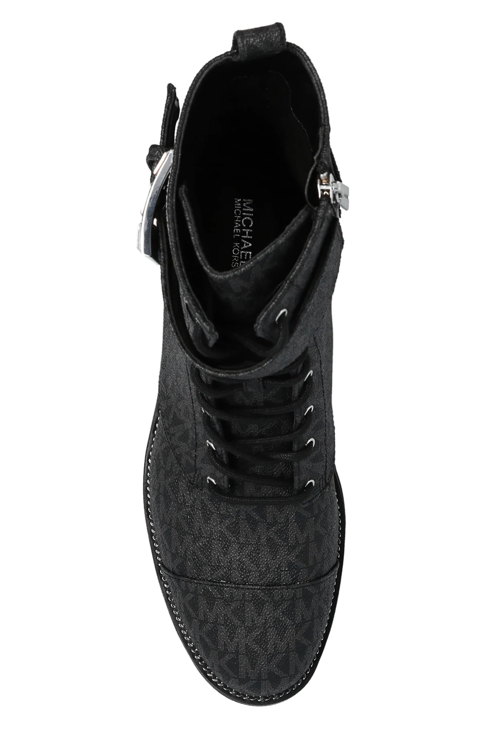 Black ‘Brycle’ ankle boots from Michael Michael Kors. Crafted from canvas decorated with a grey monogram, this lace-up model sits on a black rubber sole with chain detailing and features a zip closure accompanied by a crystal-bejewelled buckle strap on the side.