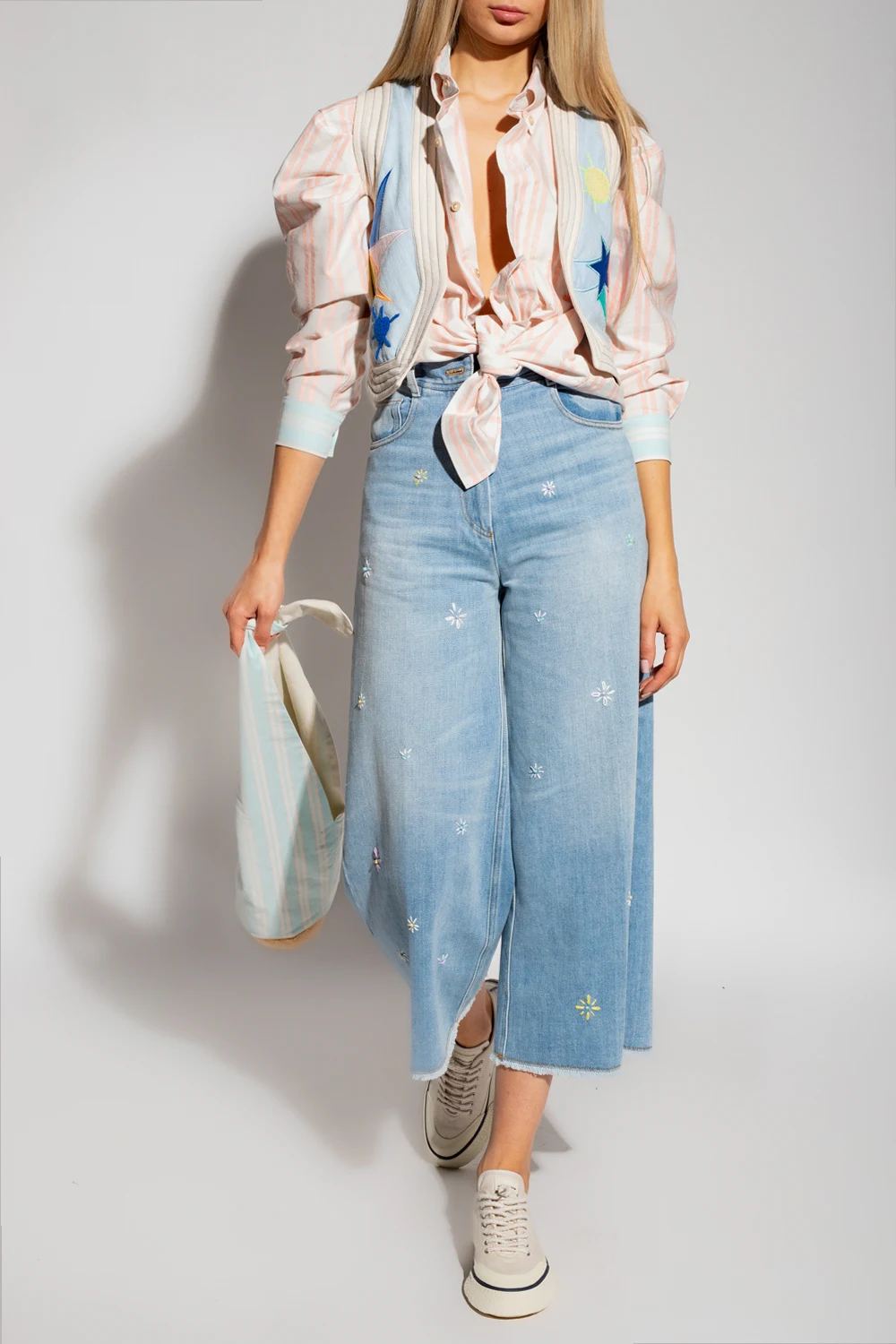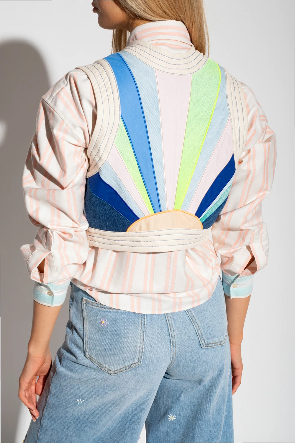 Light blue denim vest from Forte Forte. Enriched by a patchworked ‘The Starry Land’ pattern, this style features a cropped silhouette and decorative cream quilted details.