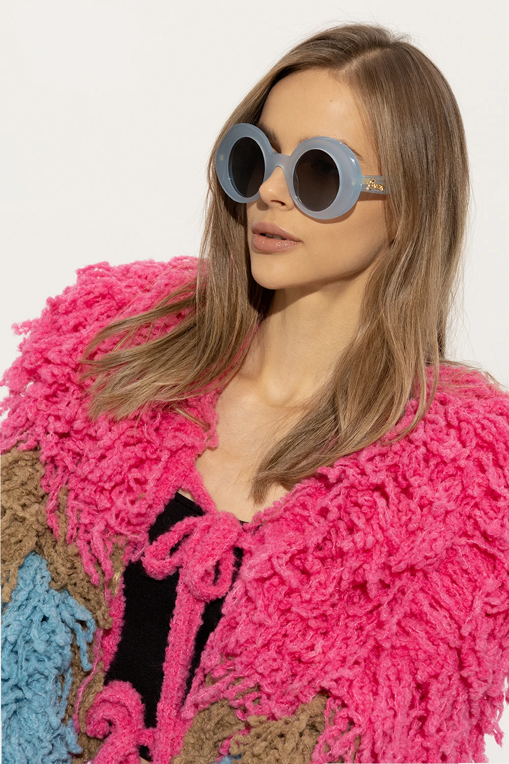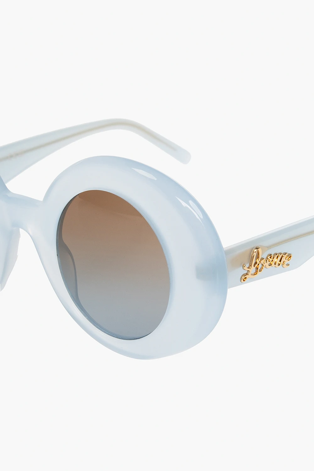Light blue sunglasses from Loewe. This pair features decorative frames, gold-tone metal logo appliqué and gradient lenses in brown and blue with 100% UVA/UVB protection. Comes with a case.