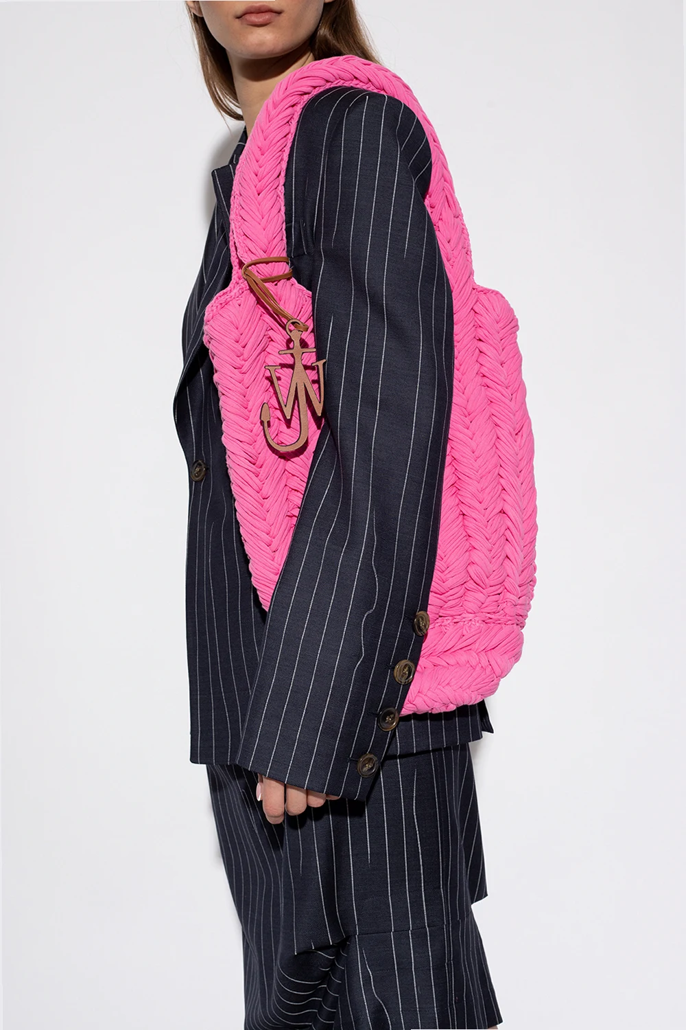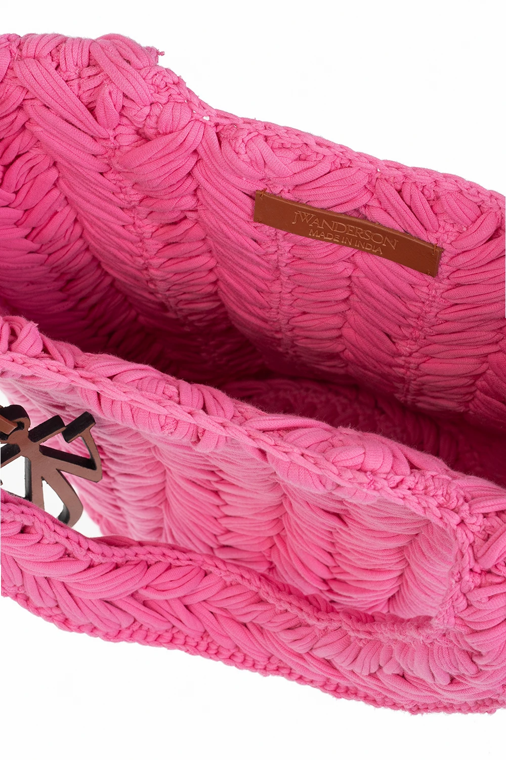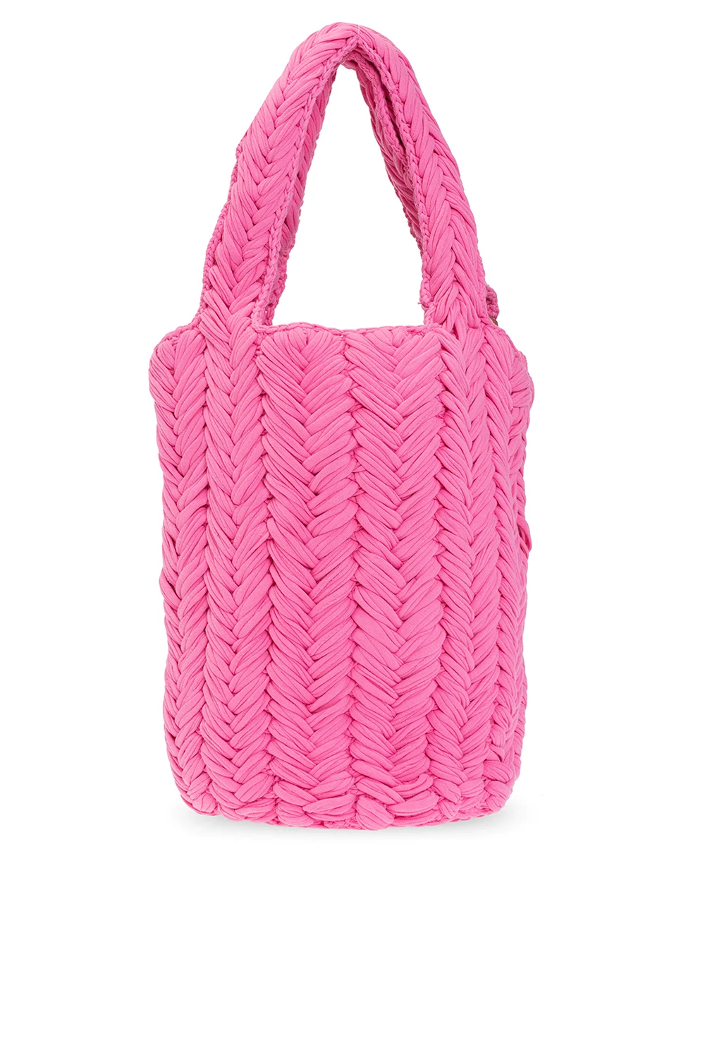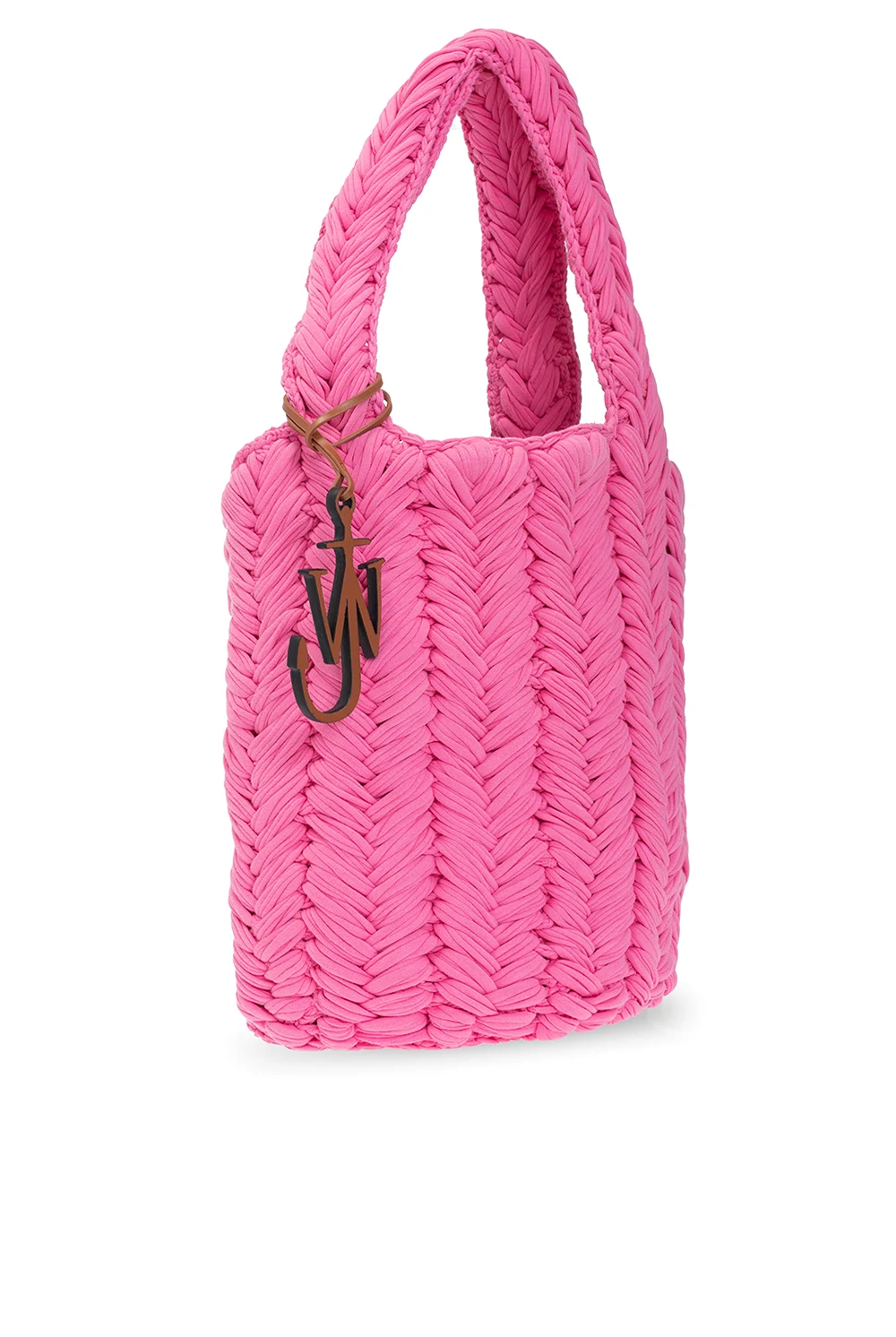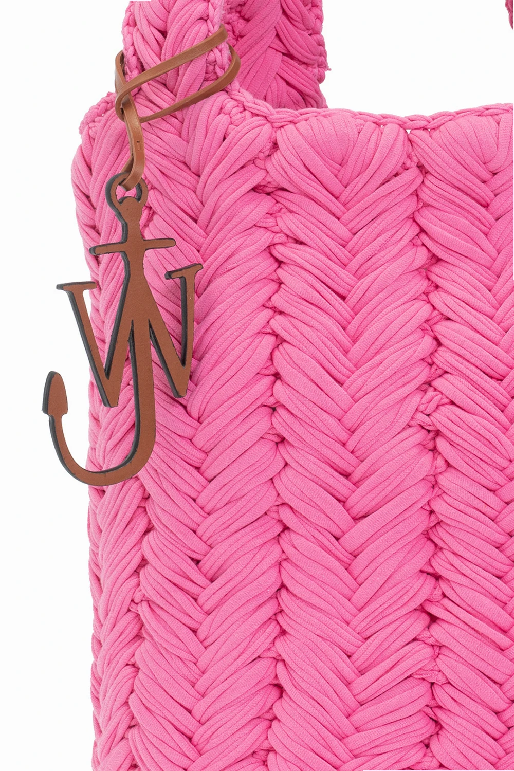 Pink, woven 'Knitted' shopper bag from J.W. Anderson. Made of organic cotton. Two semicircular handles. Inside a compartment.