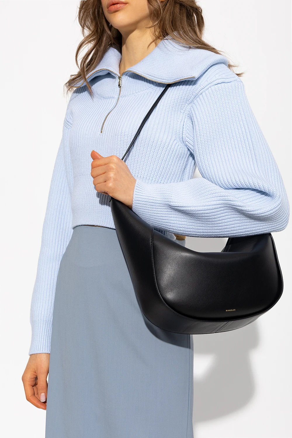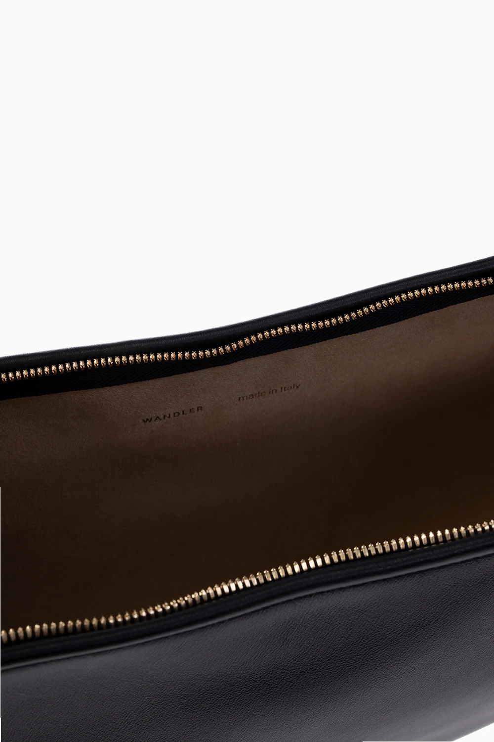 Black 'Maggie' shoulder bag from Wandler. Made of calf leather, this design features a zip fastening, a gold-tone logo printed on the front, an adjustable shoulder strap, gold-tone metal hardware and one internal compartment.