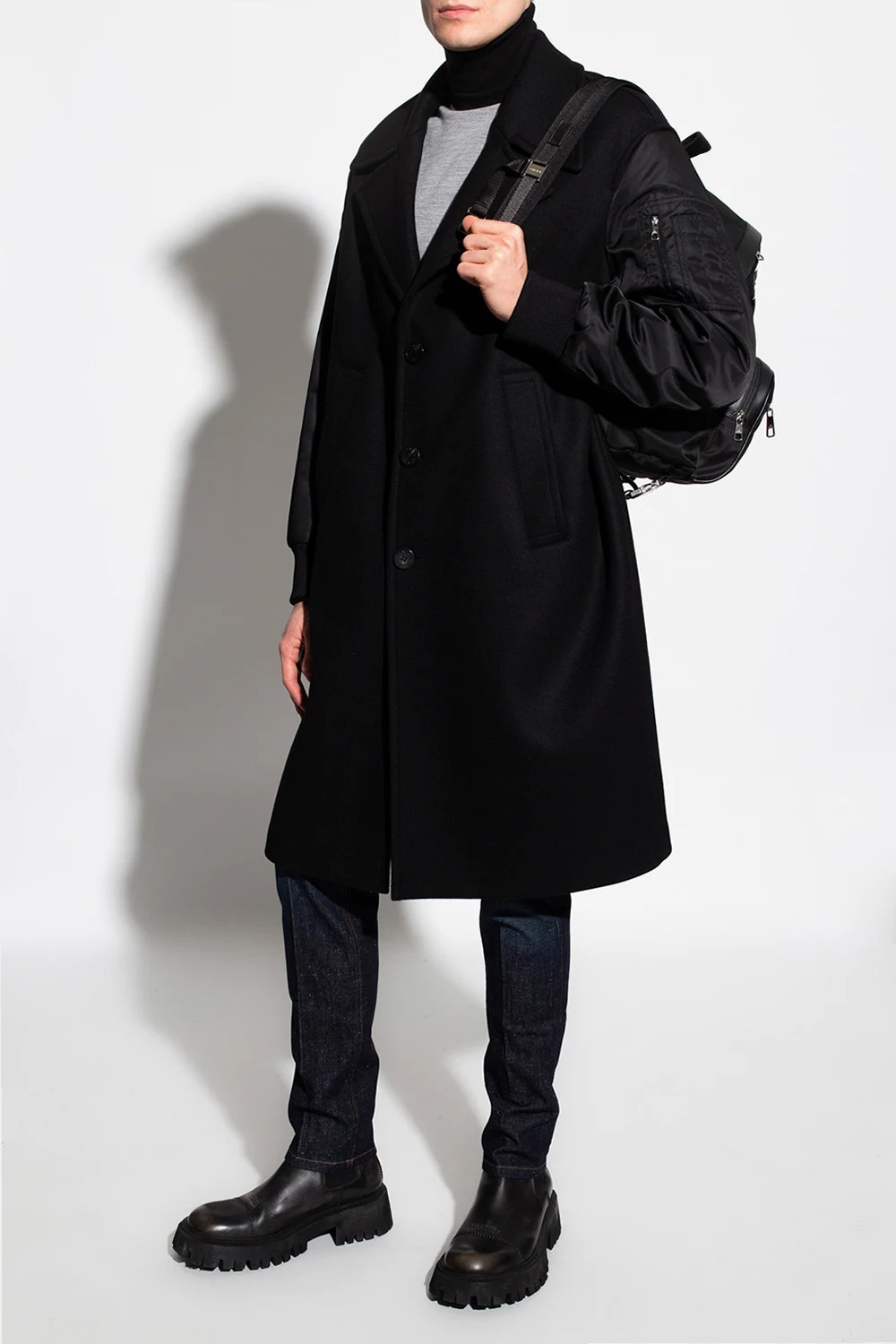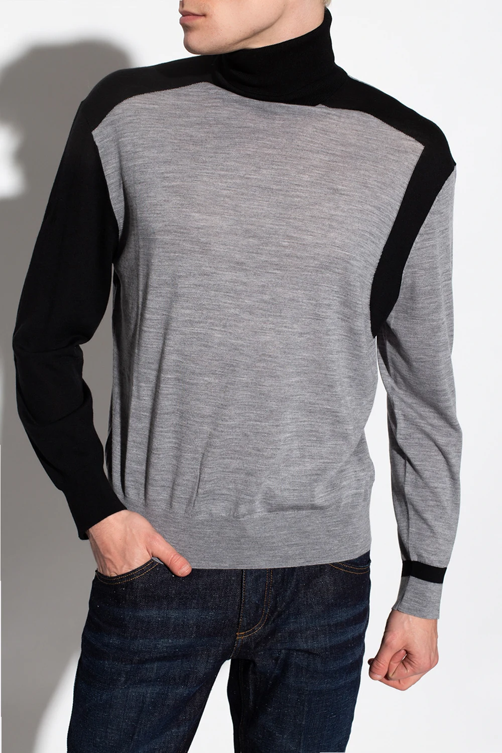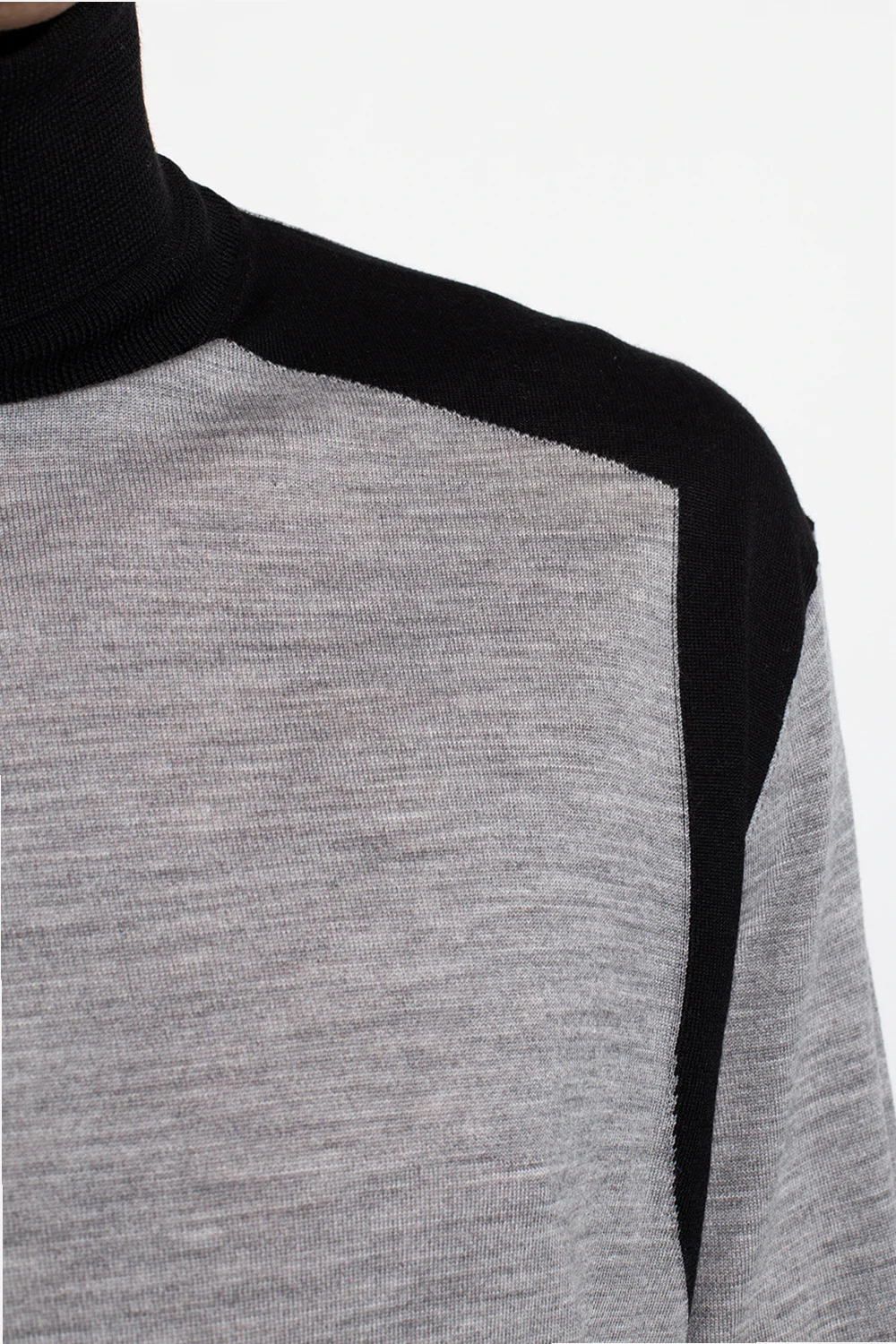 Grey and black turtleneck sweater from Neil Barrett. Made of wool, this style is complete with a snug collar and ribbed trims on the bottom hem and cuffs.