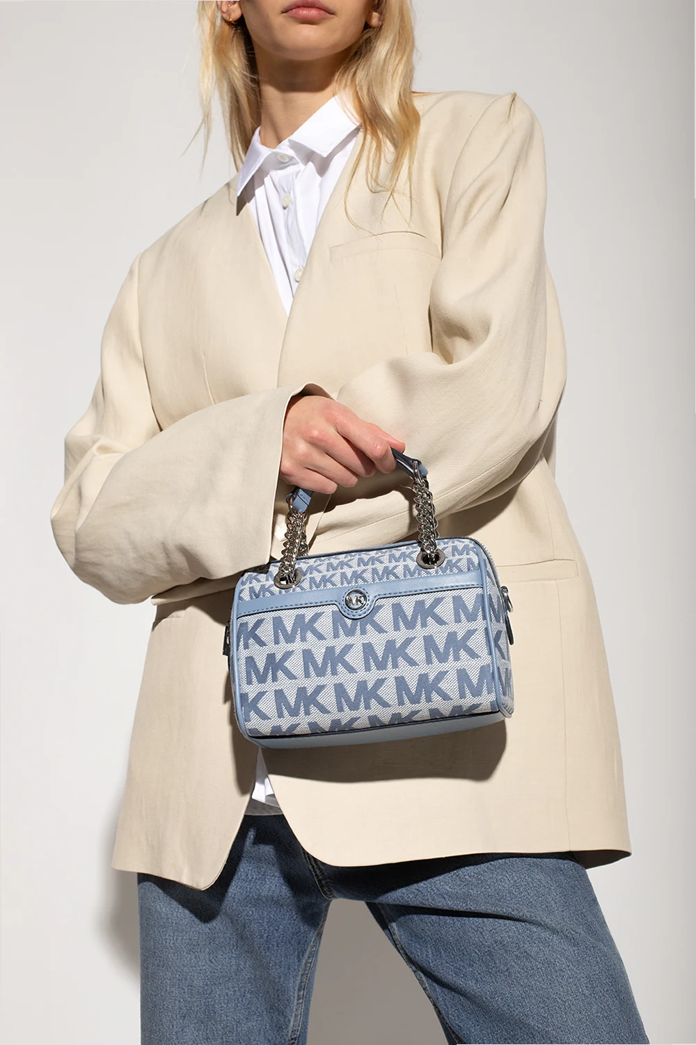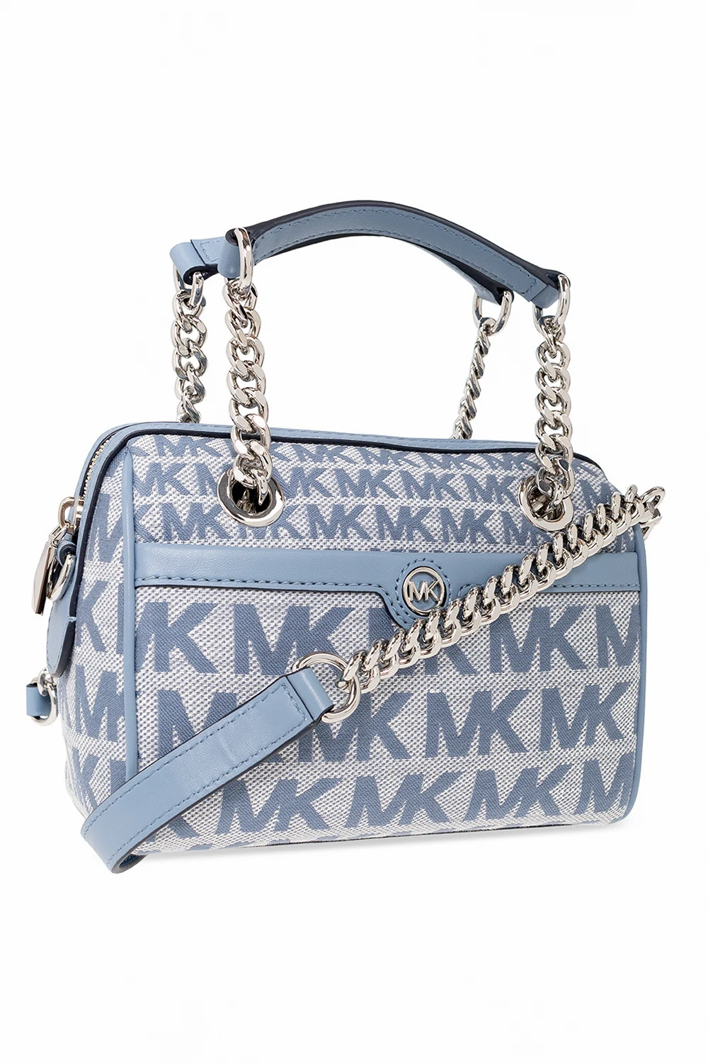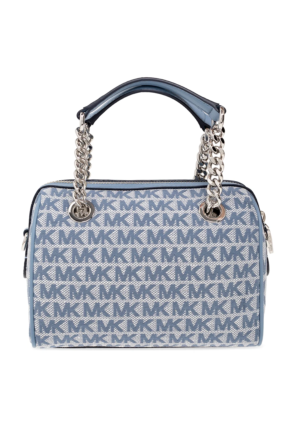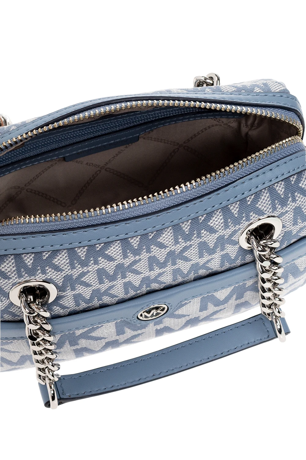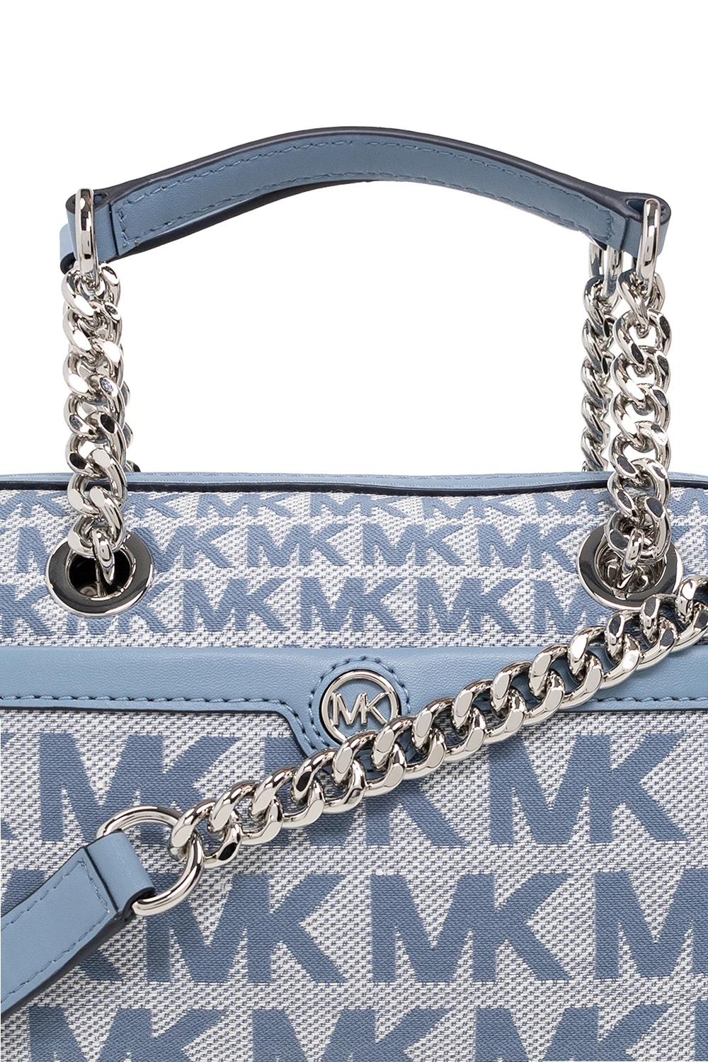 Blue and white 'Blaire’ shoulder bag from Michael Michael Kors. Crafted from monogrammed canvas, this design secures with a zip and showcases a logo plaque accompanied by a slip pocket on the front, two half-round handles reinforced with a chain, a detachable and adjustable shoulder strap intertwined with a chain, silver-tone metal hardware and one internal compartment with zip pocket and one slip pocket.