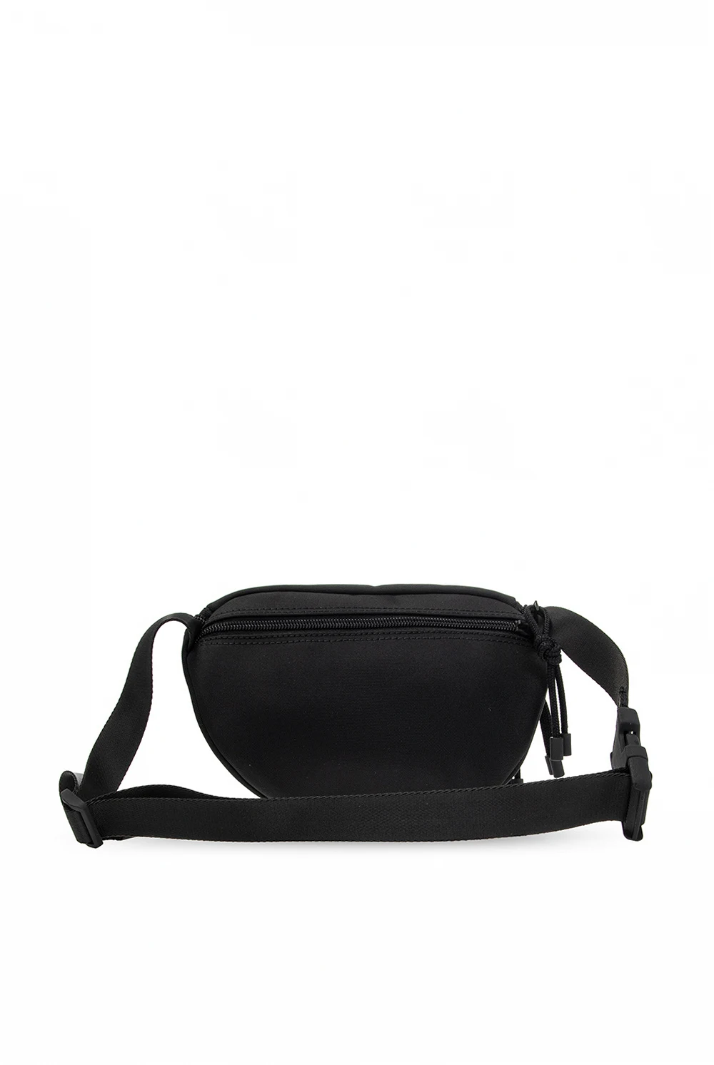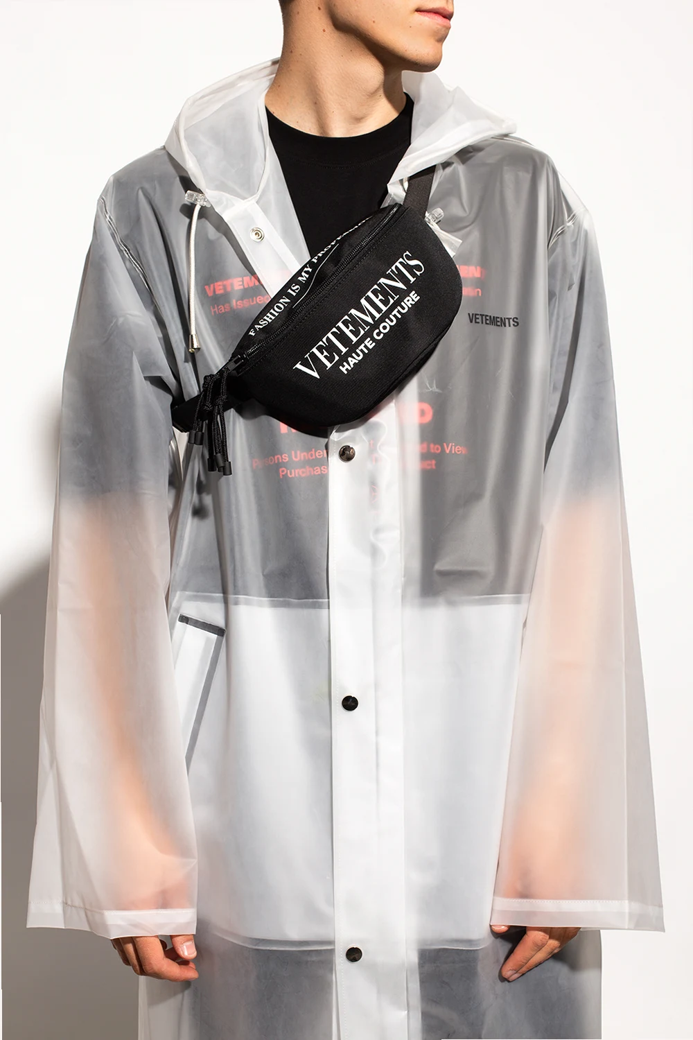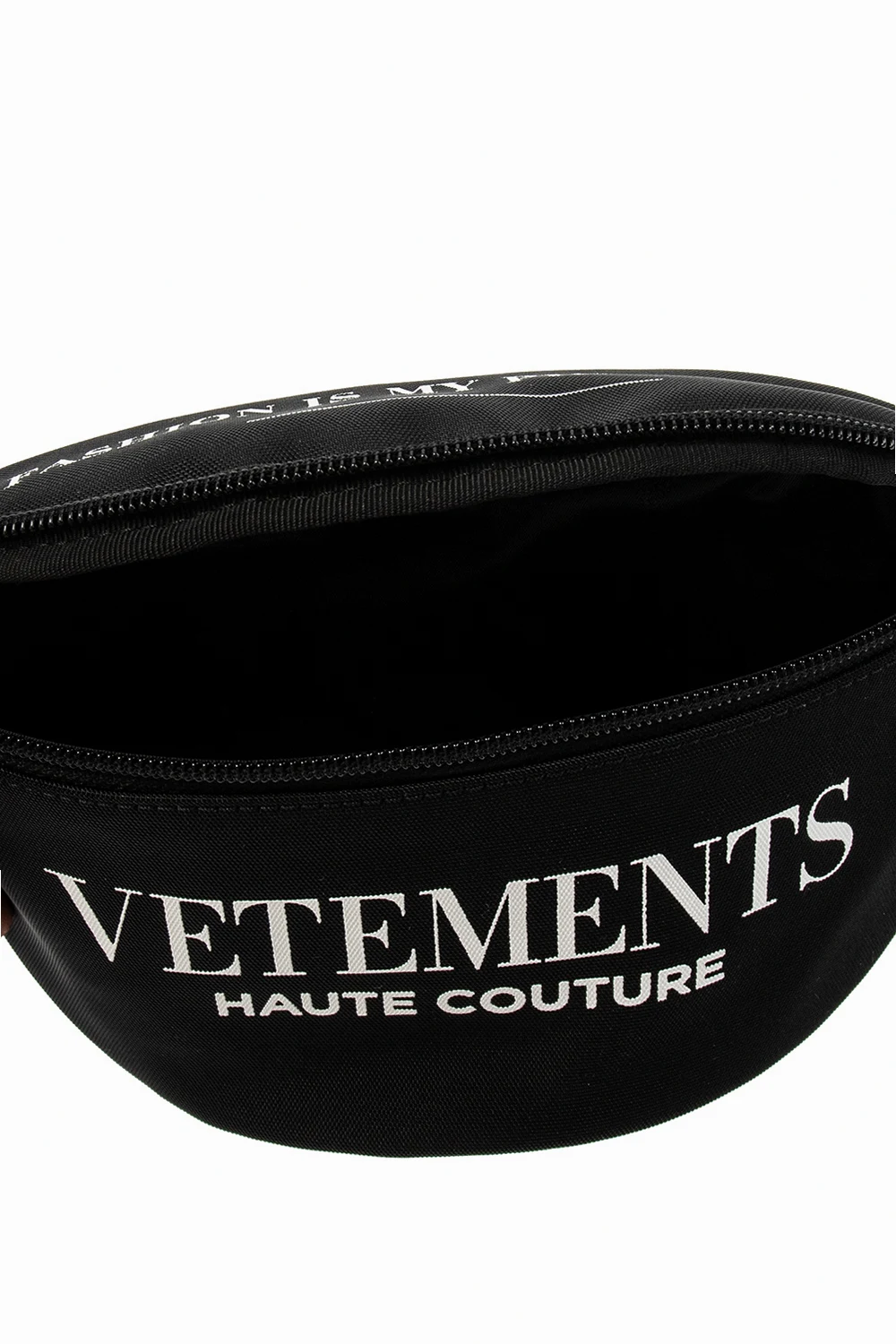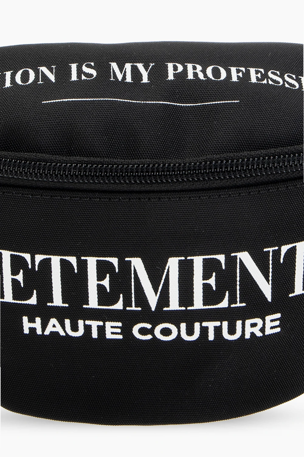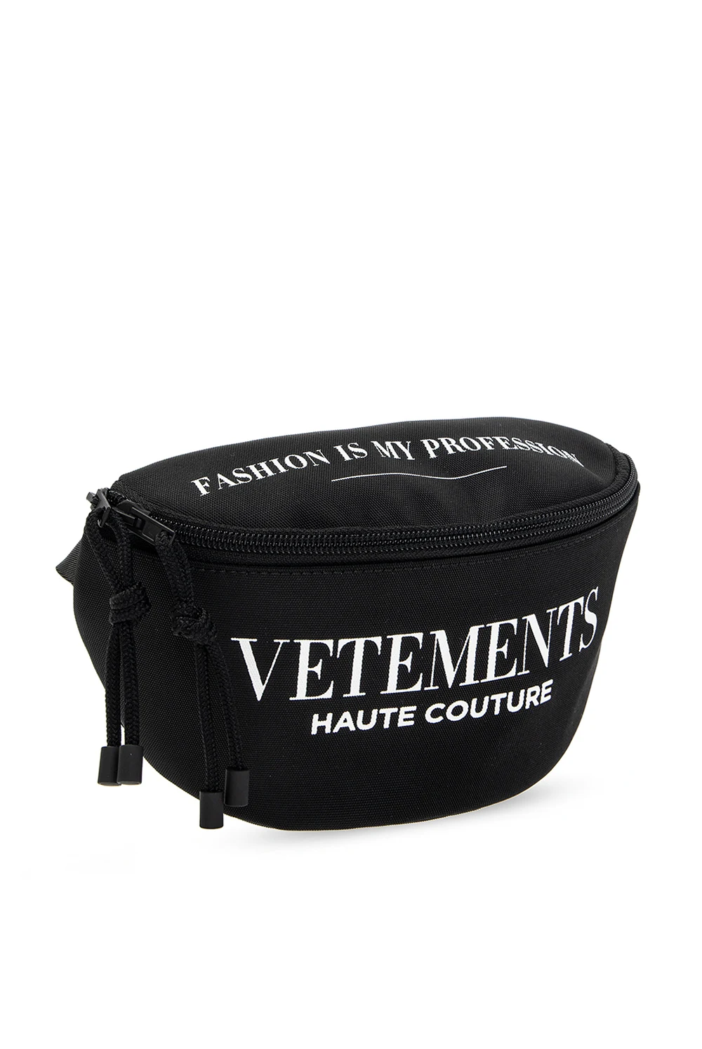 Black belt bag from VETEMENTS. Fastened with a two-way zip, this design features a fold-over front, white logo print, back zip pocket, adjustable belt and one internal compartment.