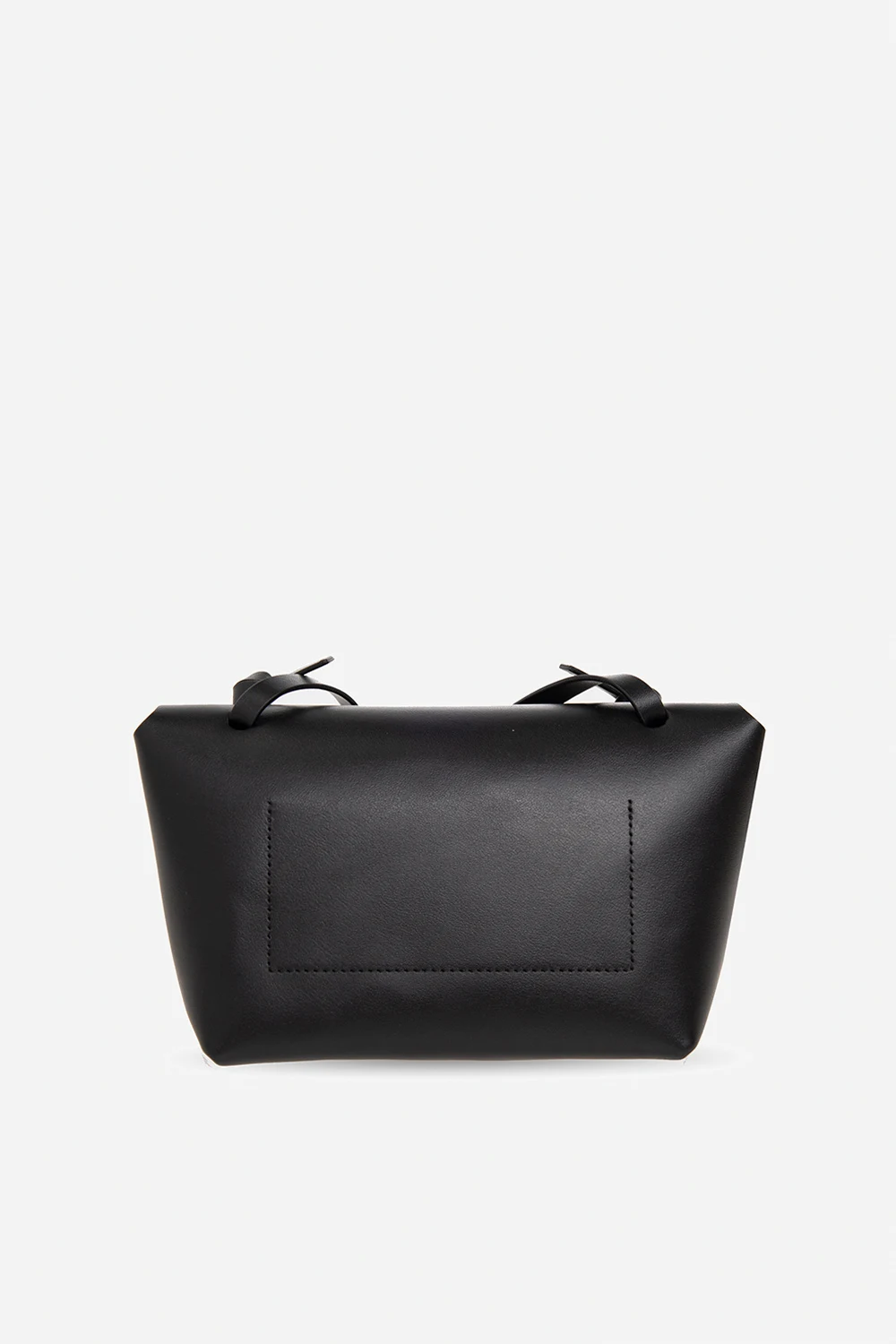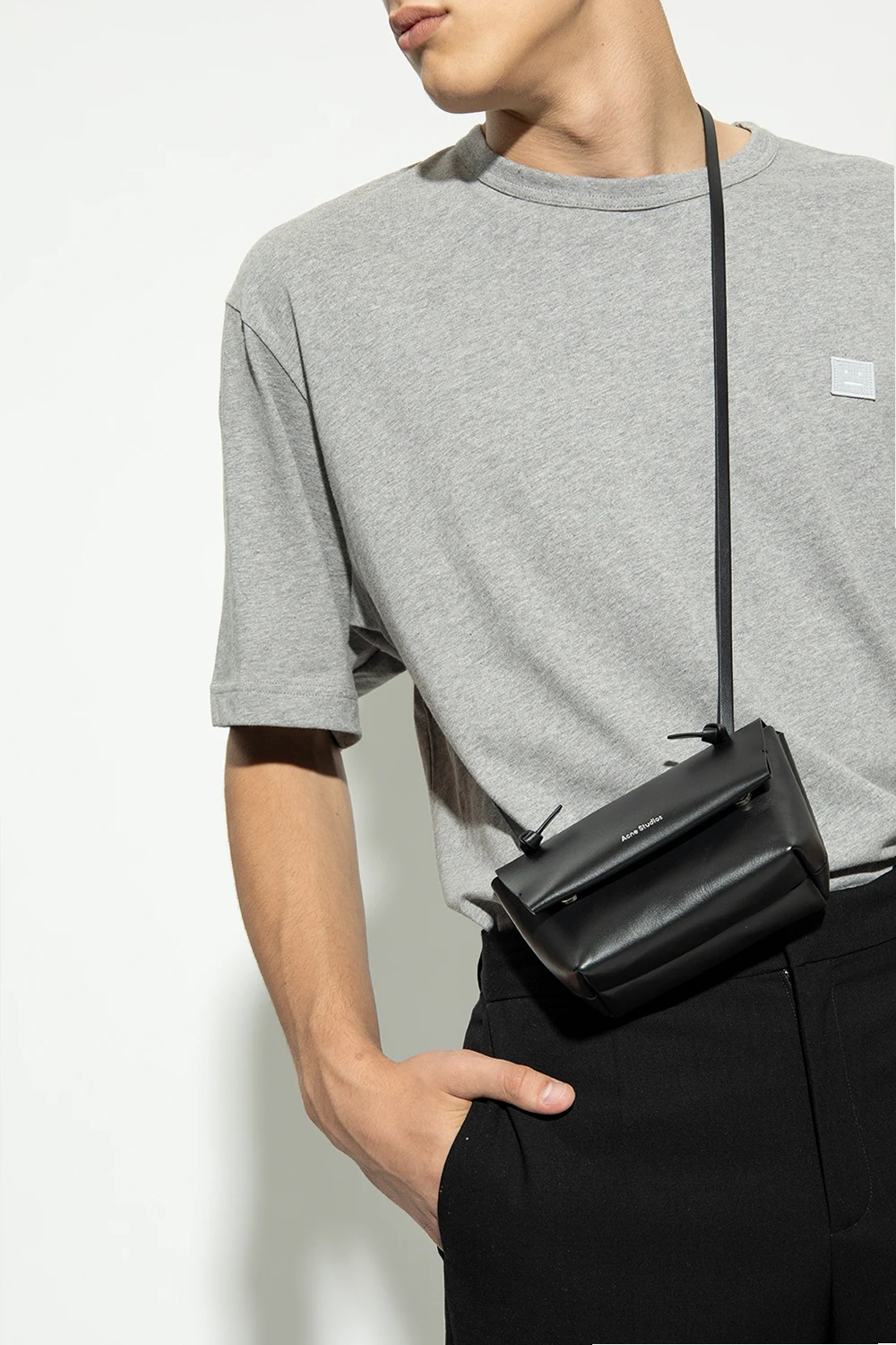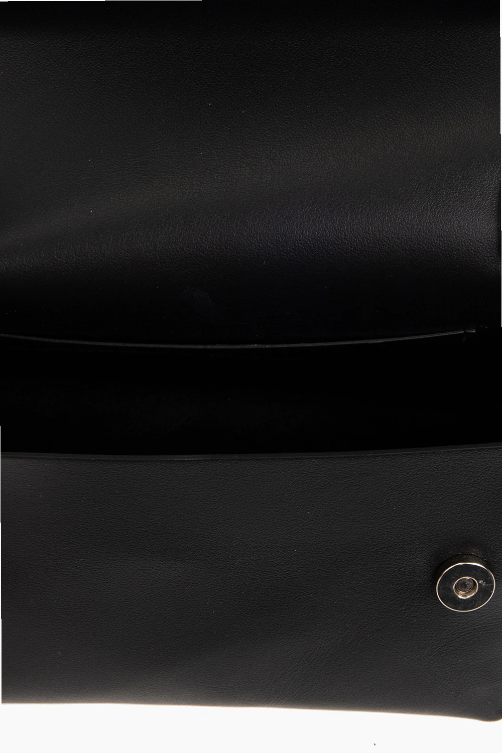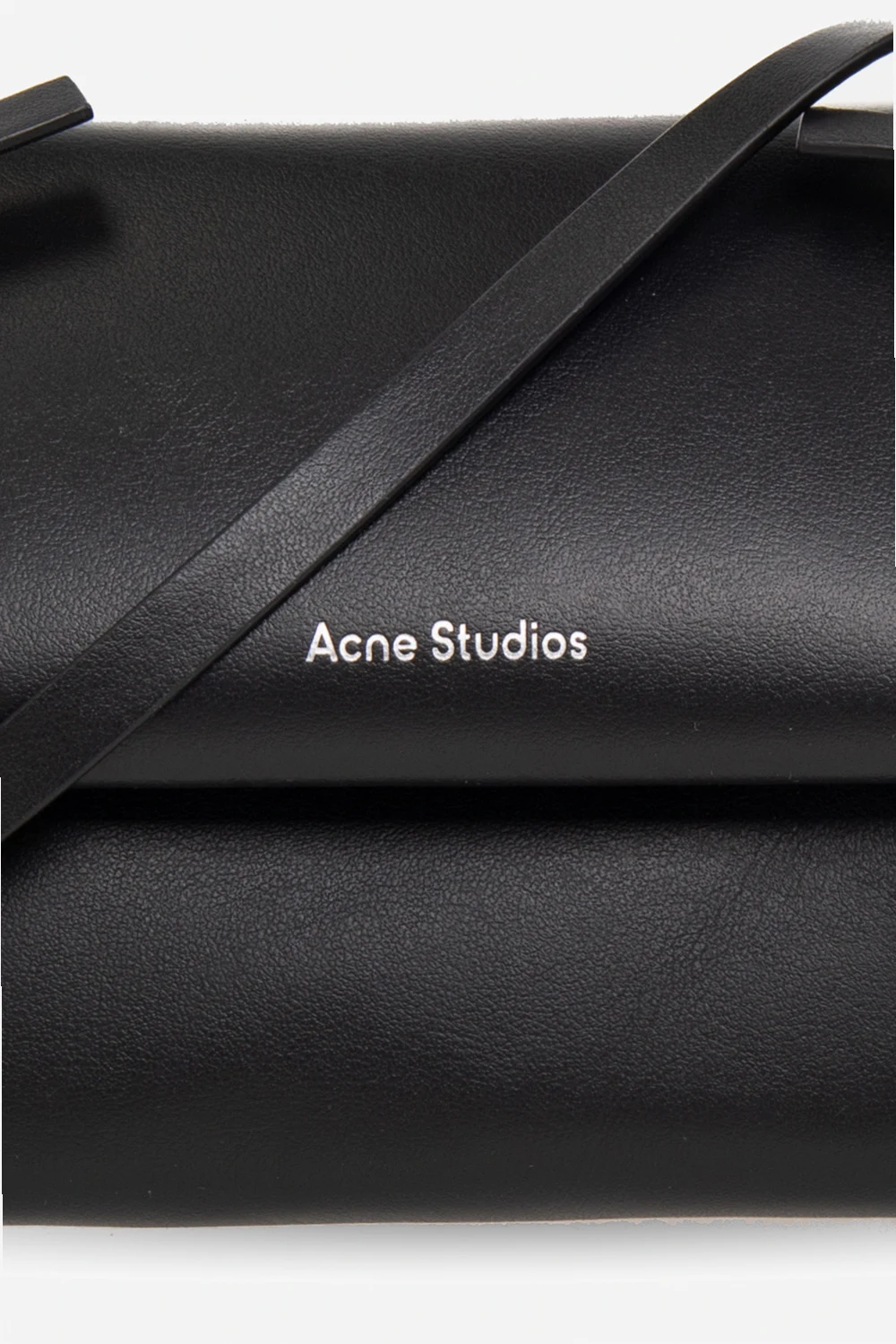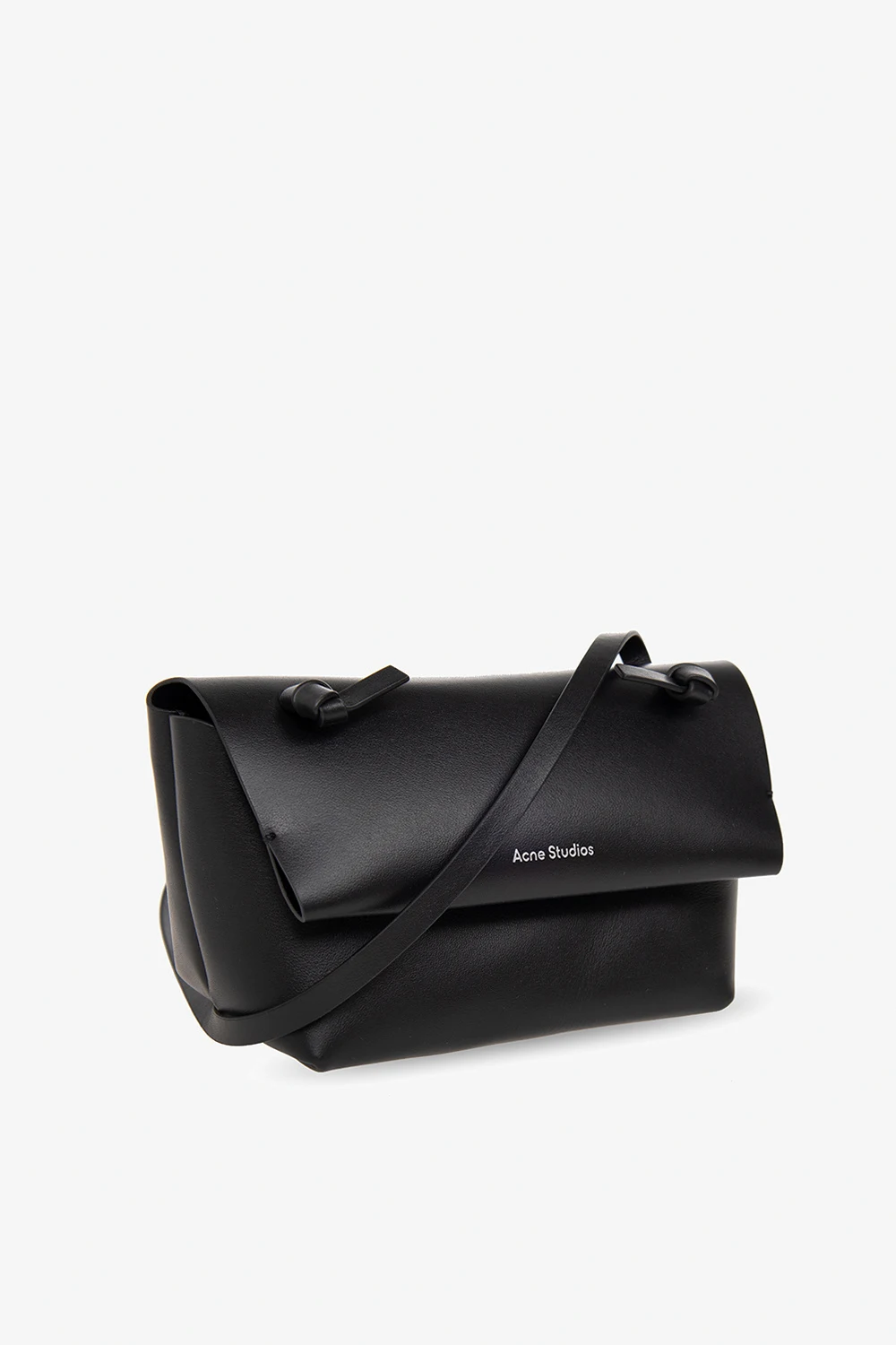 Black shoulder bag from Acne Studios. Made of leather, this model features a snap closure, silver-tone logo print, shoulder strap with knots, silver-tone metal hardware and one internal compartment with one slip pocket.