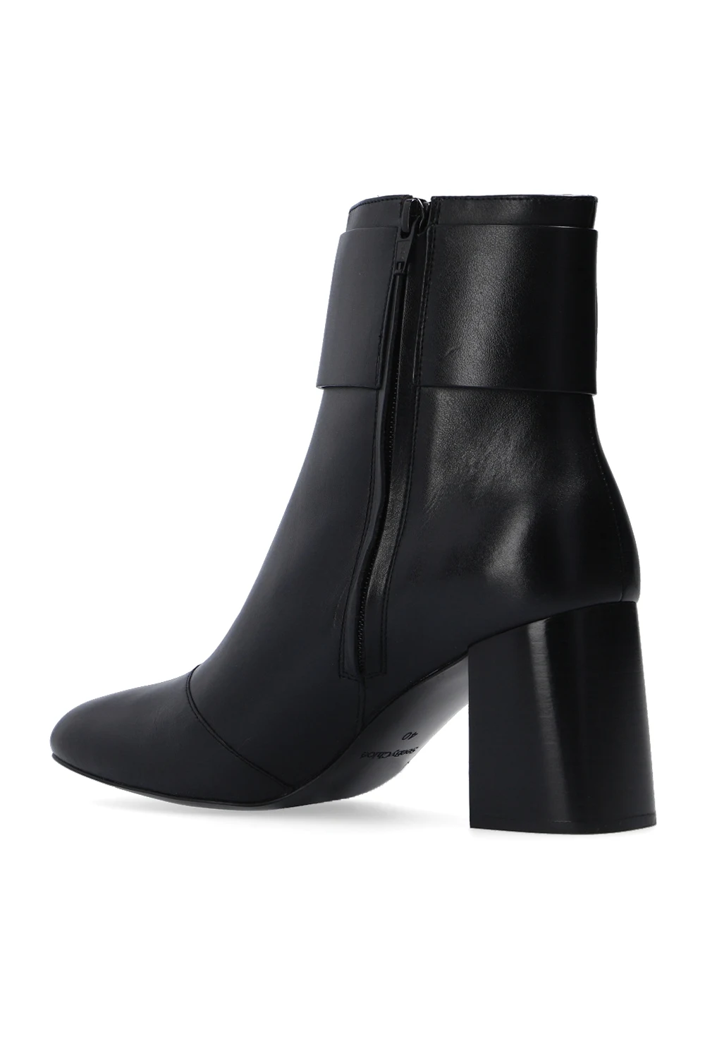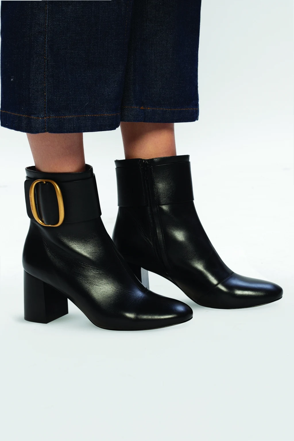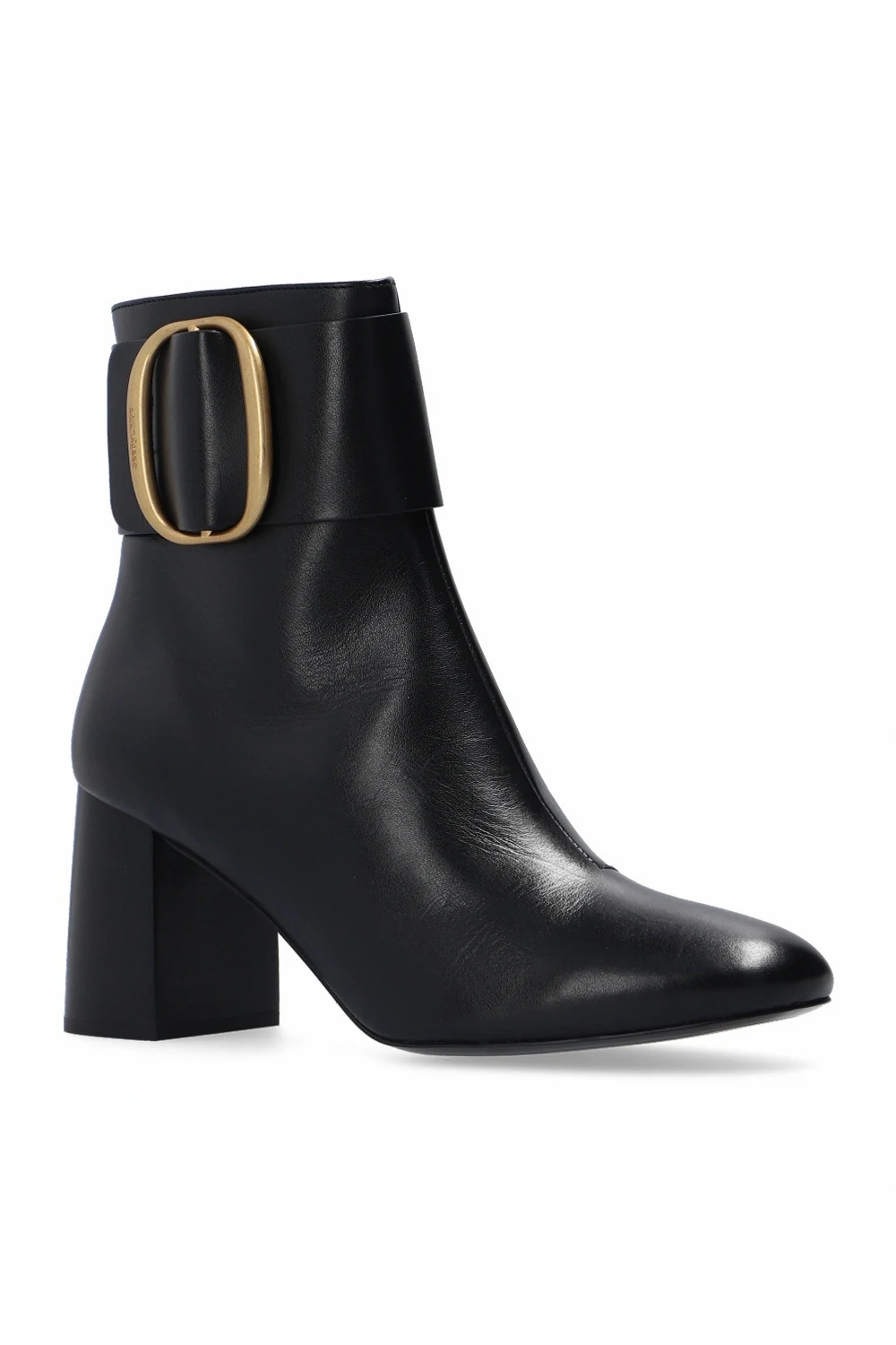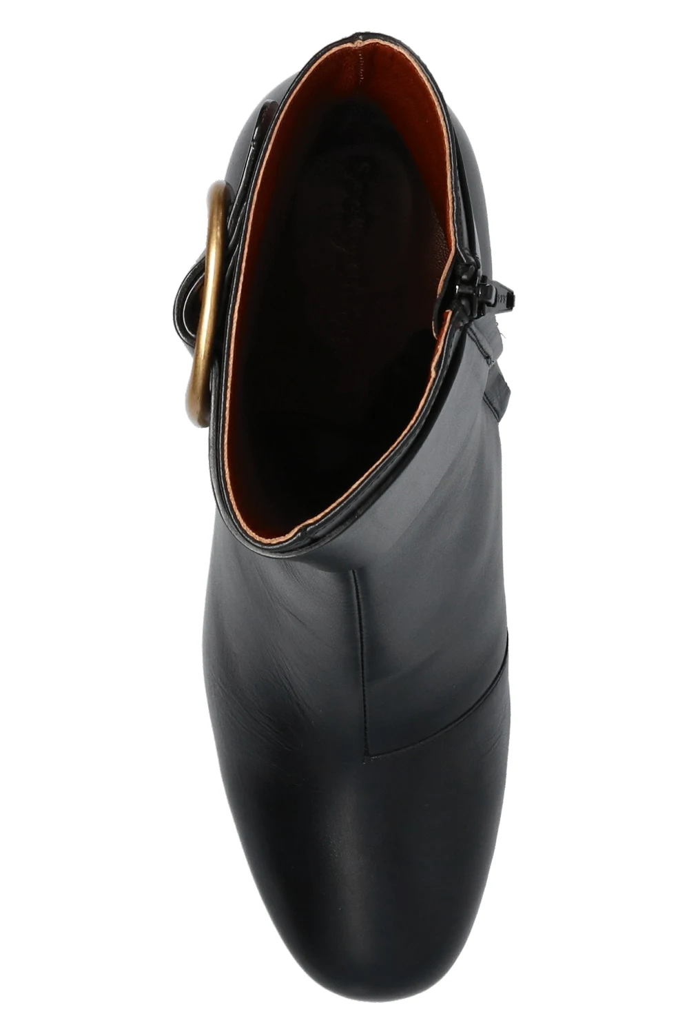 Black ‘Abby’ heeled ankle boots from See By Chloé. Crafted from calf leather, this item features a side zip, strap with a logo-embossed buckle in antiqued gold-tone and a black rubber sole.