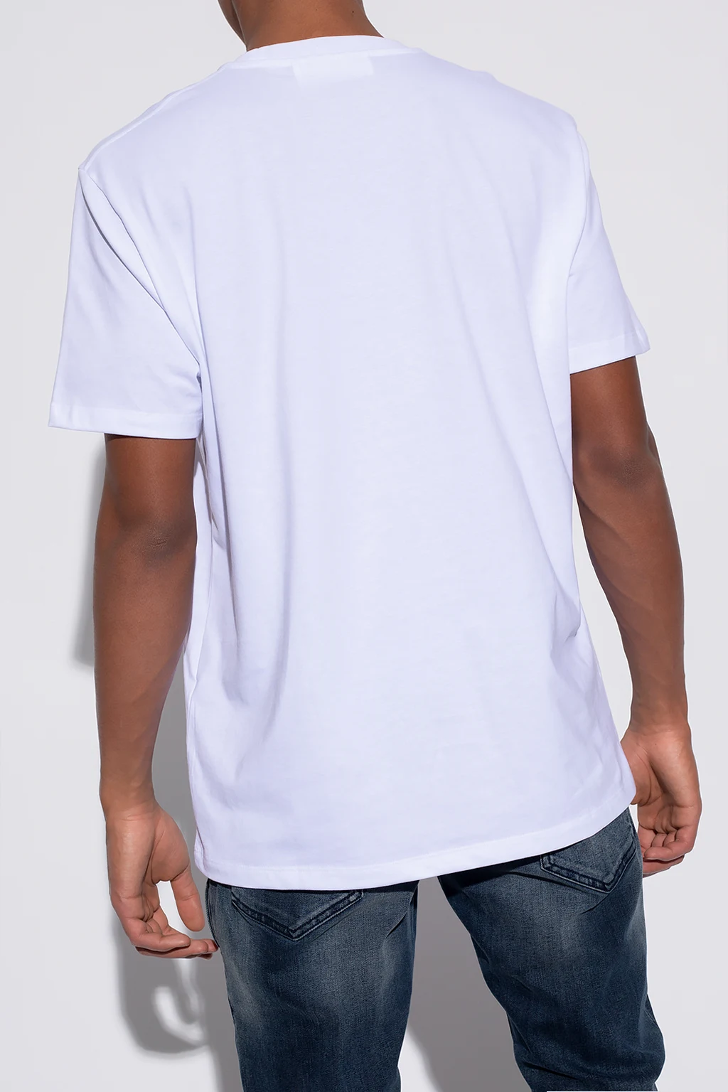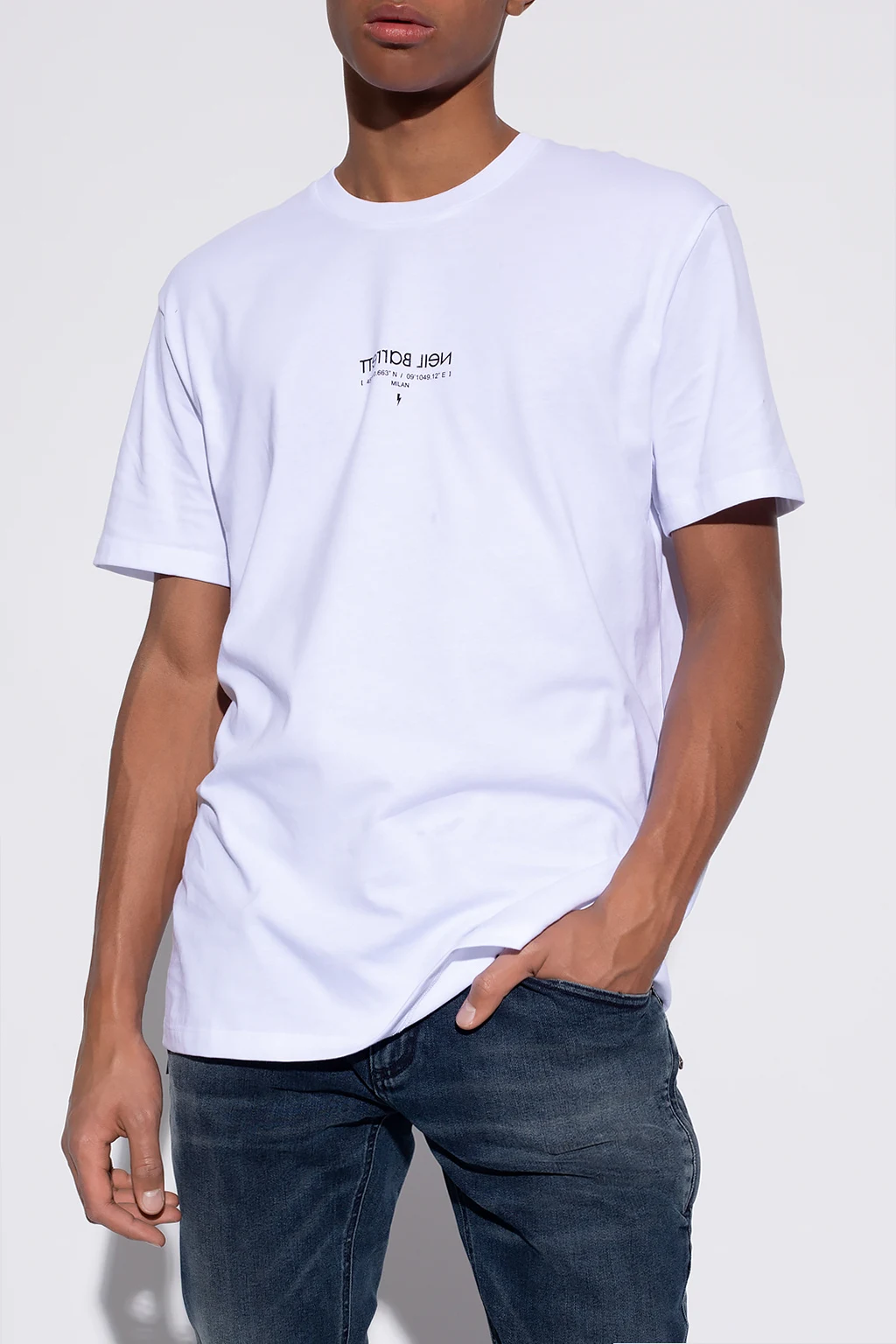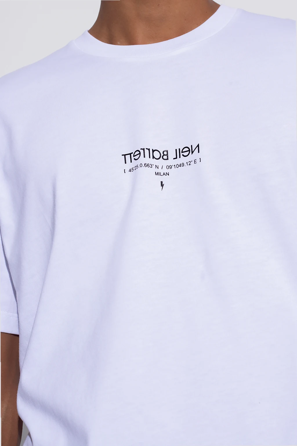 White crewneck T-shirt from Neil Barrett. Crafted from cotton, this style features short sleeves and a black graphic print with the designer's logo on the front.
