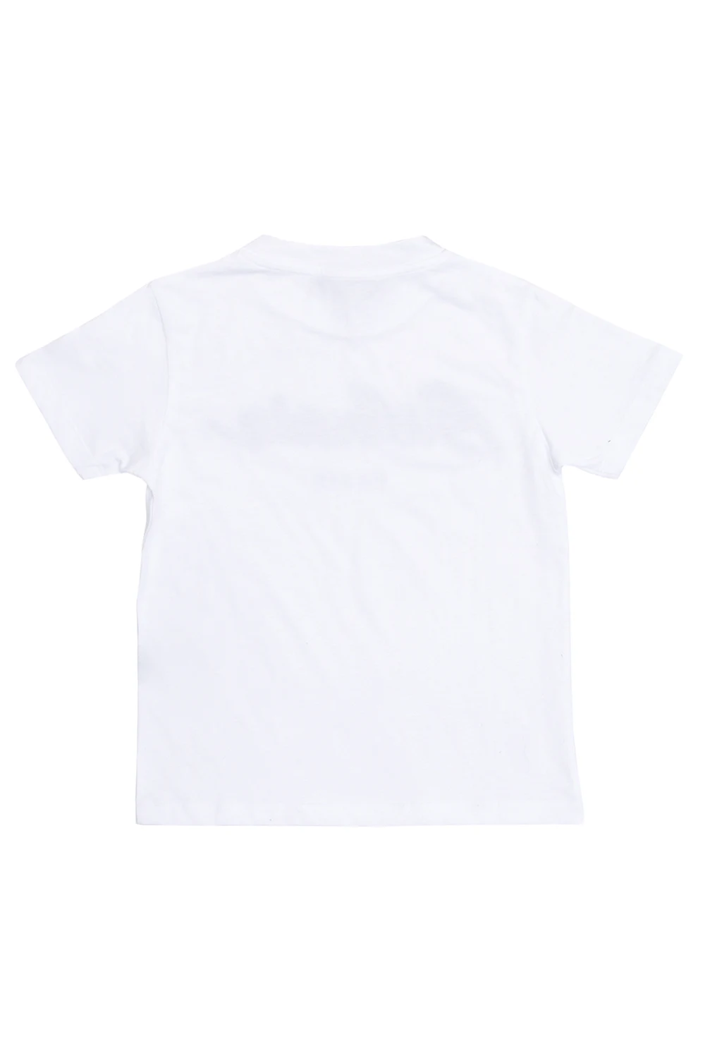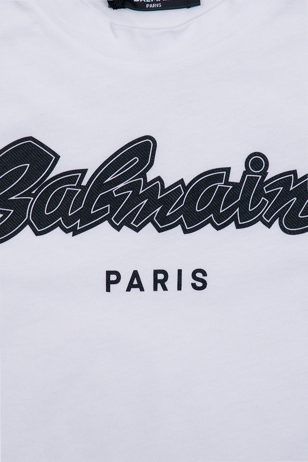 White crewneck T-shirt from Balmain Kids. Crafted from cotton, this style features a short sleeves, an elasticated collar and a black graphic print with the brand's logo.