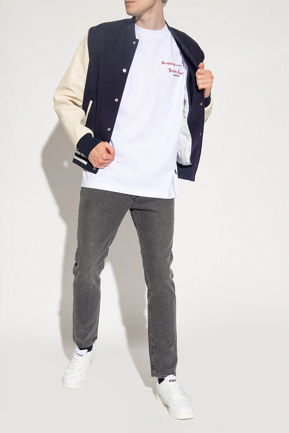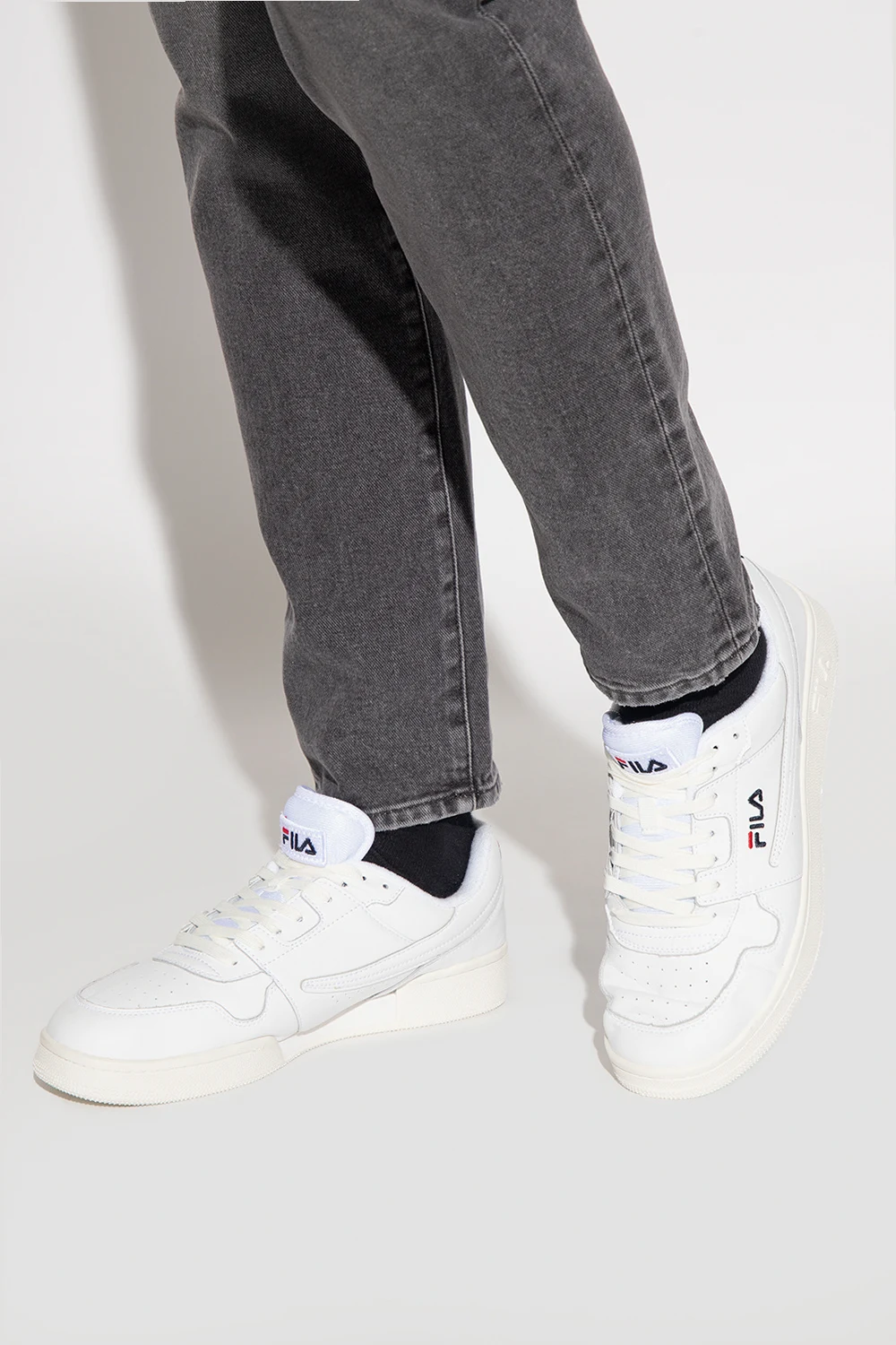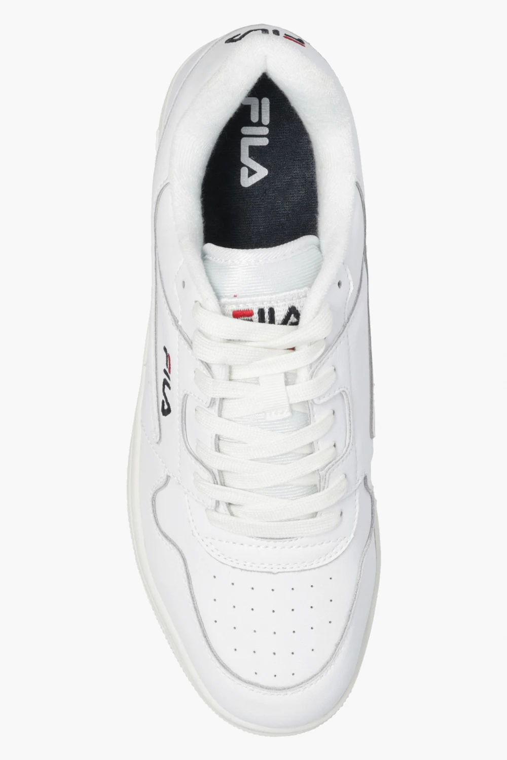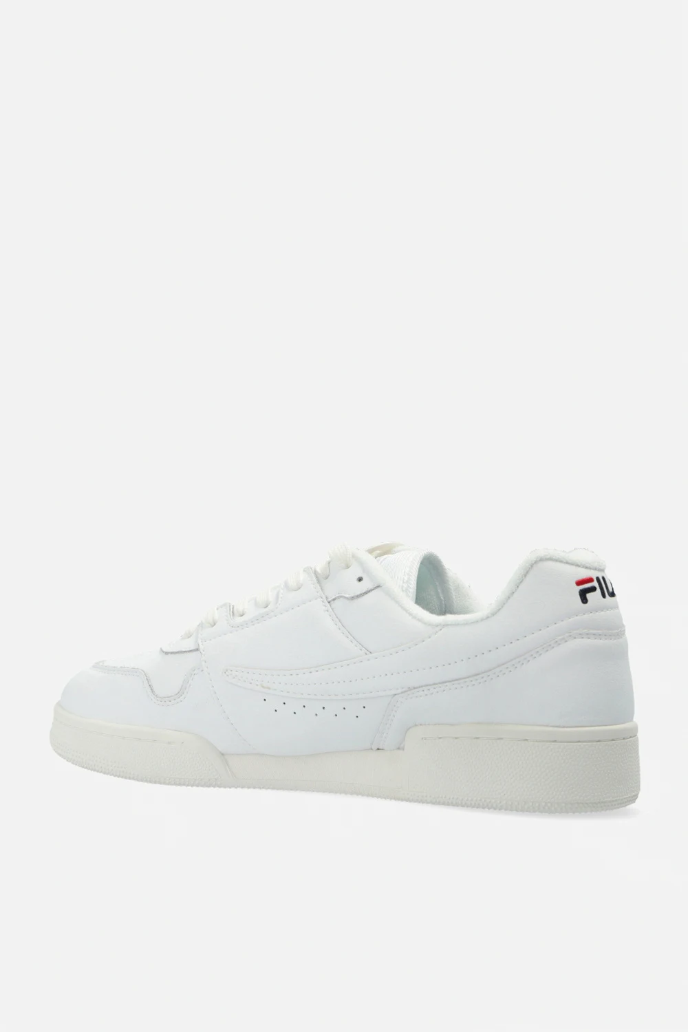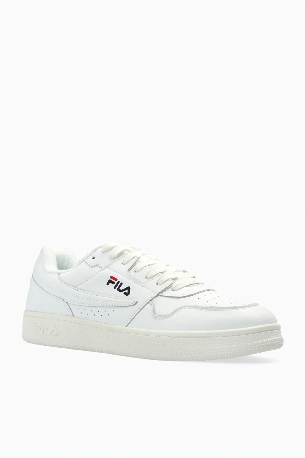 White ‘Arcade’ sneakers from Fila. Made of leather, this lace-up pair features perforations, black and navy logo embroidery and white rubber sole.