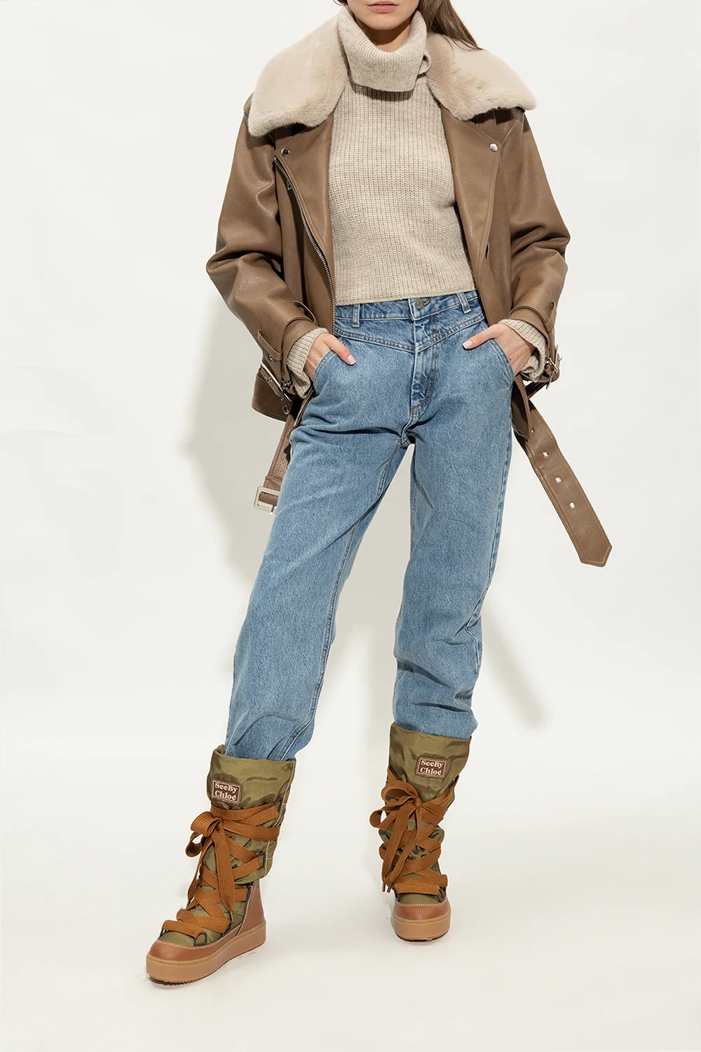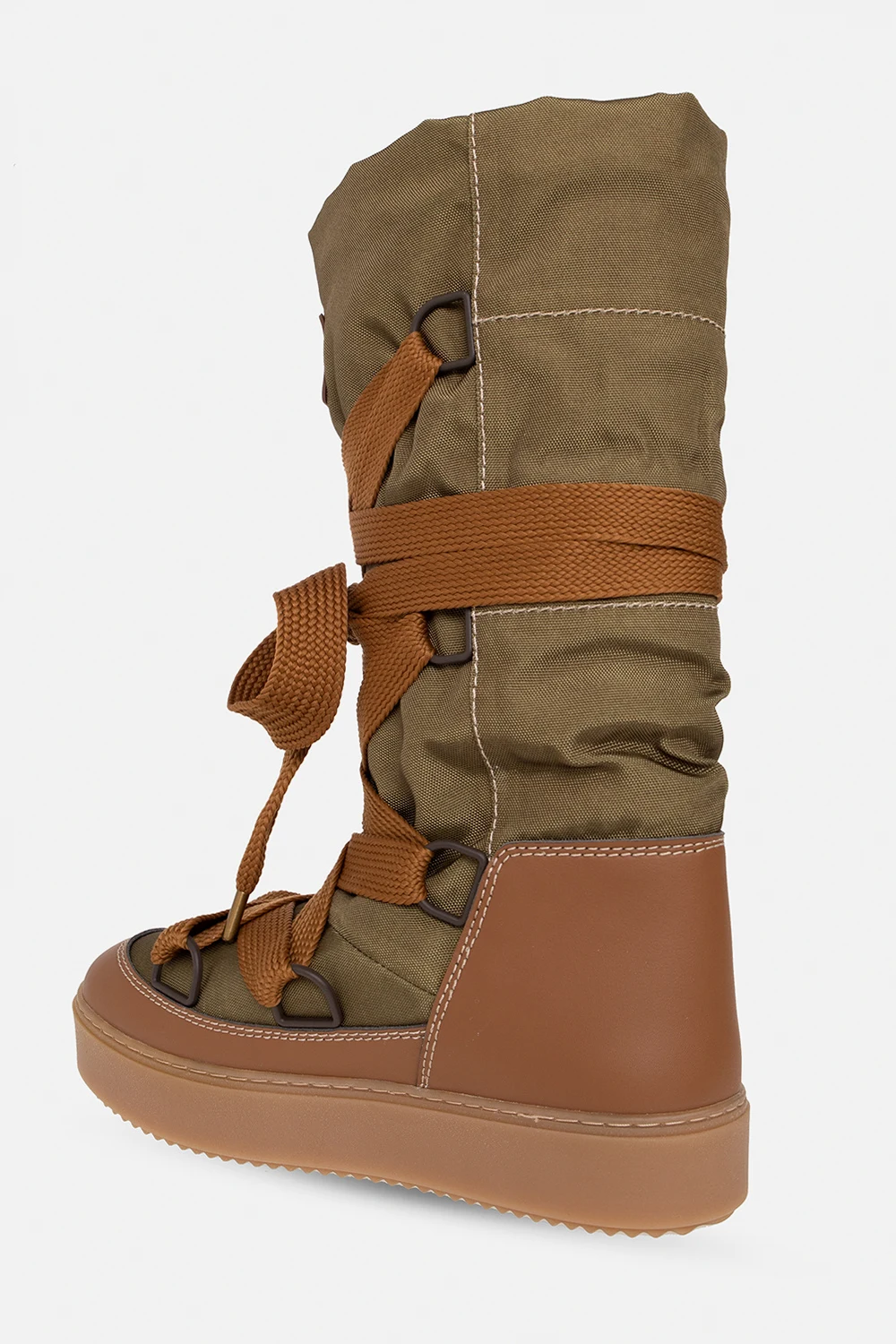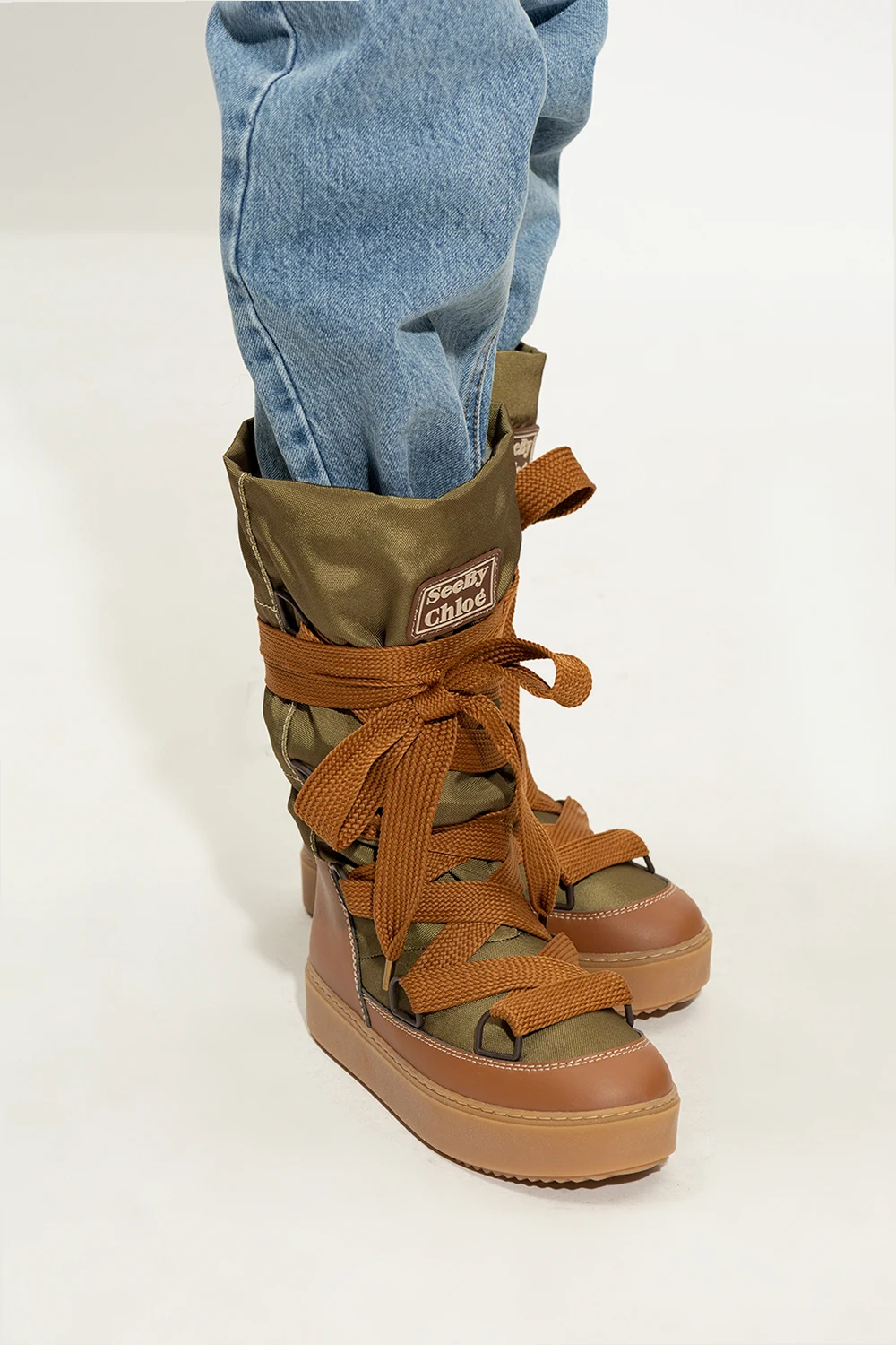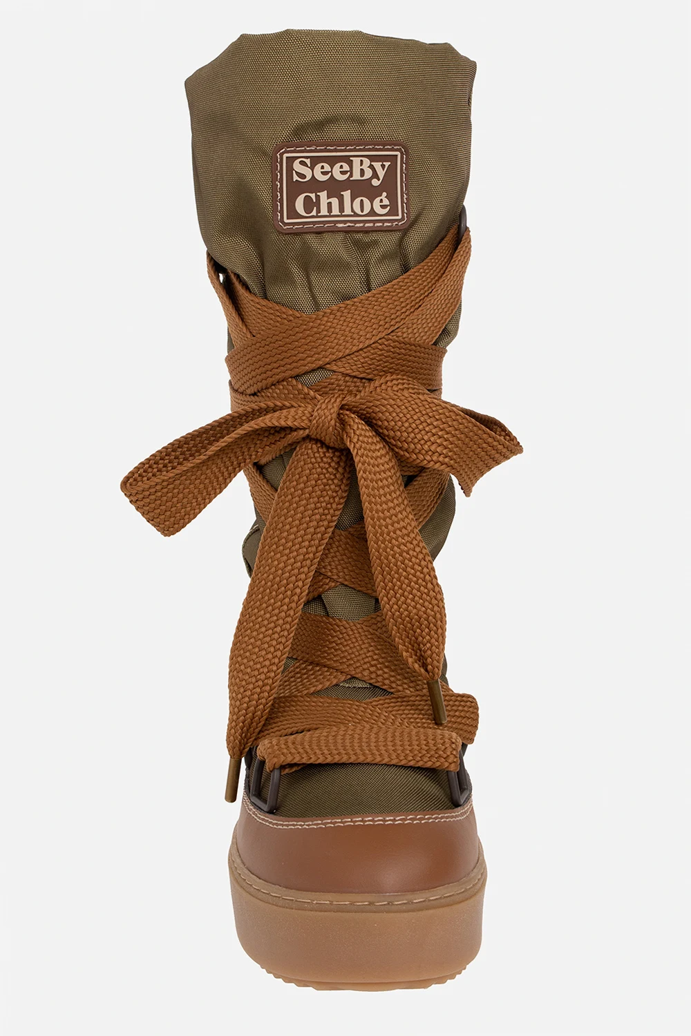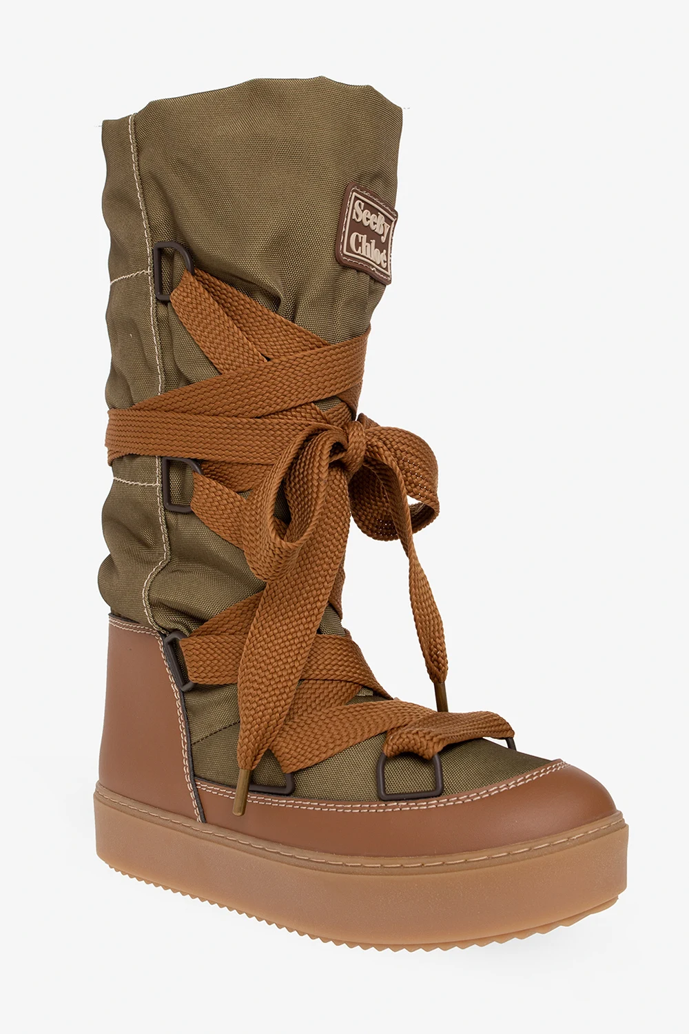 Green and brown ‘Naina’ snow boots from See By Chloe. Crafted from recycled polyester, this lace-up model sits on a beige rubber sole and features faux leather trimming, a faux fur lining and a logo patch on the front.