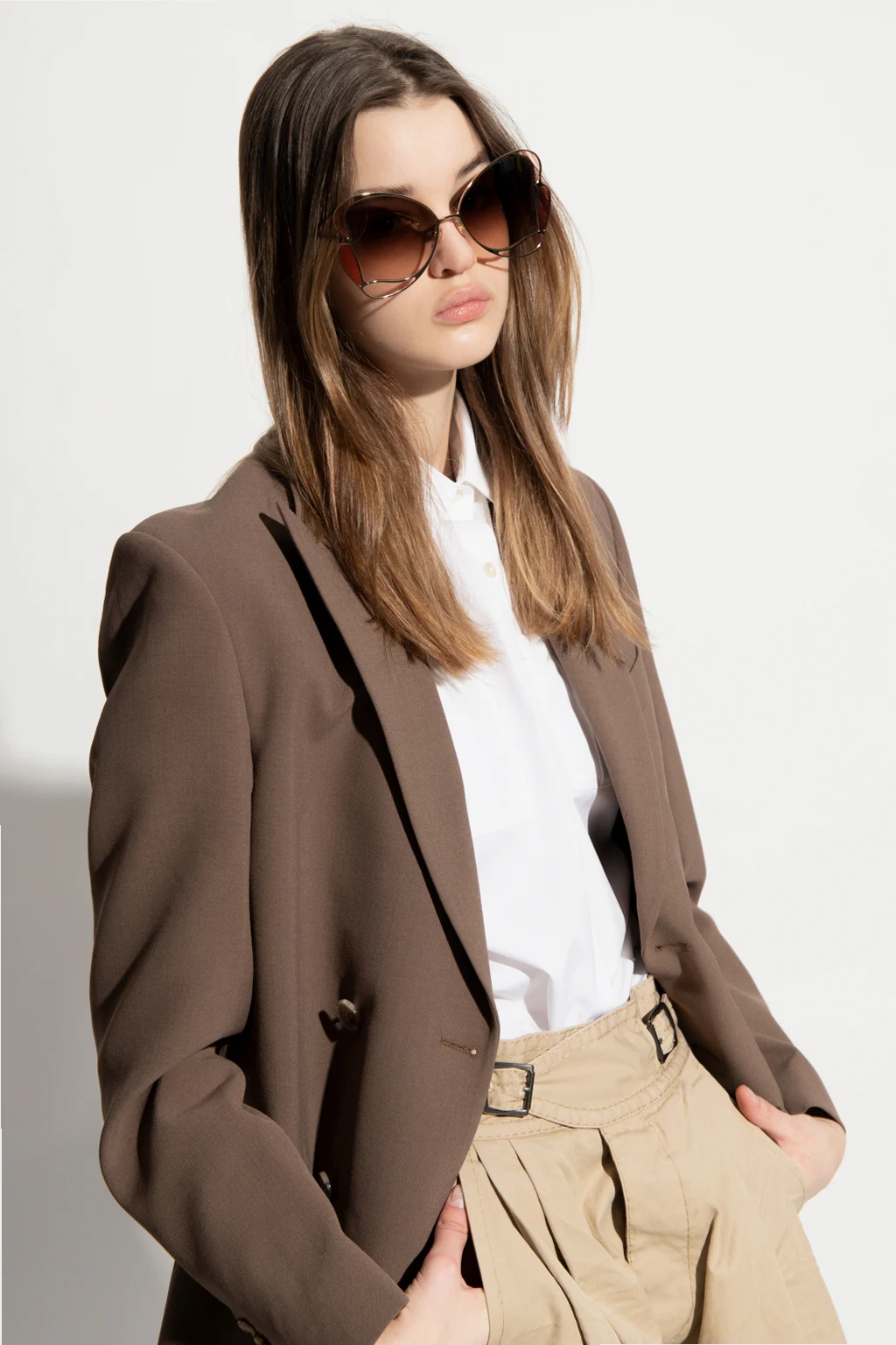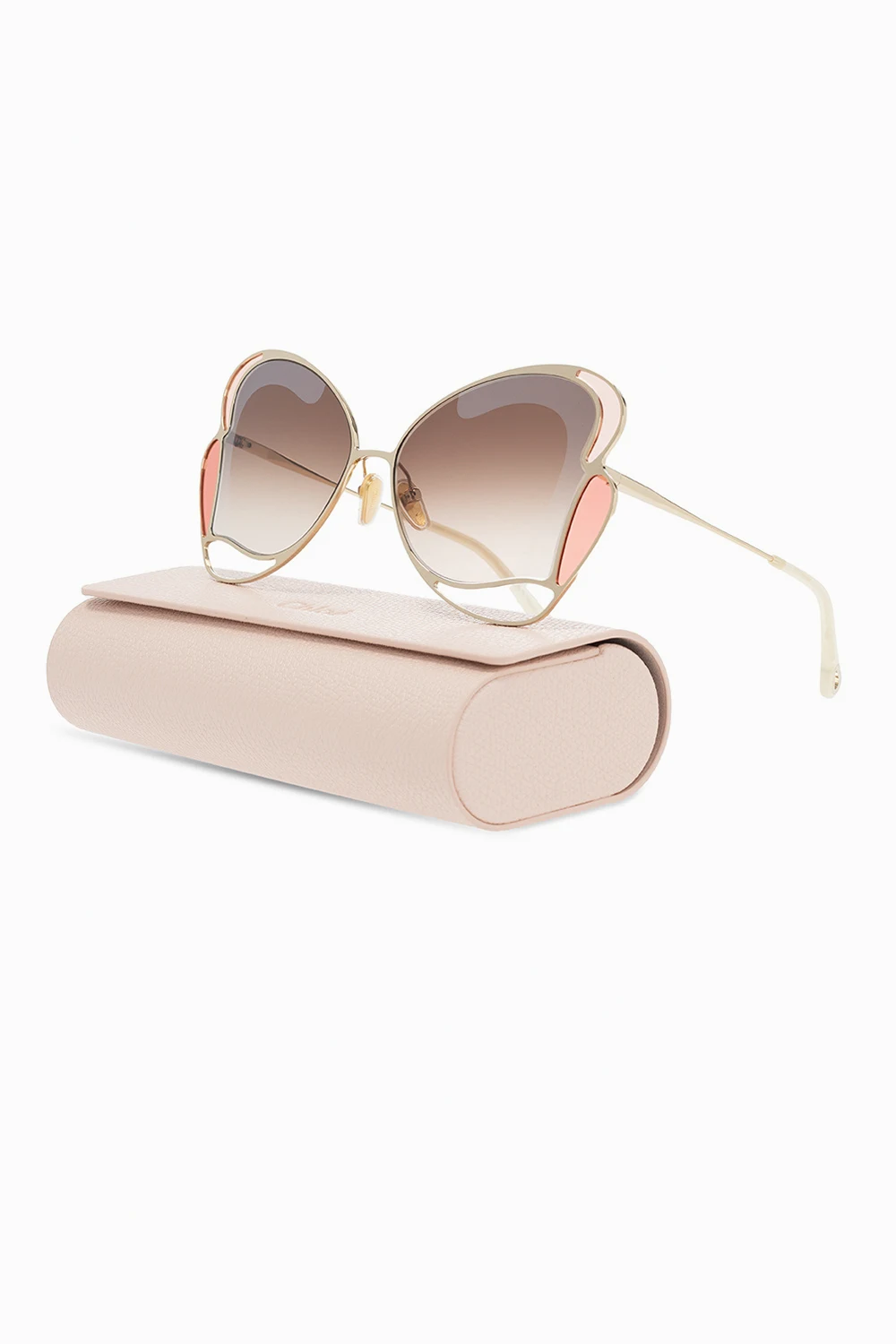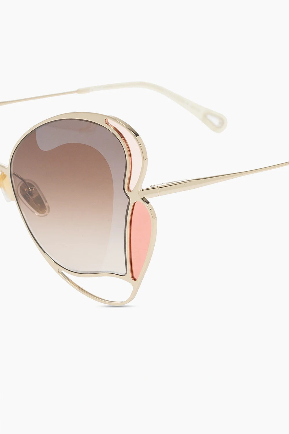 Gold-tone sunglasses from Chloé. Emblazoned with the brand's logo, this pair features decoratively shaped, certified brown lenses with UVA/UVB protection. It also comes with a pink protective case.