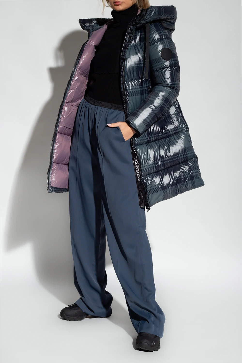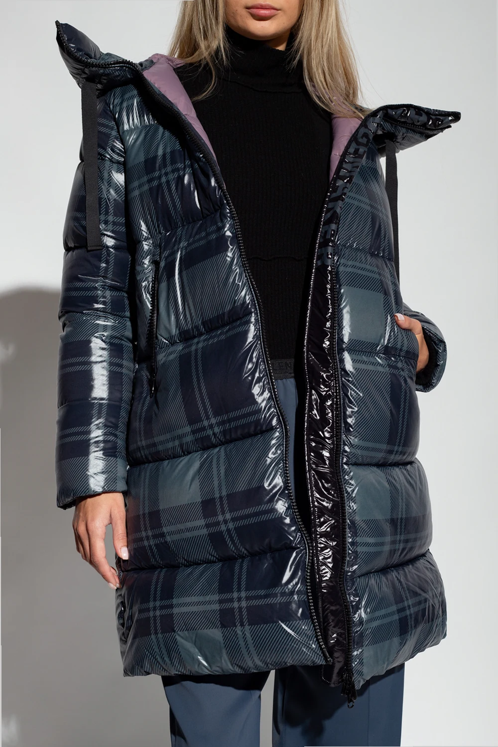 Navy and grey ‘Yvette’ quilted jacket from Save The Duck. Padded with synthetic Plumtech® down, this breathable, wind and water-resistant jacket is complete with a two-way zip, drawstring hood, check pattern, black rubber logo patch and two front zip pockets. Temperature range: from -10°C to 14°C.